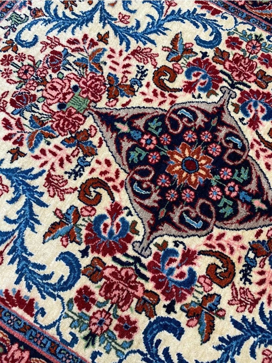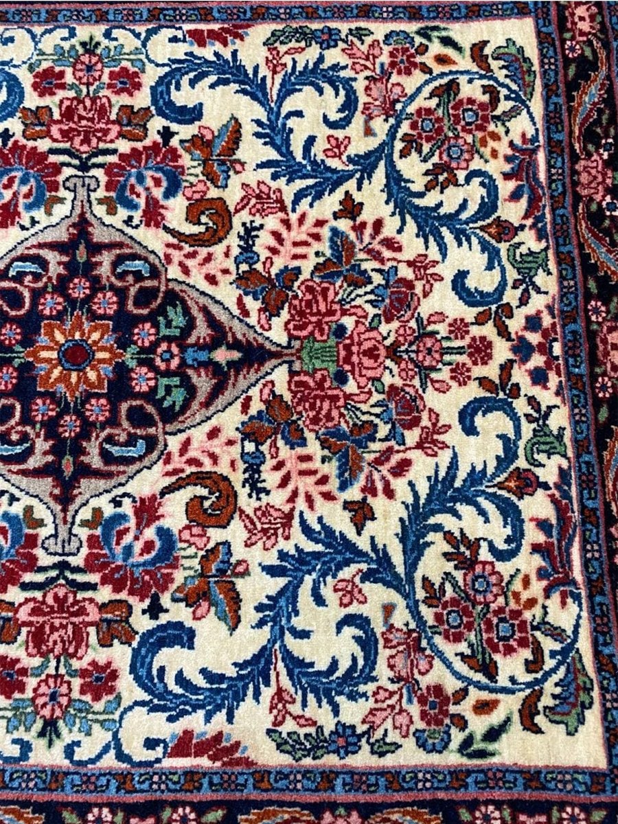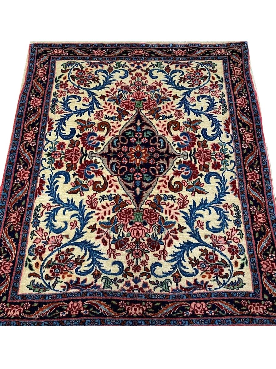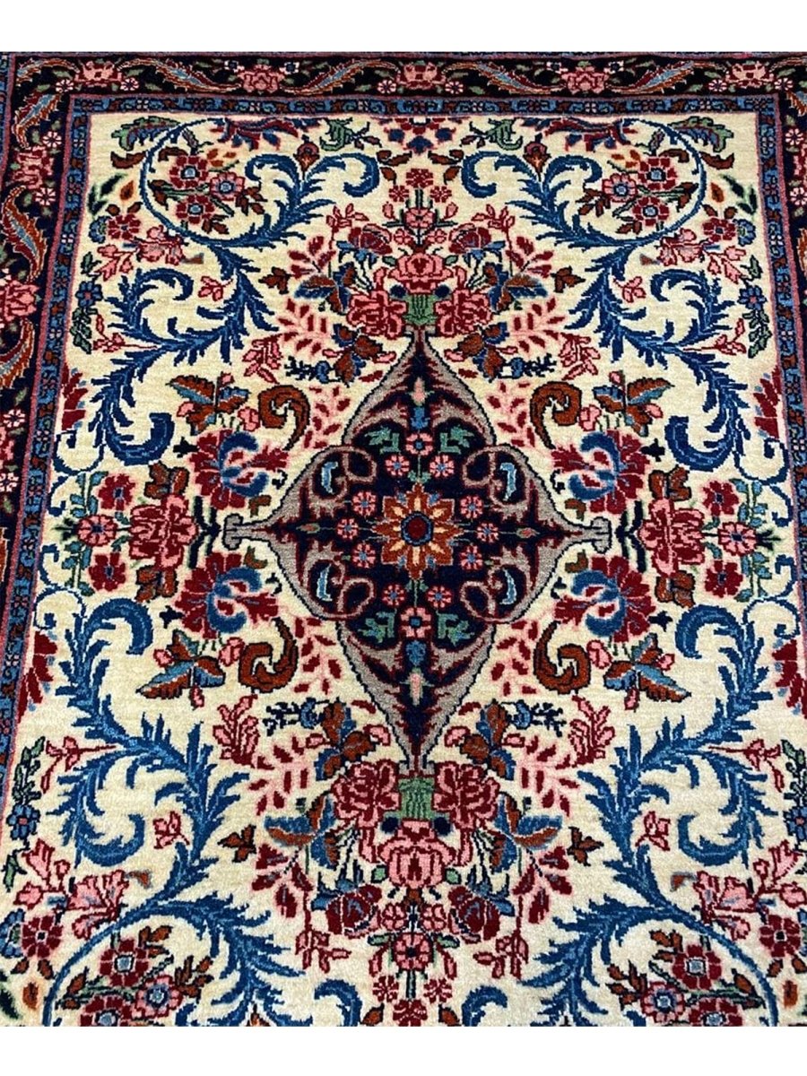 Hand-knotted in Persia with a sturdy weave, this beautiful 2x3 Old Persian Bijar rug offers lasting beauty and artistry. The bold medallion floral pattern is detailed, showcasing its main colors. Crafted from durable wool, this rug features an ivory field with patterns primarily in red and blue. Its small size and classic design make it a perfect accent piece for entryways, beside a chair, or layered in a room. This antique rug brings traditional charm and resilience to any small space. Enjoy the convenience of free US shipping.
