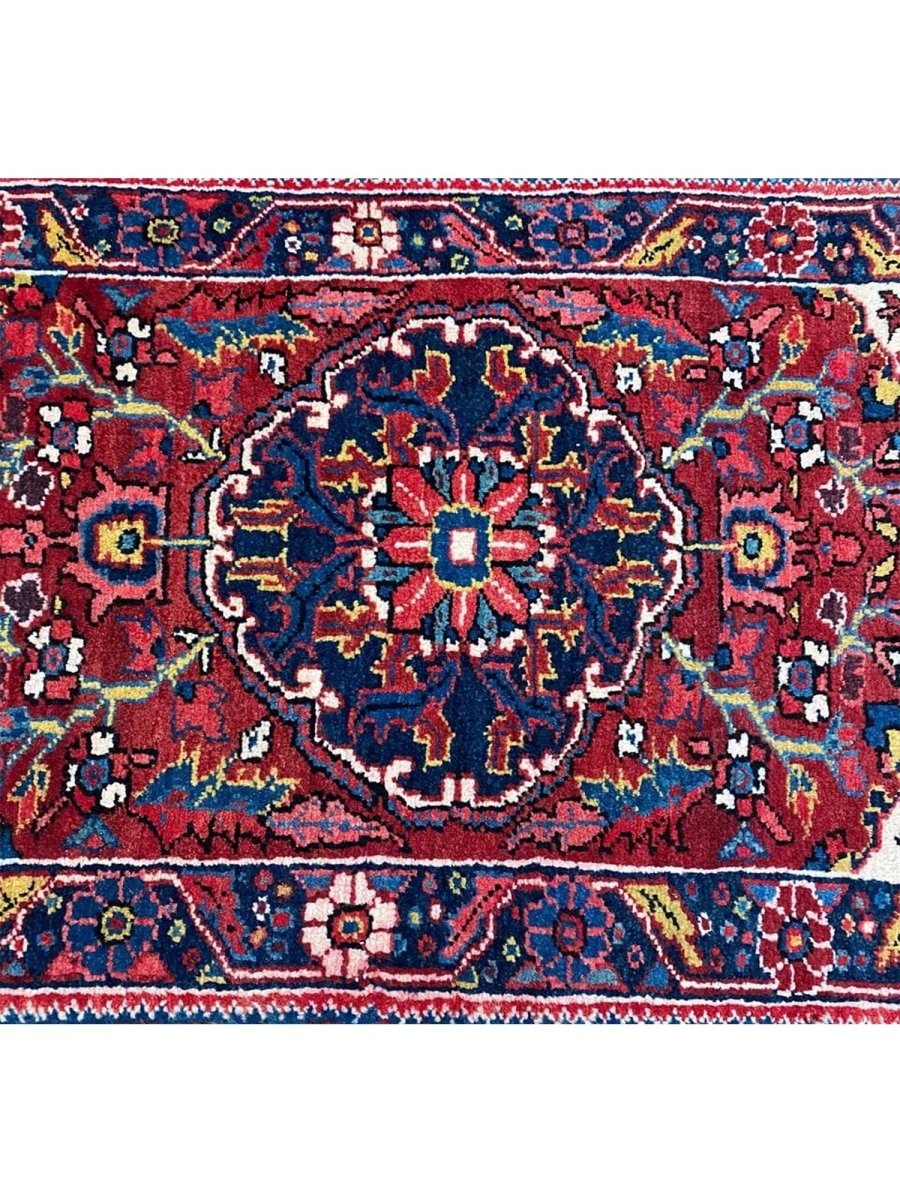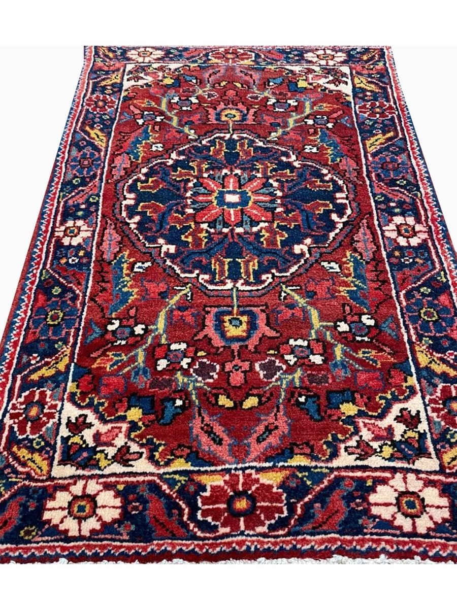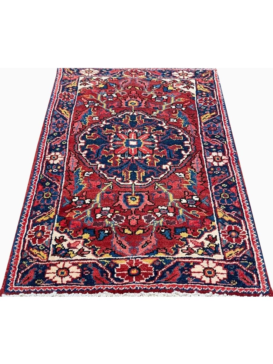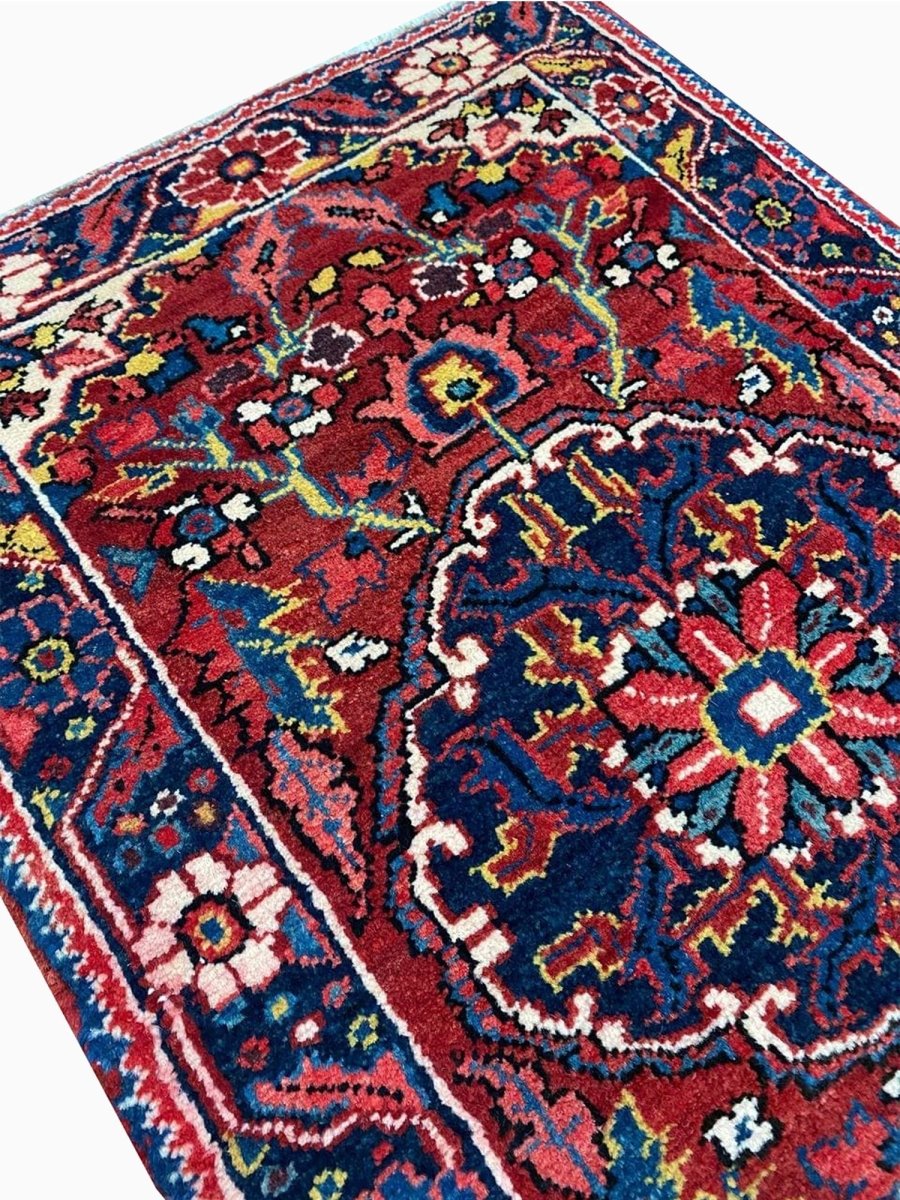 Bring classic style home with this charming 2x3 Old Persian Heriz rug. Hand-knotted in Persia from durable wool, it showcases the iconic medallion pattern. Rich deep reds fill the field and border, framing a striking dark blue and cream medallion with vibrant accents. This versatile size is perfect for entryways, bedside comfort, in front of a favorite chair, or by a kitchen sink. Its rugged build ensures it lasts. Add a small piece of art and history, brightening little spaces with its traditional beauty and character. A durable, lovely wool rug. We also offer free and fast delivery within the US.