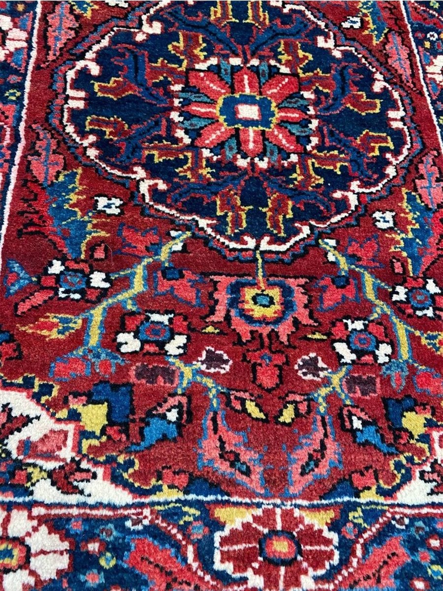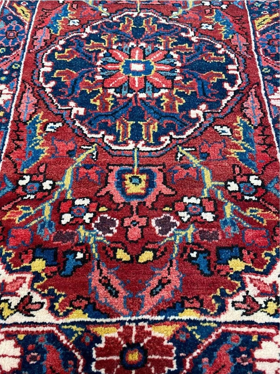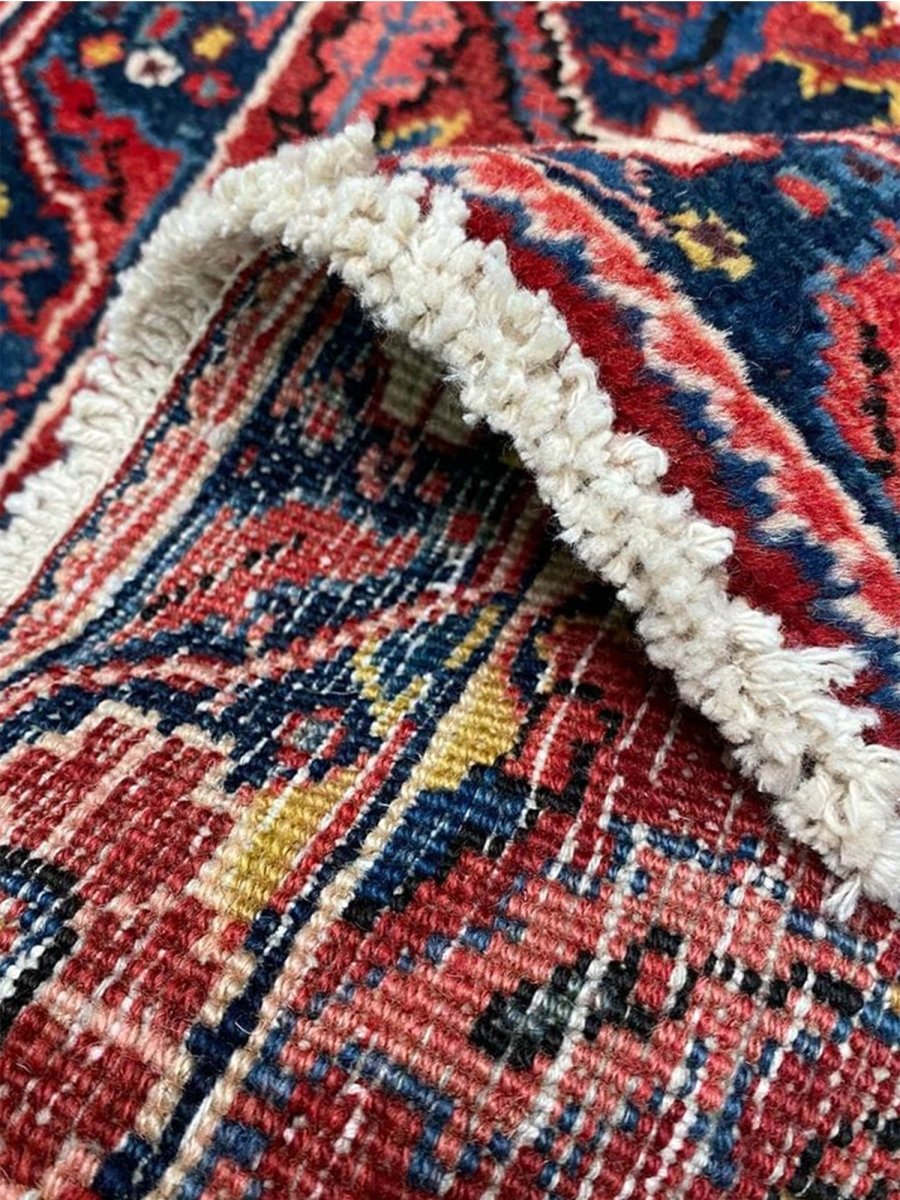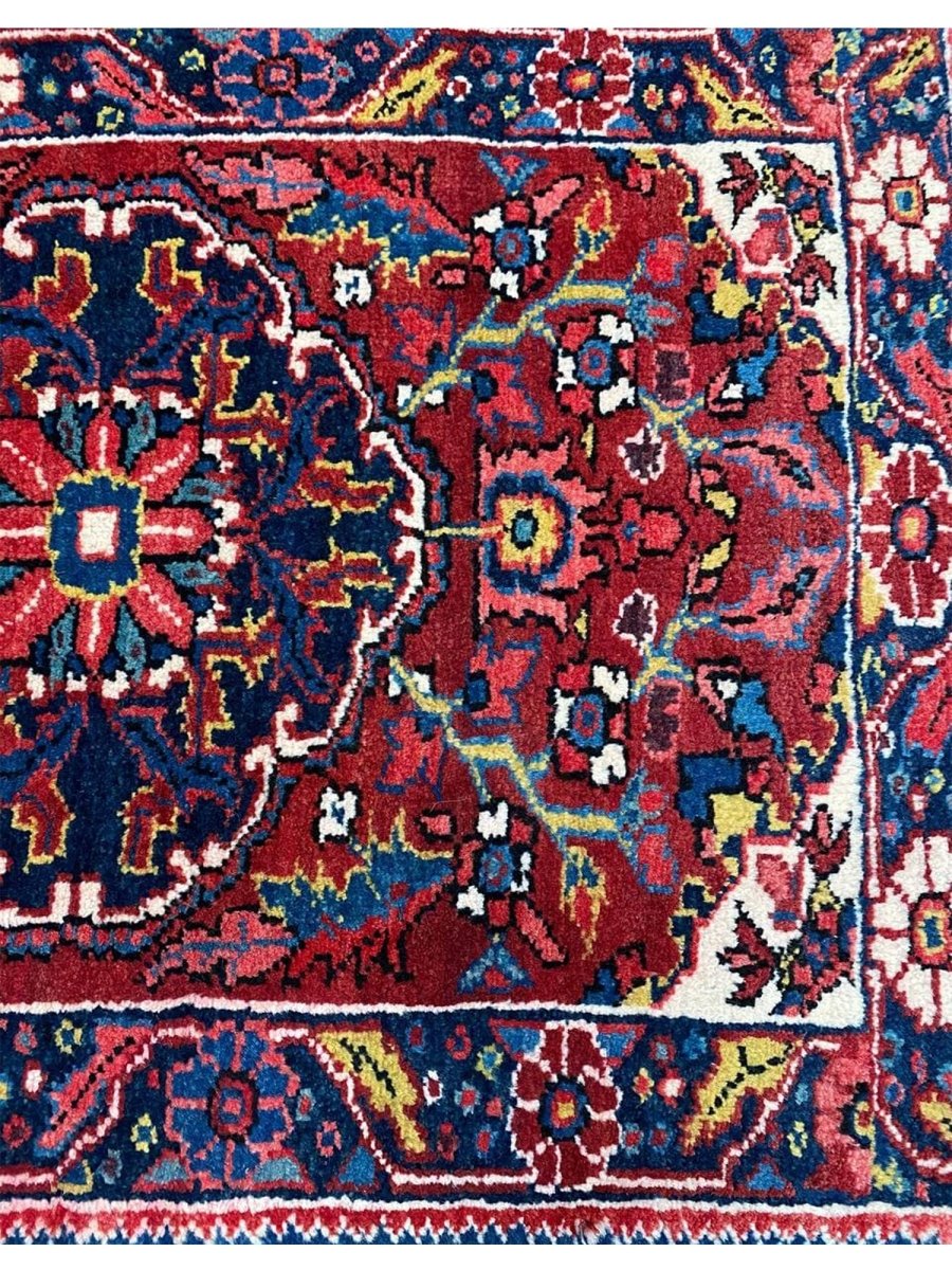 Bring classic style home with this charming 2x3 Old Persian Heriz rug. Hand-knotted in Persia from durable wool, it showcases the iconic medallion pattern. Rich deep reds fill the field and border, framing a striking dark blue and cream medallion with vibrant accents. This versatile size is perfect for entryways, bedside comfort, in front of a favorite chair, or by a kitchen sink. Its rugged build ensures it lasts. Add a small piece of art and history, brightening little spaces with its traditional beauty and character. A durable, lovely wool rug. We also offer free and fast delivery within the US.