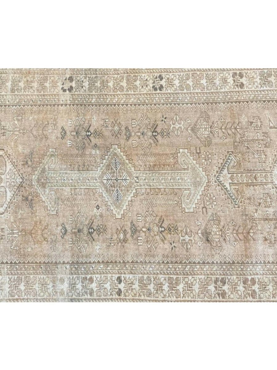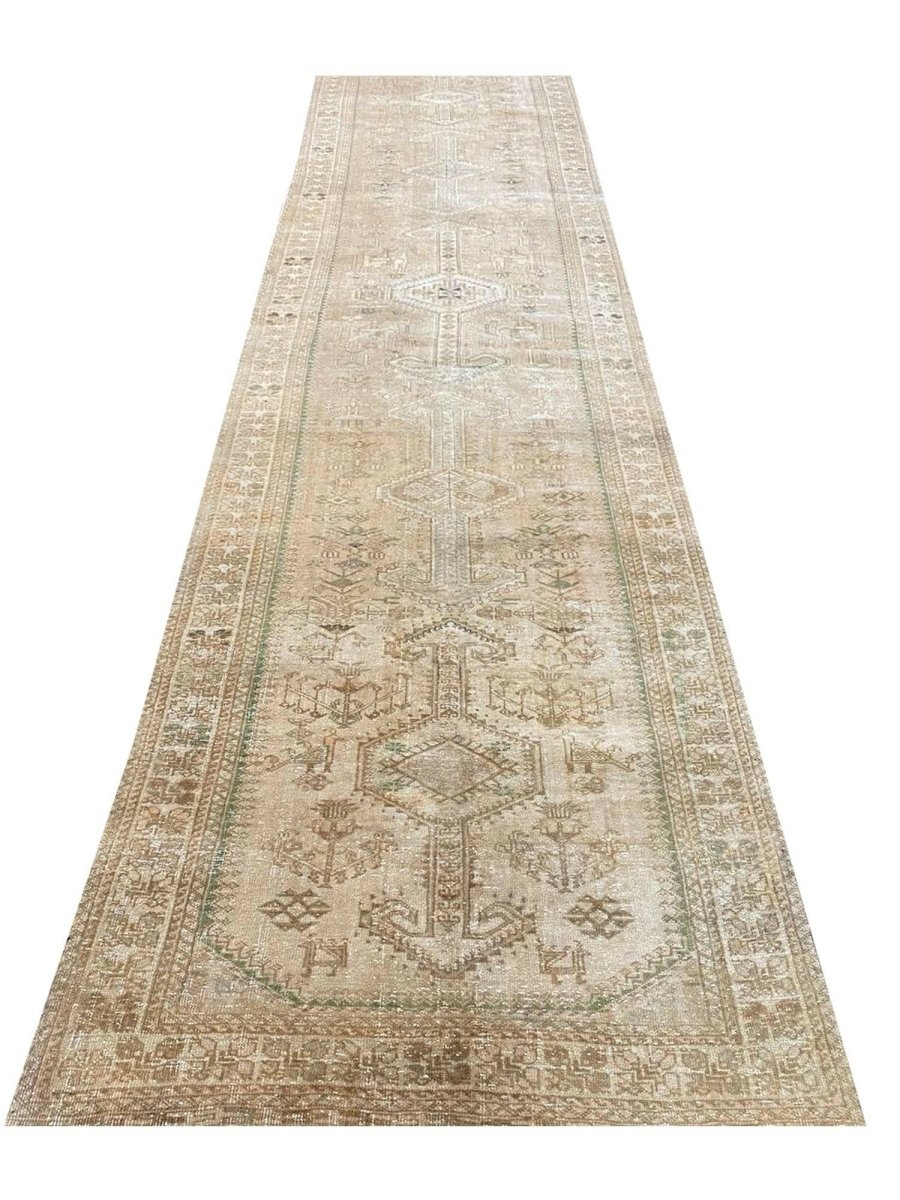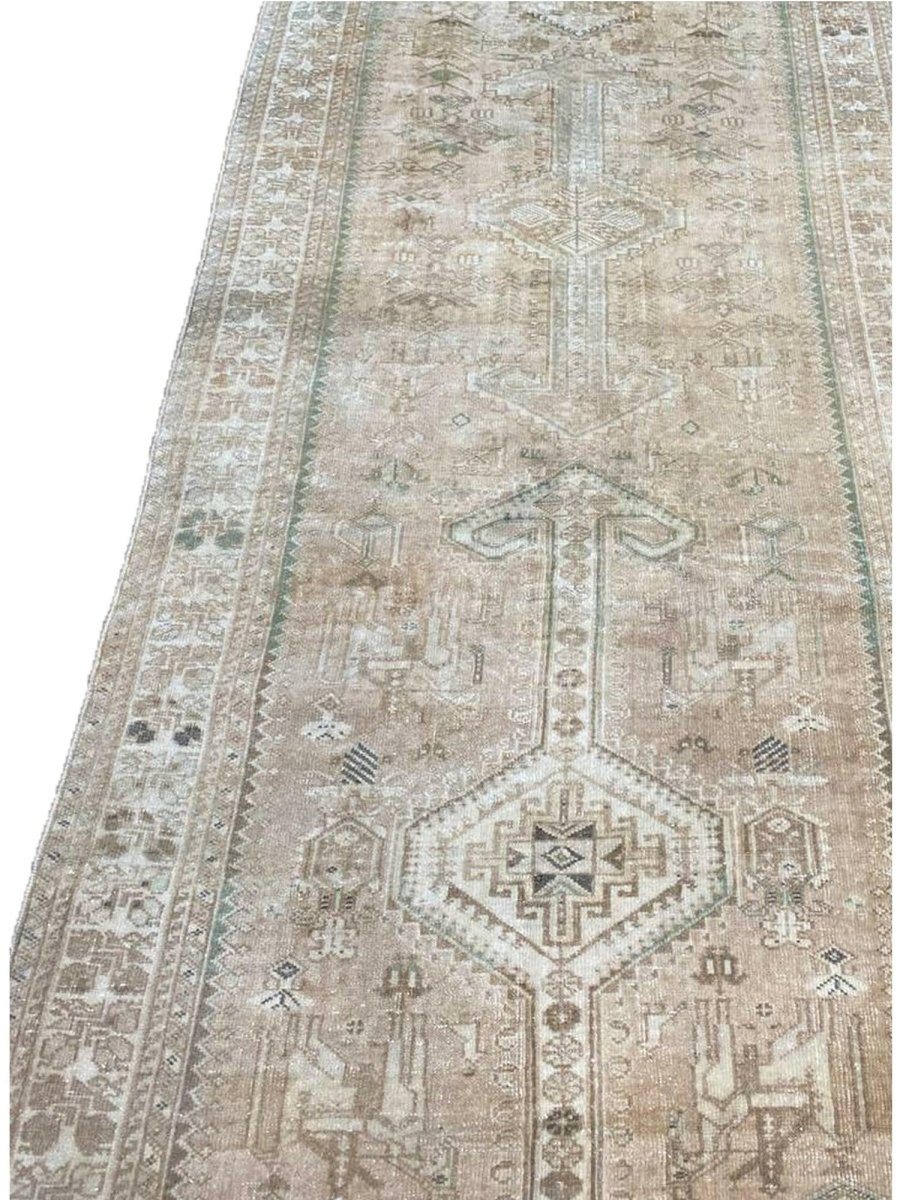 Add a touch of elegant style to your home with this 4x14 Old Persian Shiraz Style Runner Rug, crafted in Persia. This rug features a captivating geometric pattern with medallions, showcasing traditional motifs in a soft light beige, muted green, and light brown-gray palette. Crafted from durable wool ensures longevity, perfect for hallways, entryways, or narrow spaces. The intricate detail reflects skilled craftsmanship and timeless design heritage. This piece effortlessly enhances, adding warmth, consistency, and style. A true blend of artistry and function, it easily brings heritage charm into any space. Enjoy the benefit of free shipping across the United States. Each rug has one-of-a-kind subtle variations inherent to its creation.