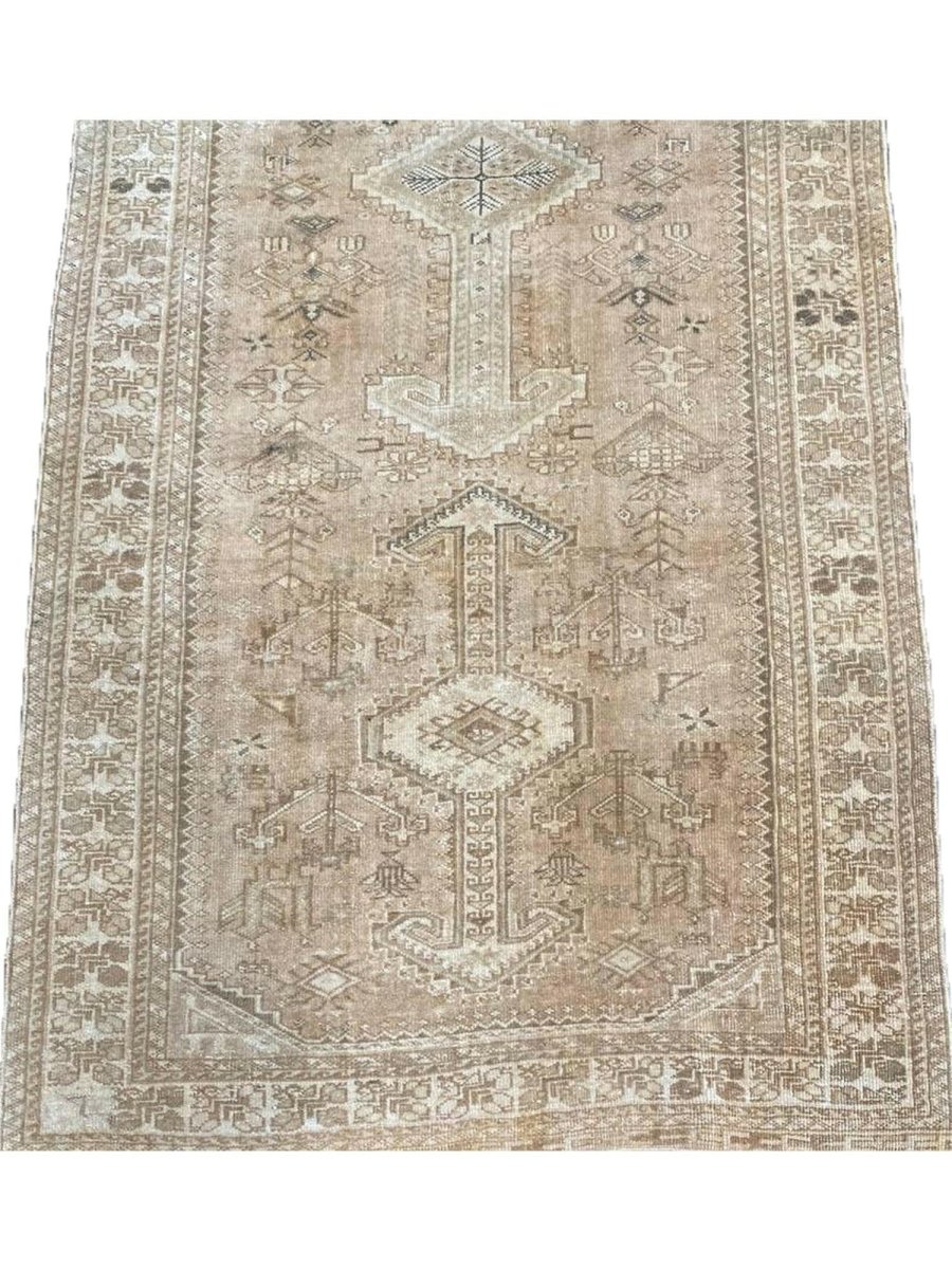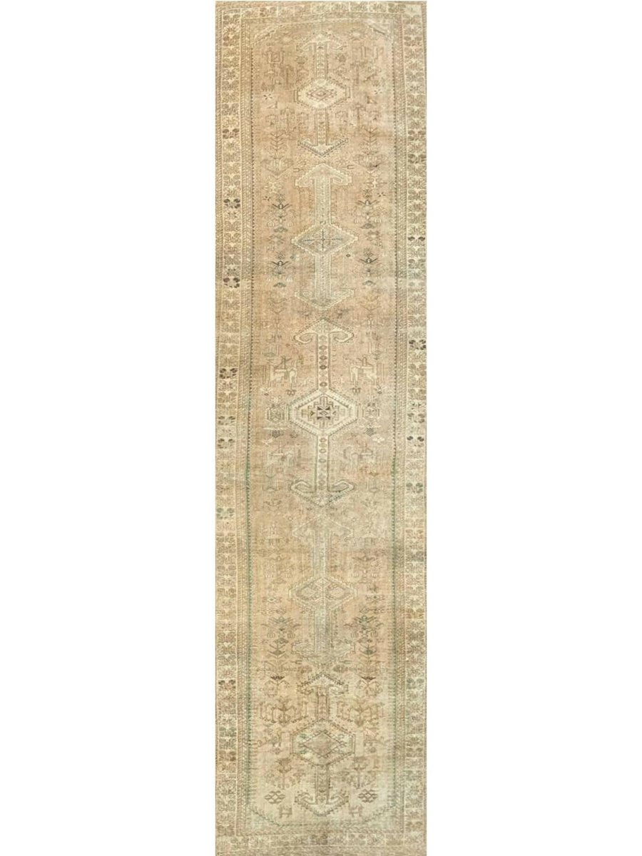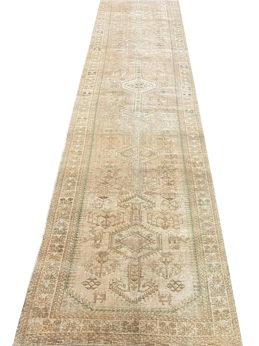 Add a touch of elegant style to your home with this 4x14 Old Persian Shiraz Style Runner Rug, crafted in Persia. This rug features a captivating geometric pattern with medallions, showcasing traditional motifs in a soft light beige, muted green, and light brown-gray palette. Crafted from durable wool ensures longevity, perfect for hallways, entryways, or narrow spaces. The intricate detail reflects skilled craftsmanship and timeless design heritage. This piece effortlessly enhances, adding warmth, consistency, and style. A true blend of artistry and function, it easily brings heritage charm into any space. Enjoy the benefit of free shipping across the United States. Each rug has one-of-a-kind subtle variations inherent to its creation.