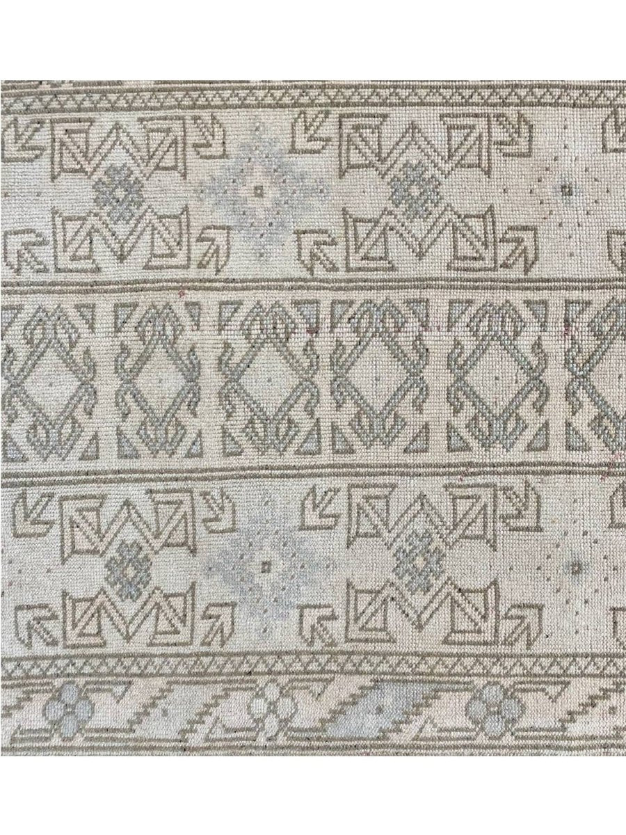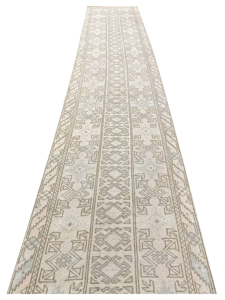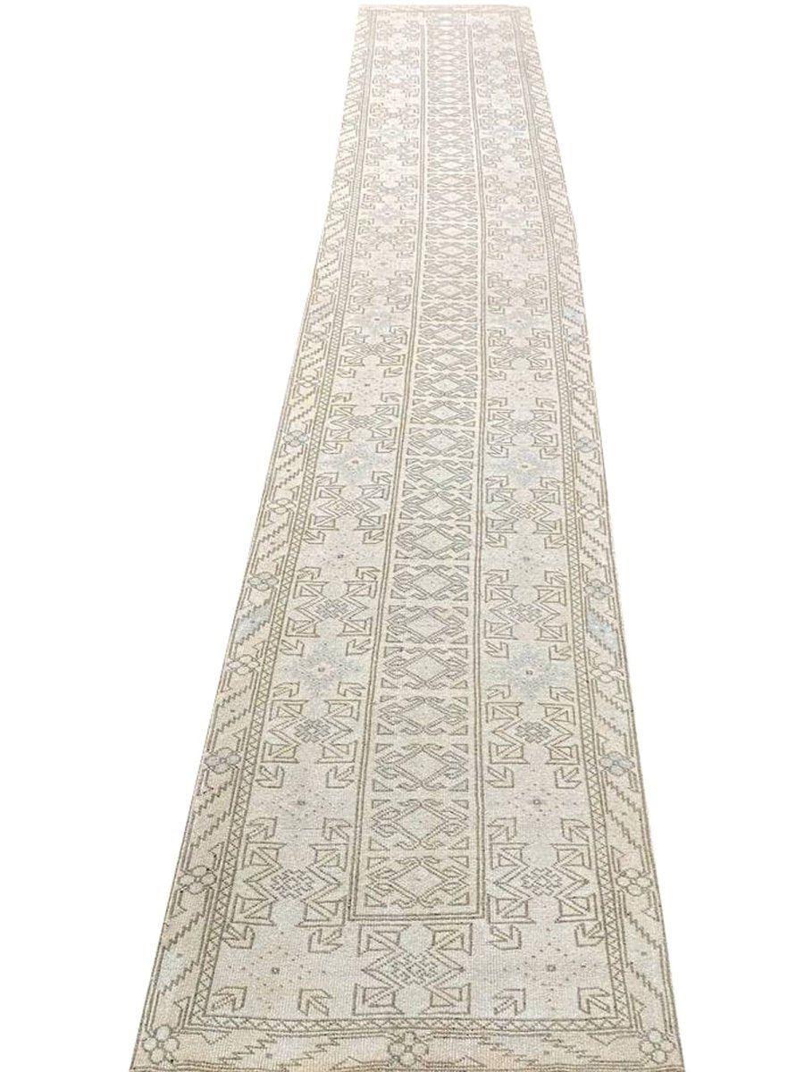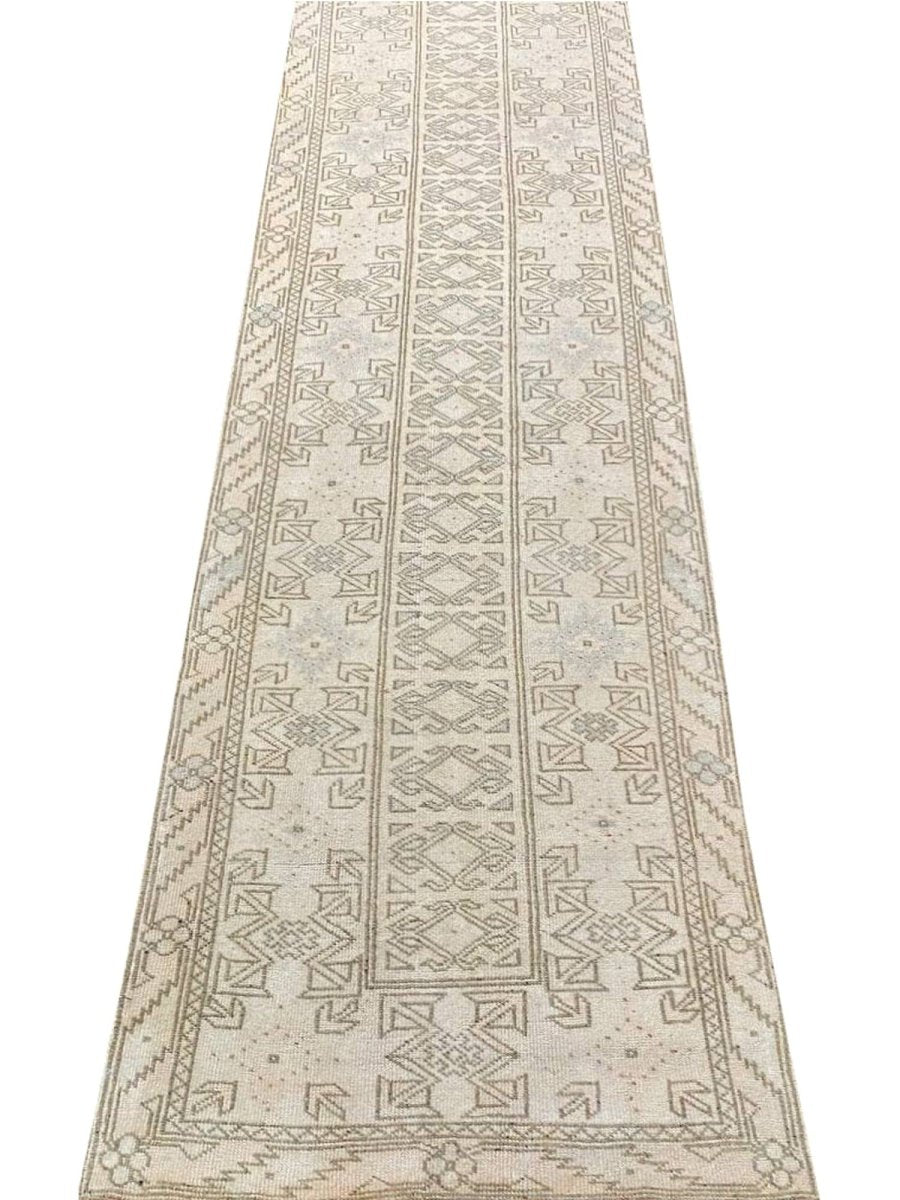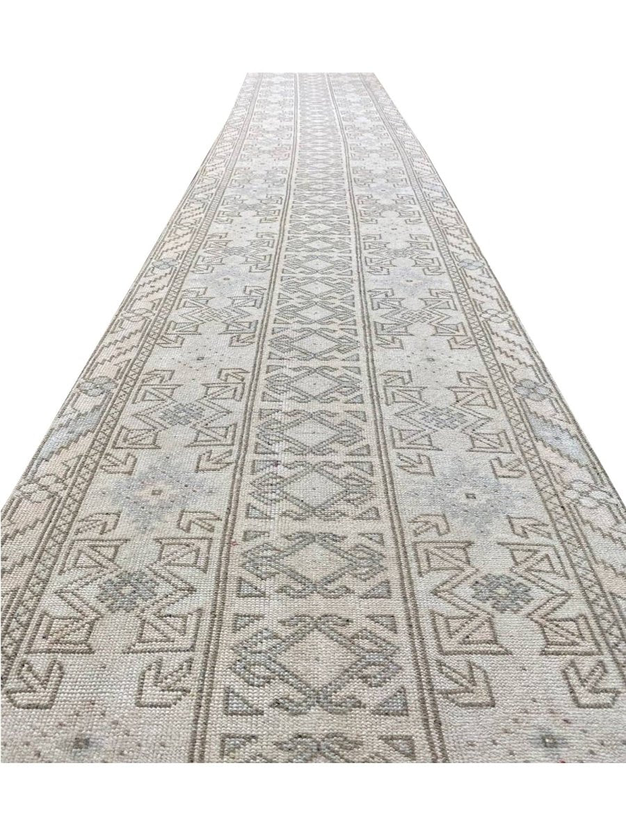 Elevate your space with the timeless elegance of this 3x15 old Turkish Anatolian hali runner. This exquisite runner showcases a classic geometric pattern, featuring a delicate lattice of diamond and cross motifs that exude traditional charm. The soft cream background is beautifully complemented by muted gray and beige tones, creating a serene and sophisticated look. A wide, intricately designed border frames the runner, adding depth and character to its overall design. Handcrafted in Turkey by skilled artisans, this runner is made from premium wool, ensuring durability and a luxurious feel underfoot. Perfect for hallways, entryways, or alongside a bed, this runner brings a touch of cultural heritage and refined artistry to any home.