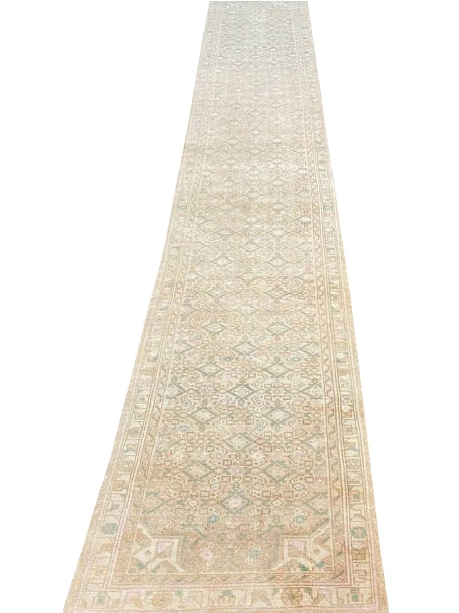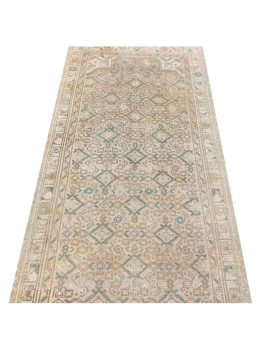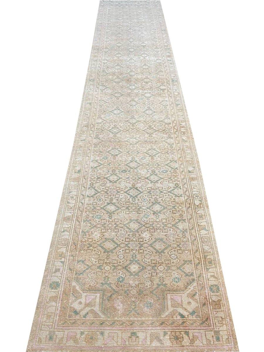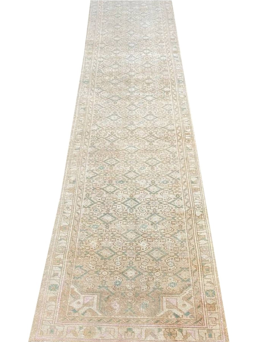 Enhance your home with the timeless charm of this 3x17 Old Persian Hamadan Runner Rug. Its size makes it a perfect choice for hallways, entryways, and other narrow spaces, adding a touch of traditional elegance to your decor. The rug features a geometric pattern, offering a sense of refined beauty. The color palette showcases a harmonious blend of beige and light brown, with subtle accents of green within the geometric motifs and borders. These colors work together to create a balanced and inviting aesthetic. Crafted from durable wool, this runner rug is designed for longevity, becoming a cherished element in your home for years. Enjoy the beauty and heritage of a handwoven Persian rug, plus free US shipping.