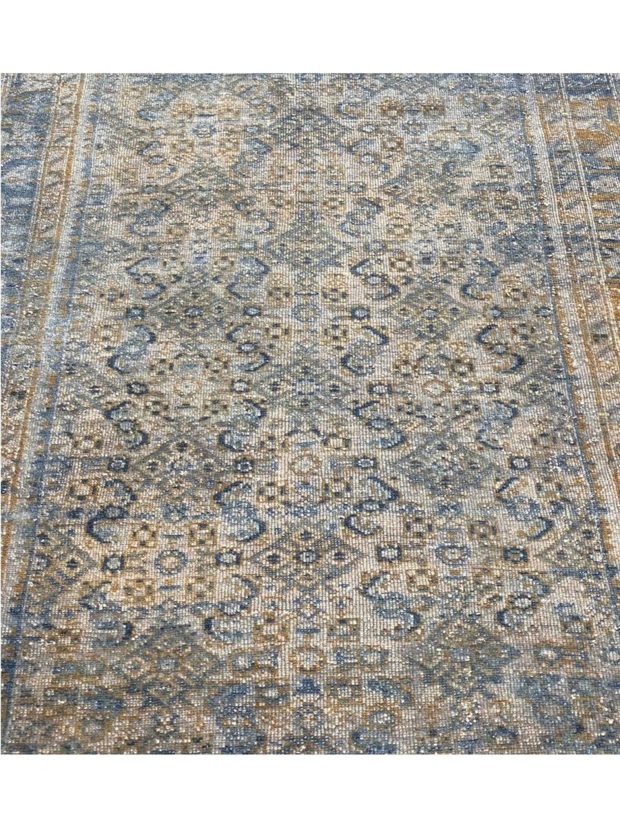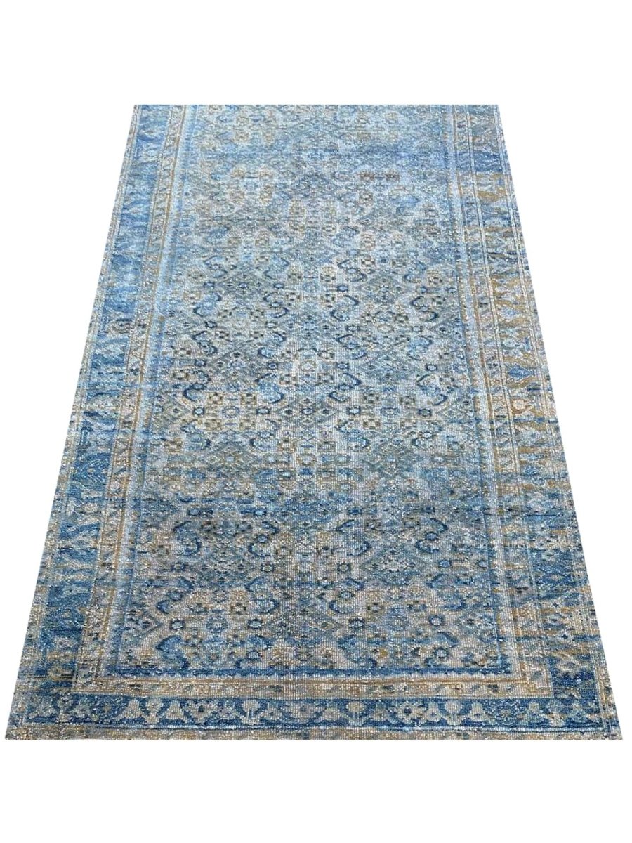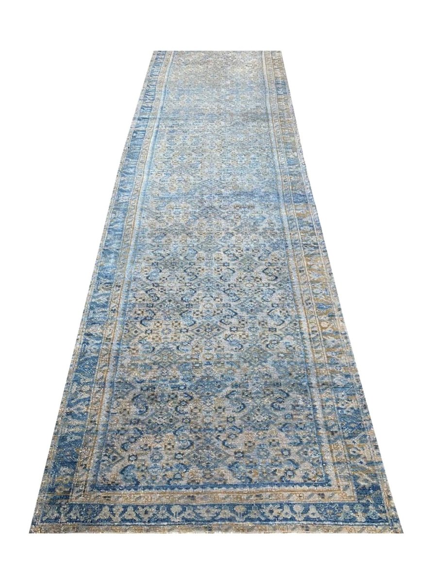 Transform your space with the rich heritage of this 4x18 Old Persian Hamedan Runner Rug. This stunning runner features a captivating geometric pattern, adorned with intricate floral and diamond motifs that reflect the timeless artistry of Persia. The deep blue background is accented with natural and earthy tones of beige, gray, and hints of ivory, creating a sophisticated and inviting ambiance. Framed by a detailed border, this rug adds a touch of elegance and cultural depth to any setting. Handcrafted in Persia with premium wool, it offers durability and a luxurious texture underfoot. Ideal for hallways, entryways, or alongside furniture, this Persian rug brings authentic charm to your home.