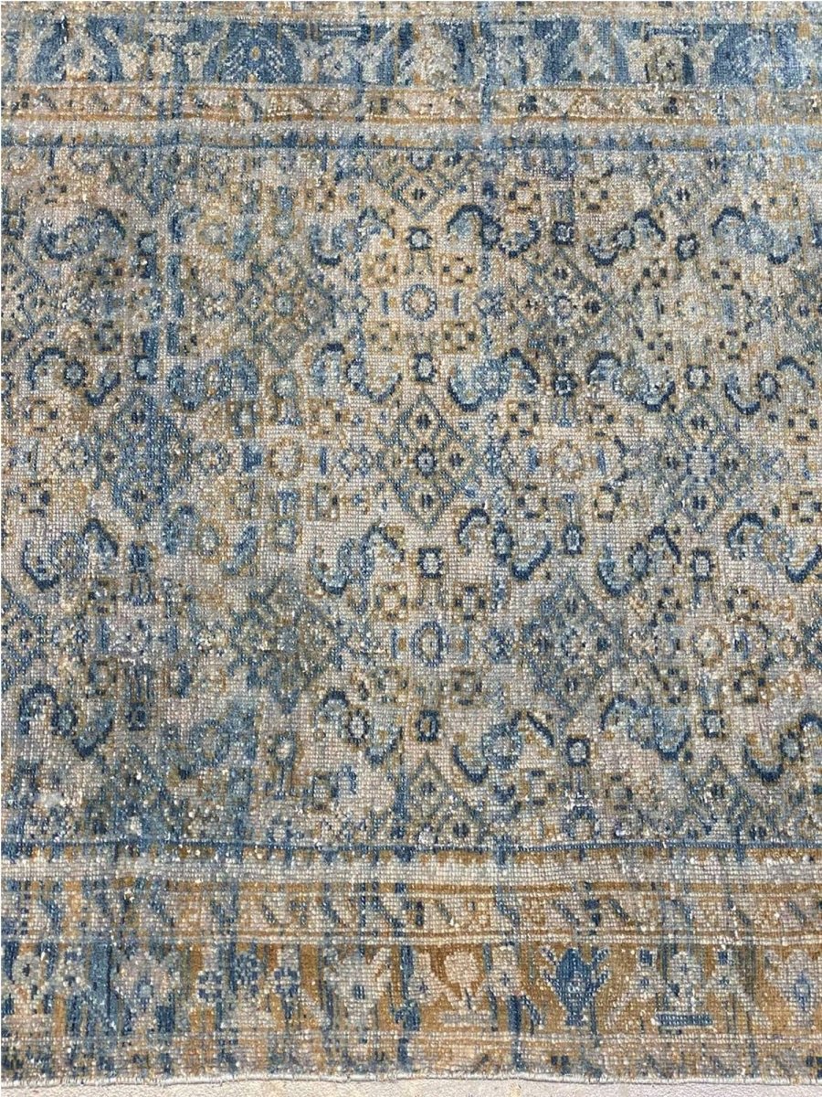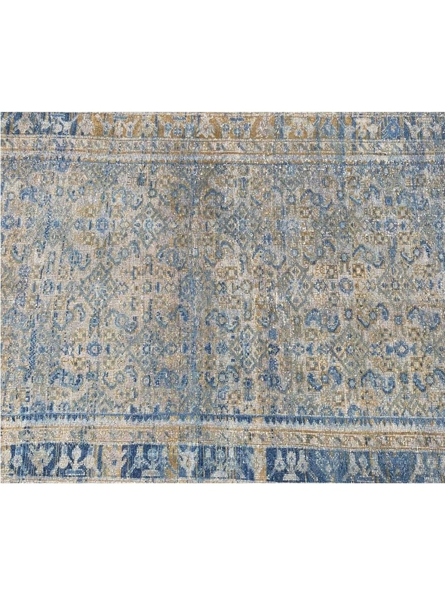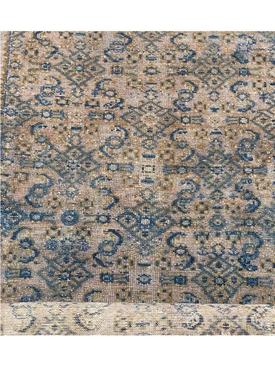 Transform your space with the rich heritage of this 4x18 Old Persian Hamedan Runner Rug. This stunning runner features a captivating geometric pattern, adorned with intricate floral and diamond motifs that reflect the timeless artistry of Persia. The deep blue background is accented with natural and earthy tones of beige, gray, and hints of ivory, creating a sophisticated and inviting ambiance. Framed by a detailed border, this rug adds a touch of elegance and cultural depth to any setting. Handcrafted in Persia with premium wool, it offers durability and a luxurious texture underfoot. Ideal for hallways, entryways, or alongside furniture, this Persian rug brings authentic charm to your home.