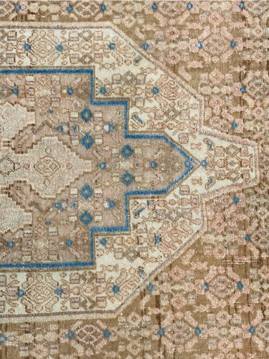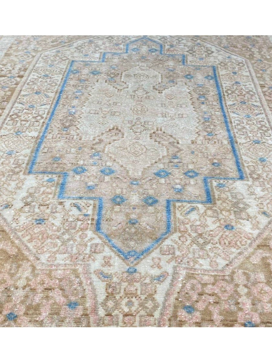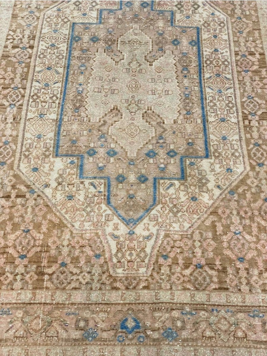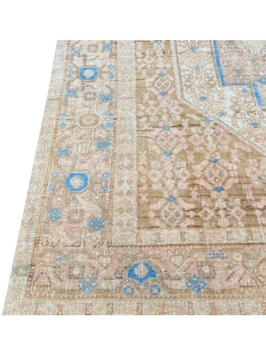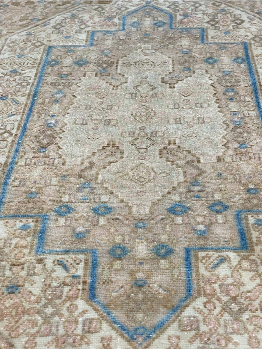 Add the beauty of this 4x5 Old Persian Kurdish Area Rug. Handwoven in Persia, this rug showcases skilled artistry. Ideal for entryways and small areas, this rug adds a touch of historical elegance to your decor, making a charming statement in compact living spaces, or home offices. The central medallion pattern gives it a sophisticated and eye-catching focal point. The color palette features warm tones of beige and light brown as primary colors, complemented by accents of blue and a soft hue within the geometric and traditional motifs. These colors work together to create a welcoming and distinctive ambiance. Made from durable wool, this rug is more than just a floor covering; it's a piece of history that will enhance your home decor for years. Enjoy the lasting charm of a handwoven rug, plus free US shipping.