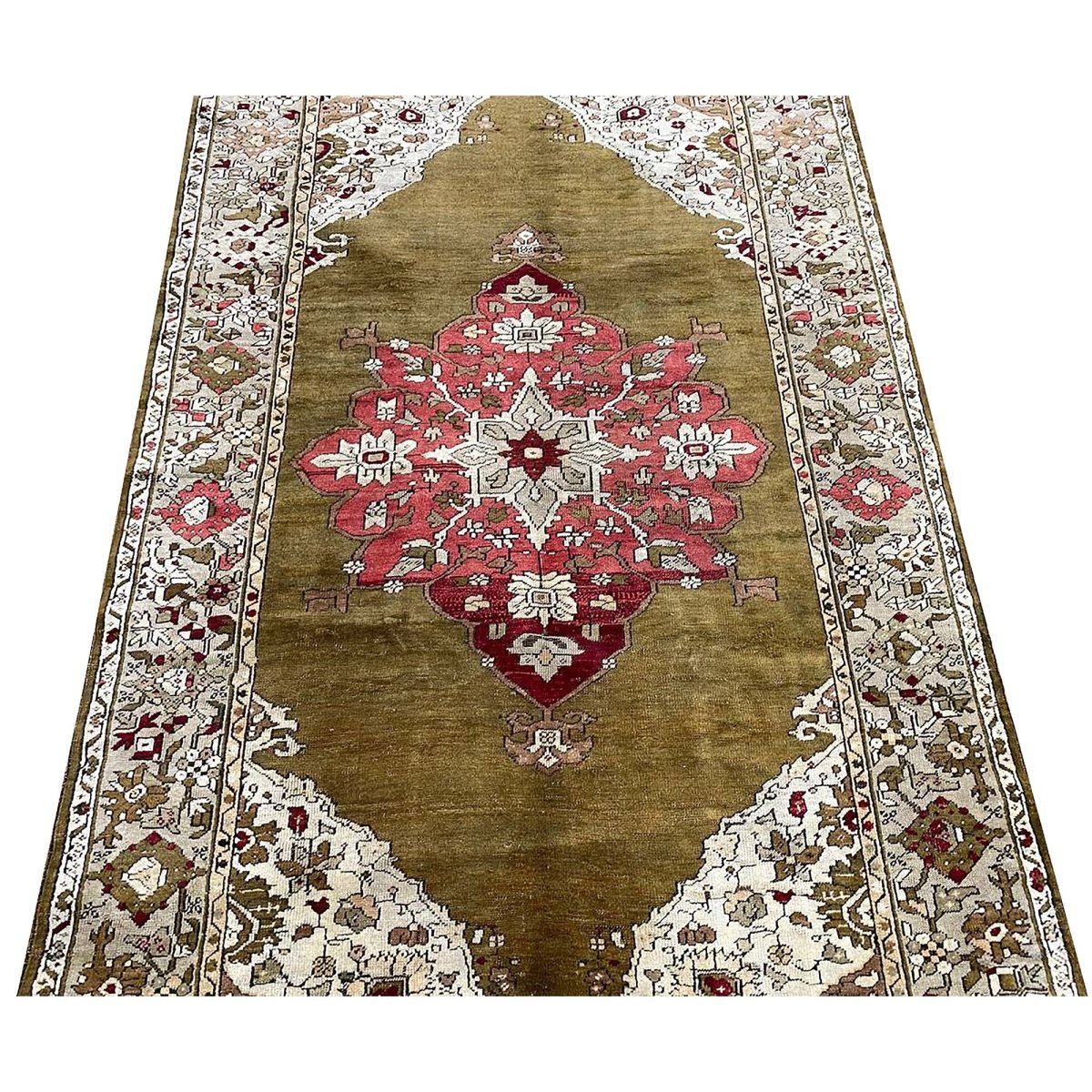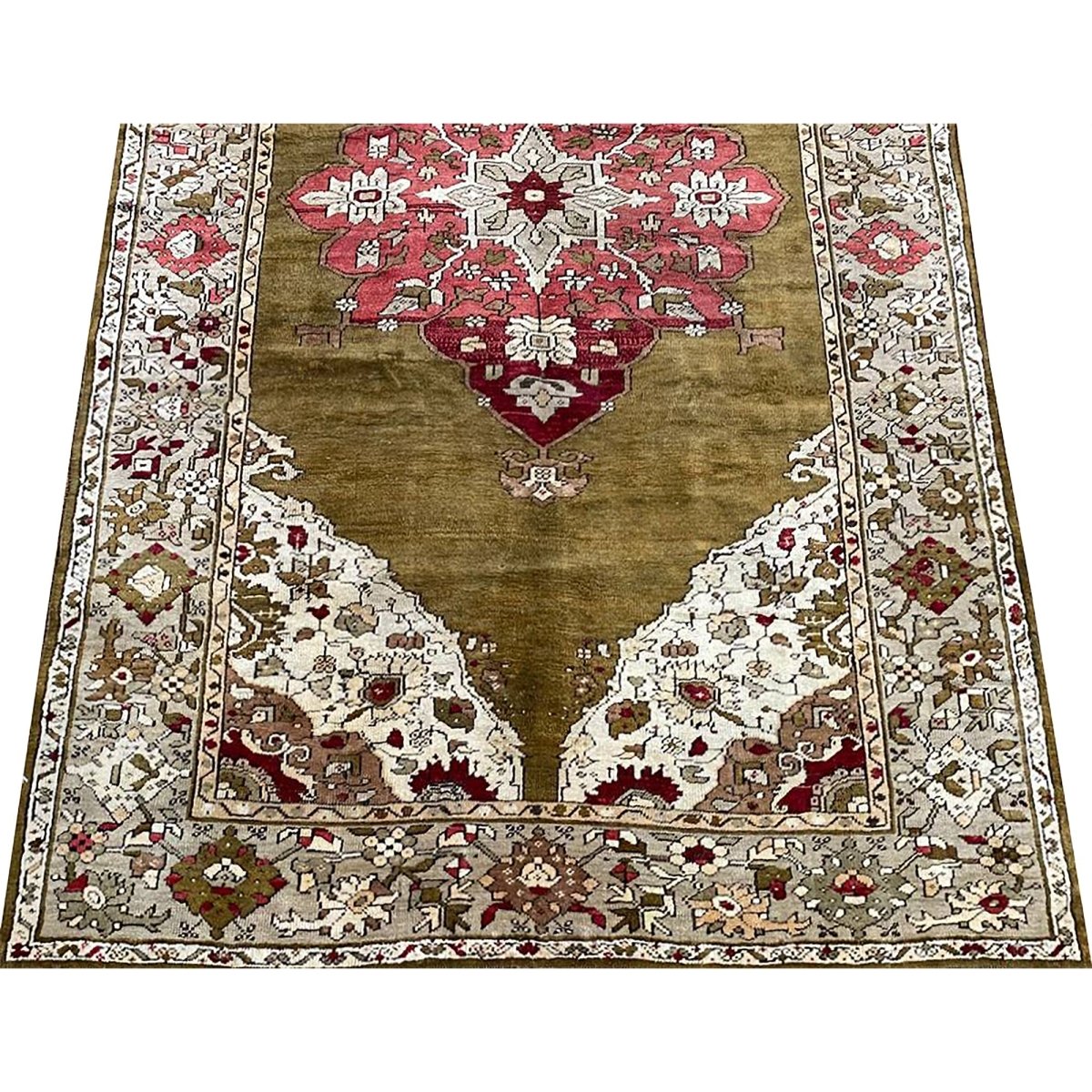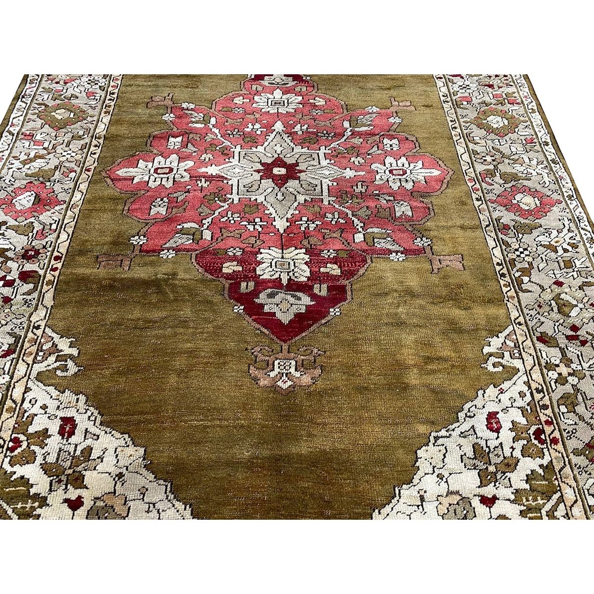 The 4x7 Antique Turkish Anatolian Area Rug is a unique treasure that embodies the rich history of Turkish weaving and will transform your living area. Made from high-quality wool, this gorgeous traditional rug features a medallion design that blends in perfectly with any type of interior design. It provides a friendly atmosphere and is perfect for large dining rooms, comfortable living spaces, or as a chic addition in your workplace. It is a multipurpose addition to your house because of the striking blend of sage green, beige, burgundy, brown, and pink hues that offer depth and character. This amazing carpeting is a stunning work of art that elevates your living area and goes beyond simple decoration. Take advantage of free US delivery.