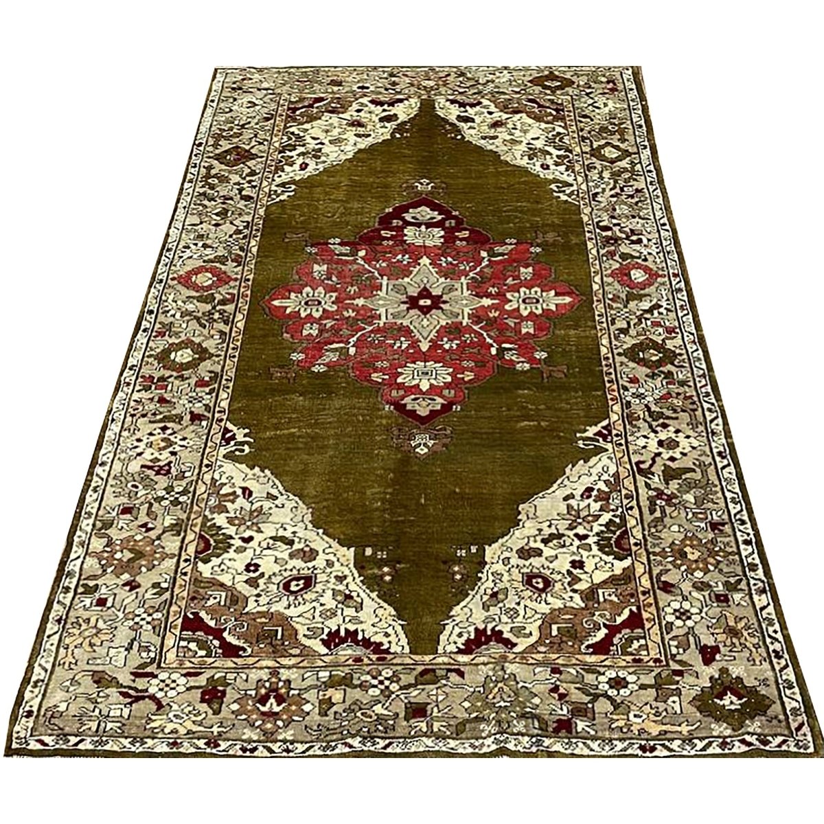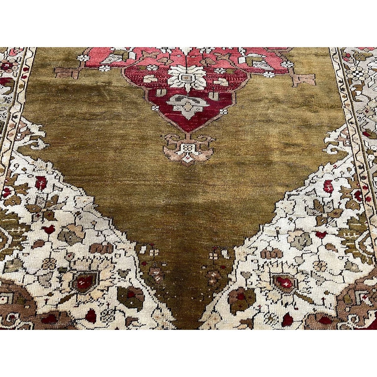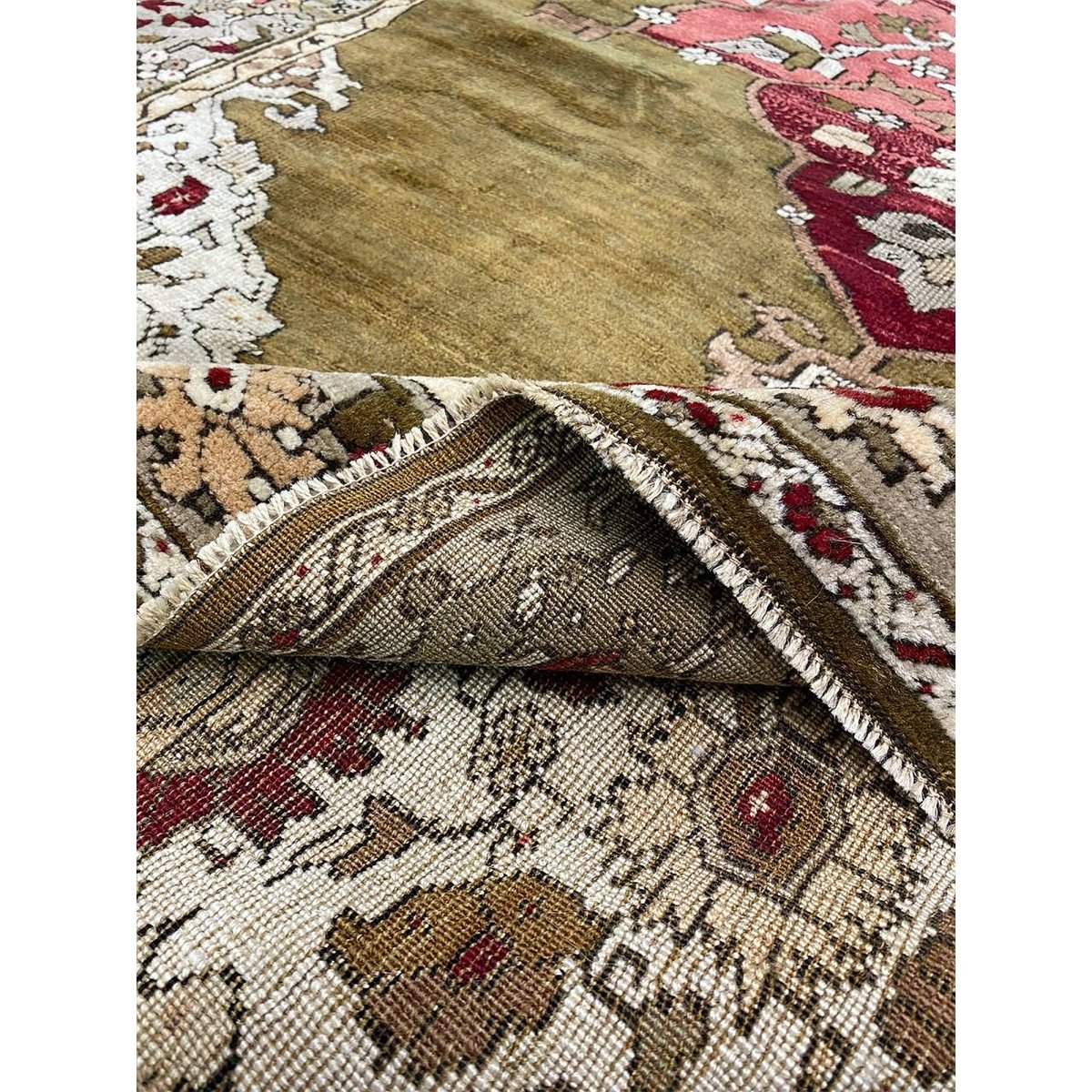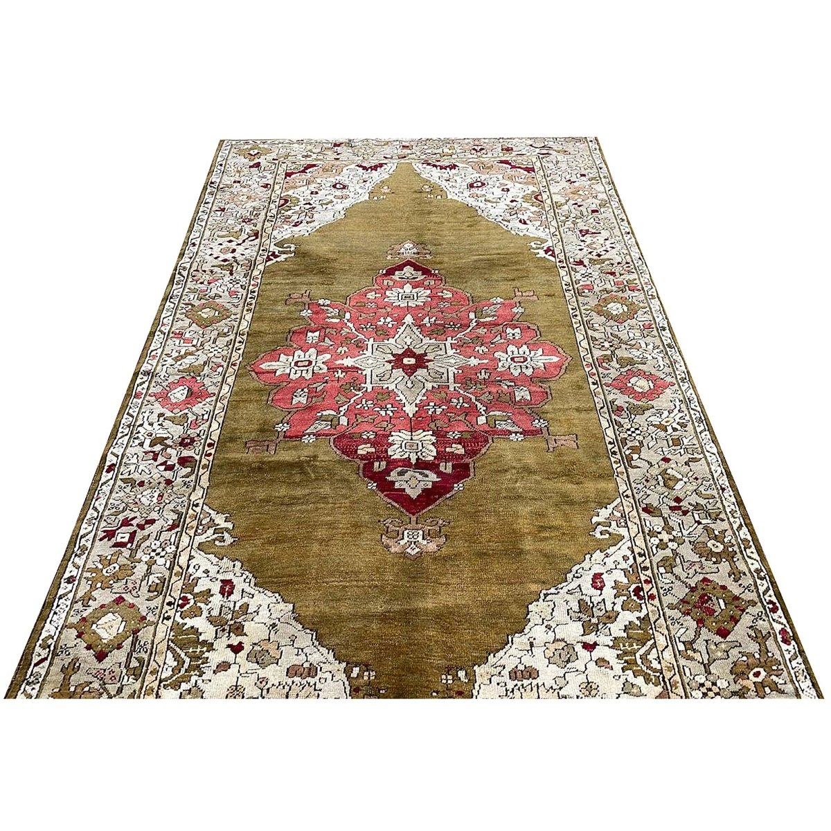 The 4x7 Antique Turkish Anatolian Area Rug is a unique treasure that embodies the rich history of Turkish weaving and will transform your living area. Made from high-quality wool, this gorgeous traditional rug features a medallion design that blends in perfectly with any type of interior design. It provides a friendly atmosphere and is perfect for large dining rooms, comfortable living spaces, or as a chic addition in your workplace. It is a multipurpose addition to your house because of the striking blend of sage green, beige, burgundy, brown, and pink hues that offer depth and character. This amazing carpeting is a stunning work of art that elevates your living area and goes beyond simple decoration. Take advantage of free US delivery.