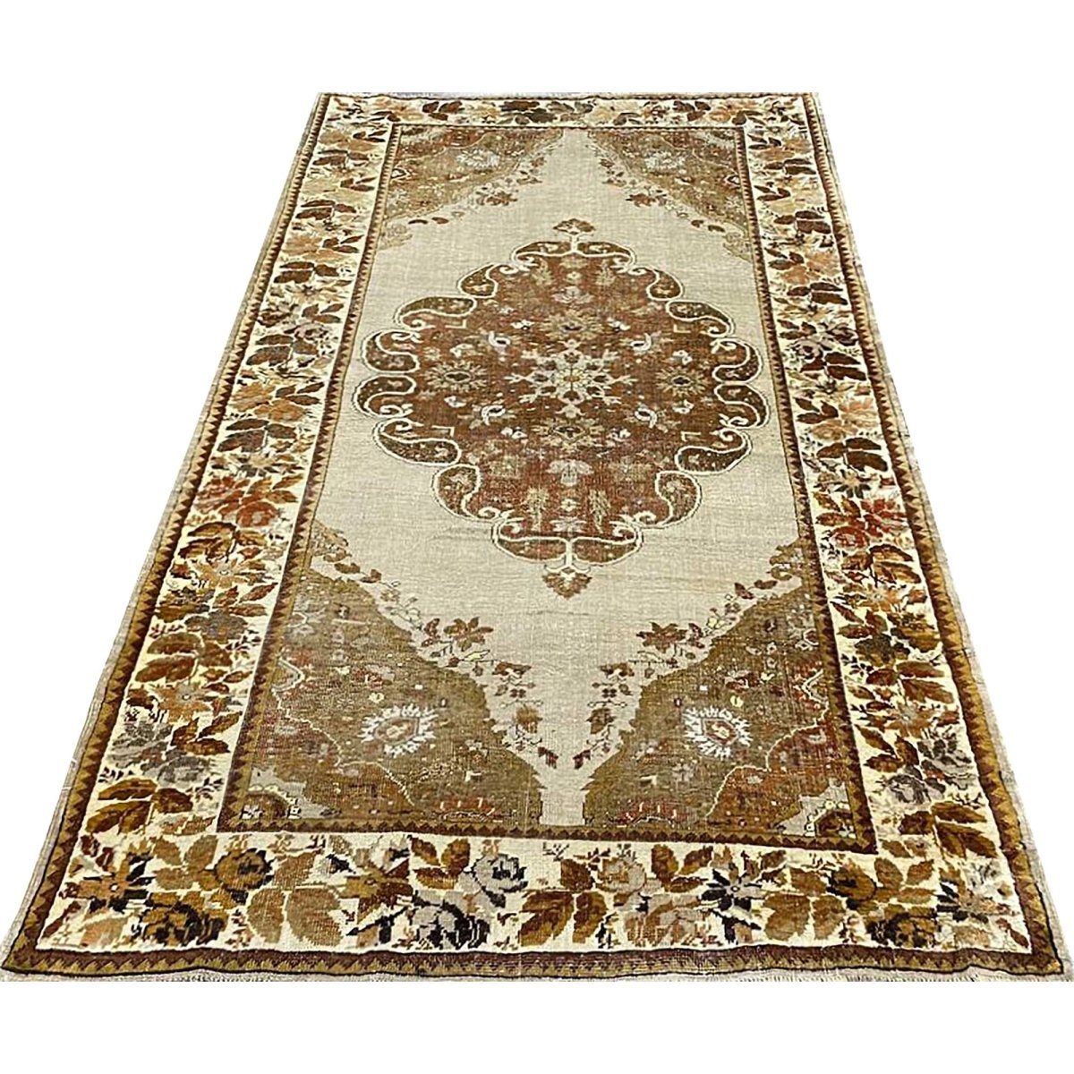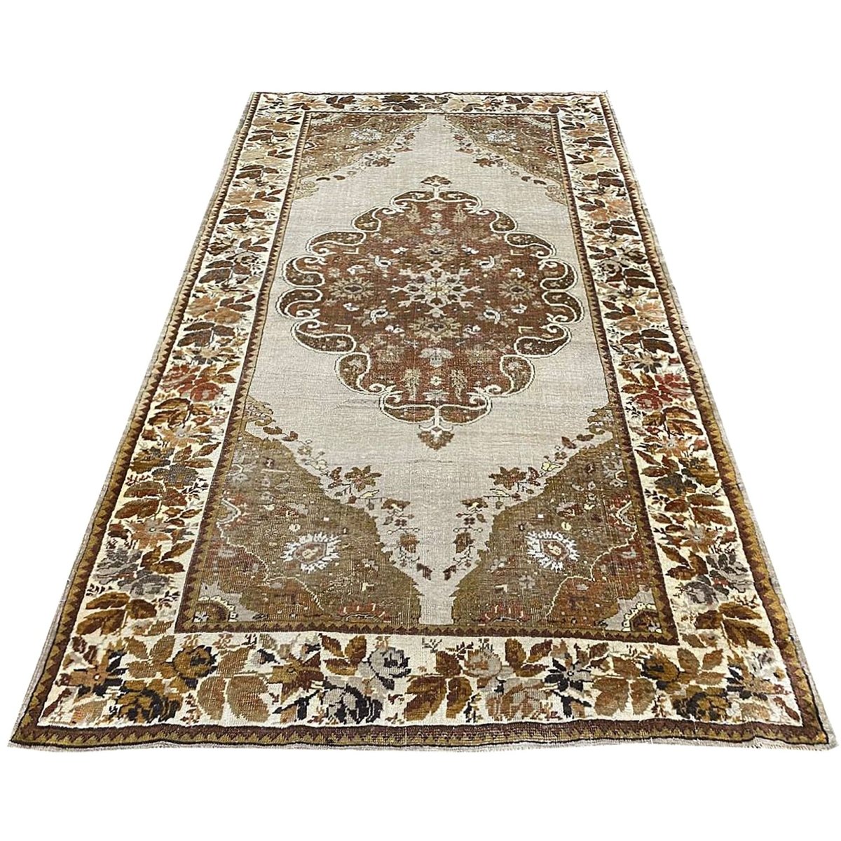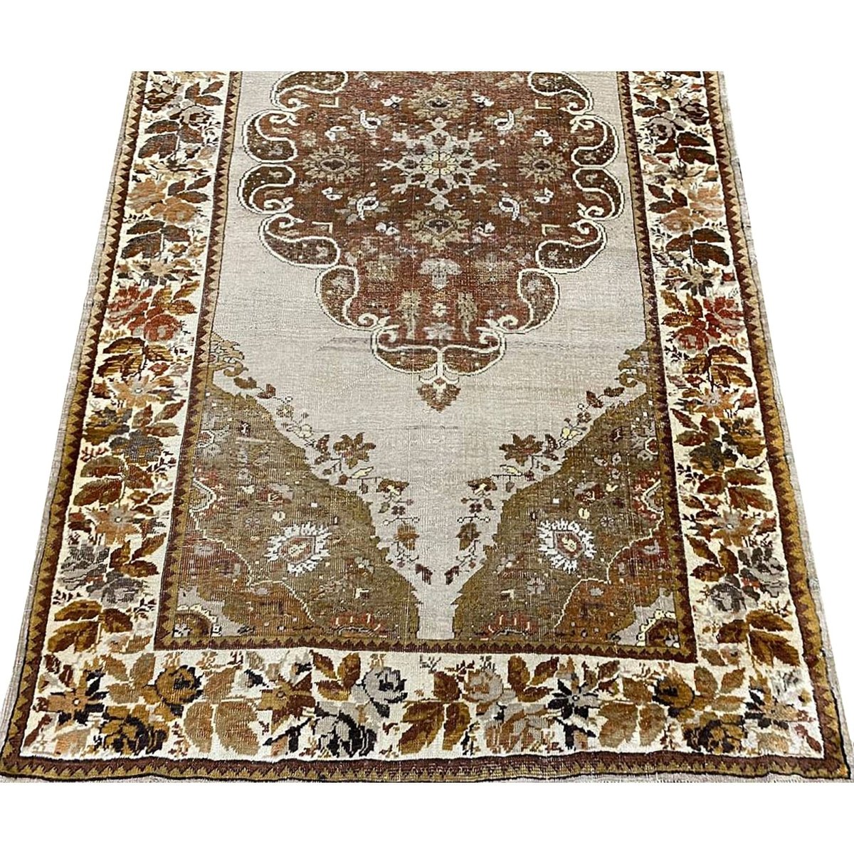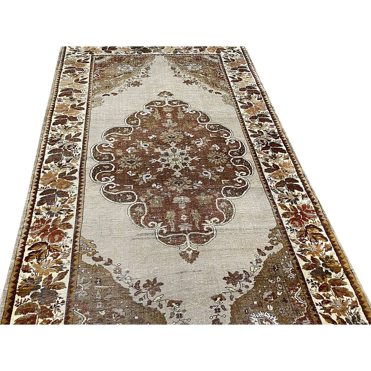 This 4x7 antique Turkish Anatolian area rug is hand-knotted from high-quality materials in Turkey, It boasts a stunning color palette that adds a touch of elegance to any room. The beautiful gray base provides the backdrop for the central medallion pattern, which features a delicate balance of brown hues, subtle gray accents, and touches of beige. The result is a visually striking design that creates a sense of depth and visual interest. With its compact size, this area rug is perfect for adding charm to small rooms, such as bedrooms, home offices, or entryways. Its durable construction and high-quality materials ensure it will remain a beautiful and functional addition to your home for years. As a unique antique piece with floral motifs, this Turkish Anatolian area rug is sure to impress with its timeless beauty and character.