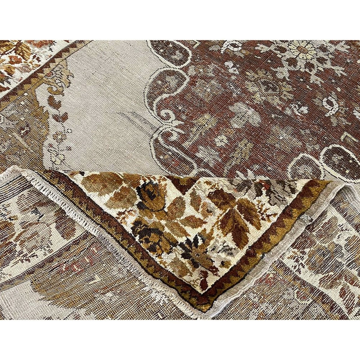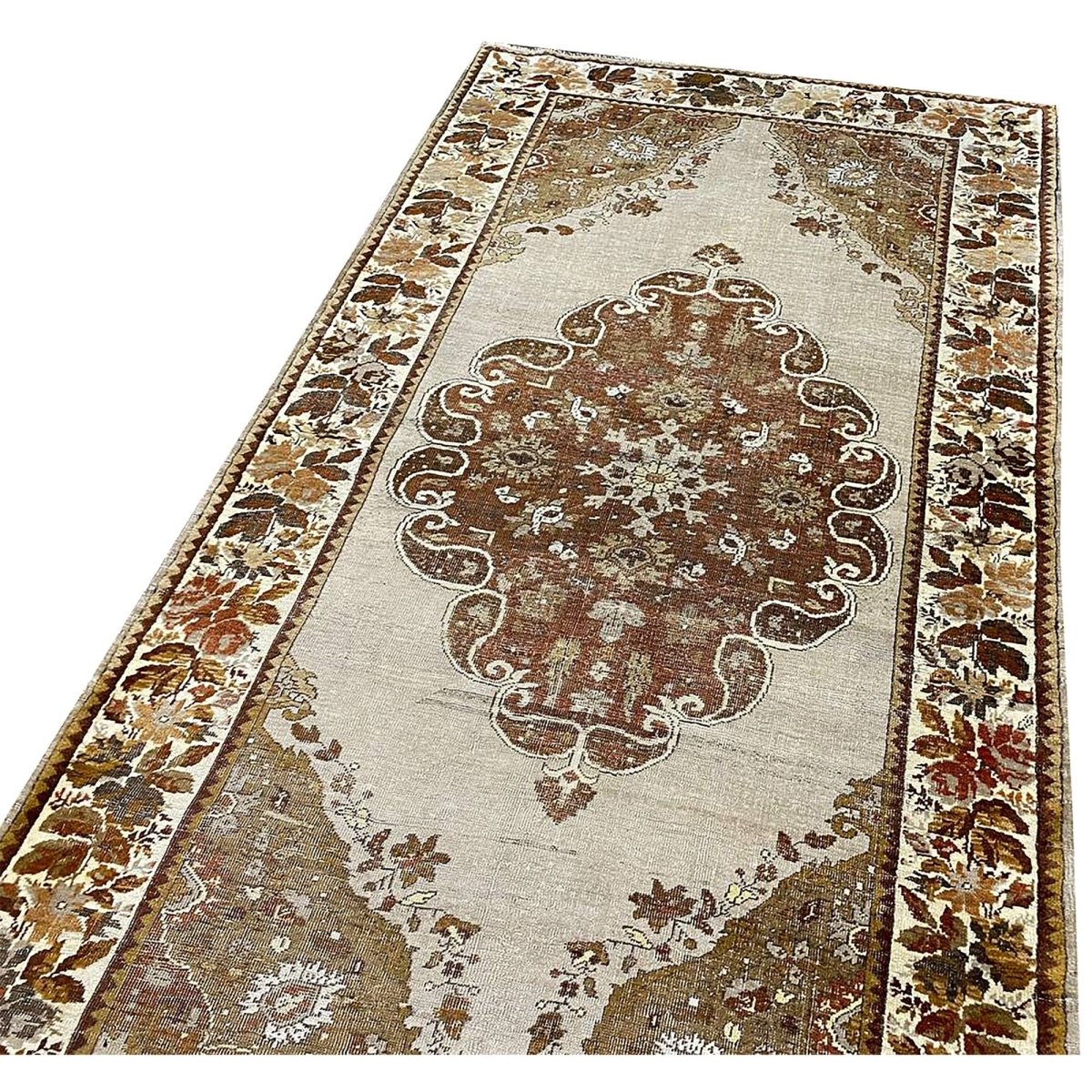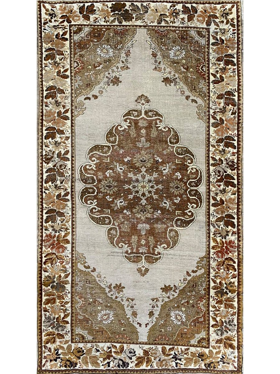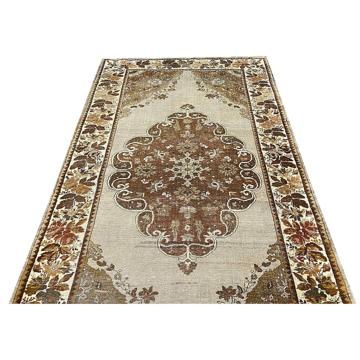 This 4x7 antique Turkish Anatolian area rug is hand-knotted from high-quality materials in Turkey, It boasts a stunning color palette that adds a touch of elegance to any room. The beautiful gray base provides the backdrop for the central medallion pattern, which features a delicate balance of brown hues, subtle gray accents, and touches of beige. The result is a visually striking design that creates a sense of depth and visual interest. With its compact size, this area rug is perfect for adding charm to small rooms, such as bedrooms, home offices, or entryways. Its durable construction and high-quality materials ensure it will remain a beautiful and functional addition to your home for years. As a unique antique piece with floral motifs, this Turkish Anatolian area rug is sure to impress with its timeless beauty and character.