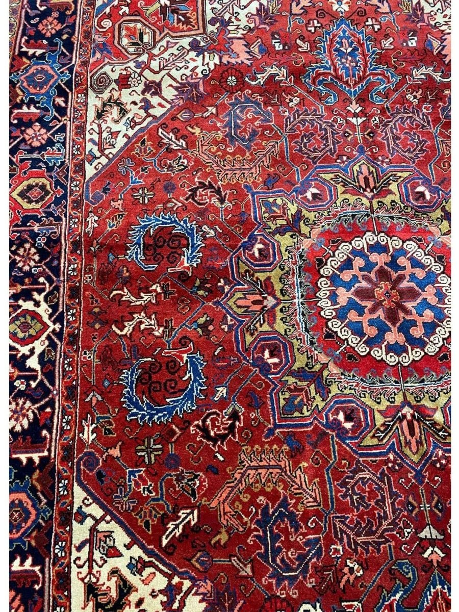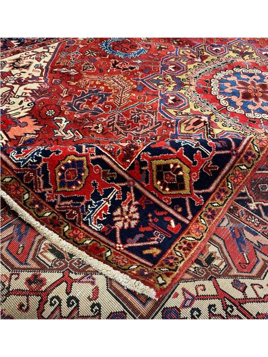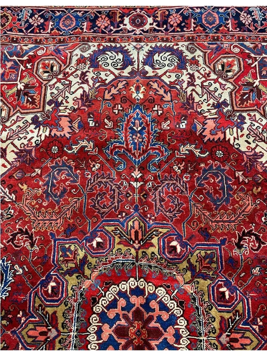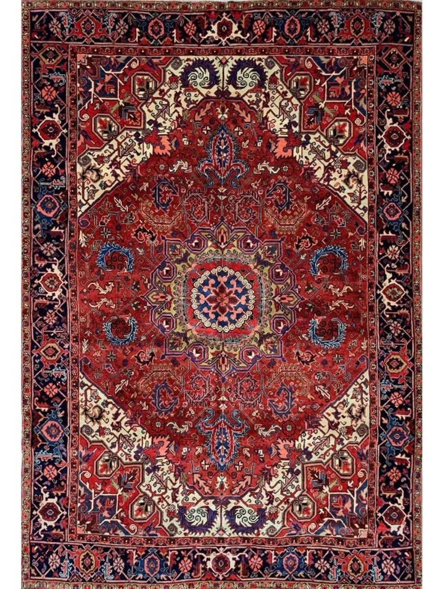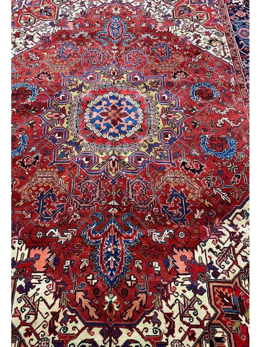 The 7x10 Old Persian Heriz Area Rug is a unique treasure that embodies the rich history of Persian weaving and will transform your living area. Made from high-quality wool, this gorgeous rug features a medallion design that blends in perfectly with any type of interior design. It provides a friendly atmosphere and is perfect for large dining rooms, comfortable living spaces, or as a chic addition in your workplace. It is a multipurpose addition to your house because of the striking blend of burgundy, ivory, blue, pink, yellow, and black hues that offer depth and character. Take advantage of free US delivery.