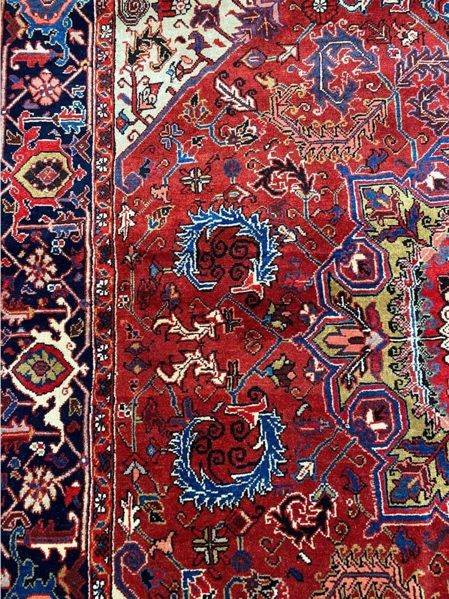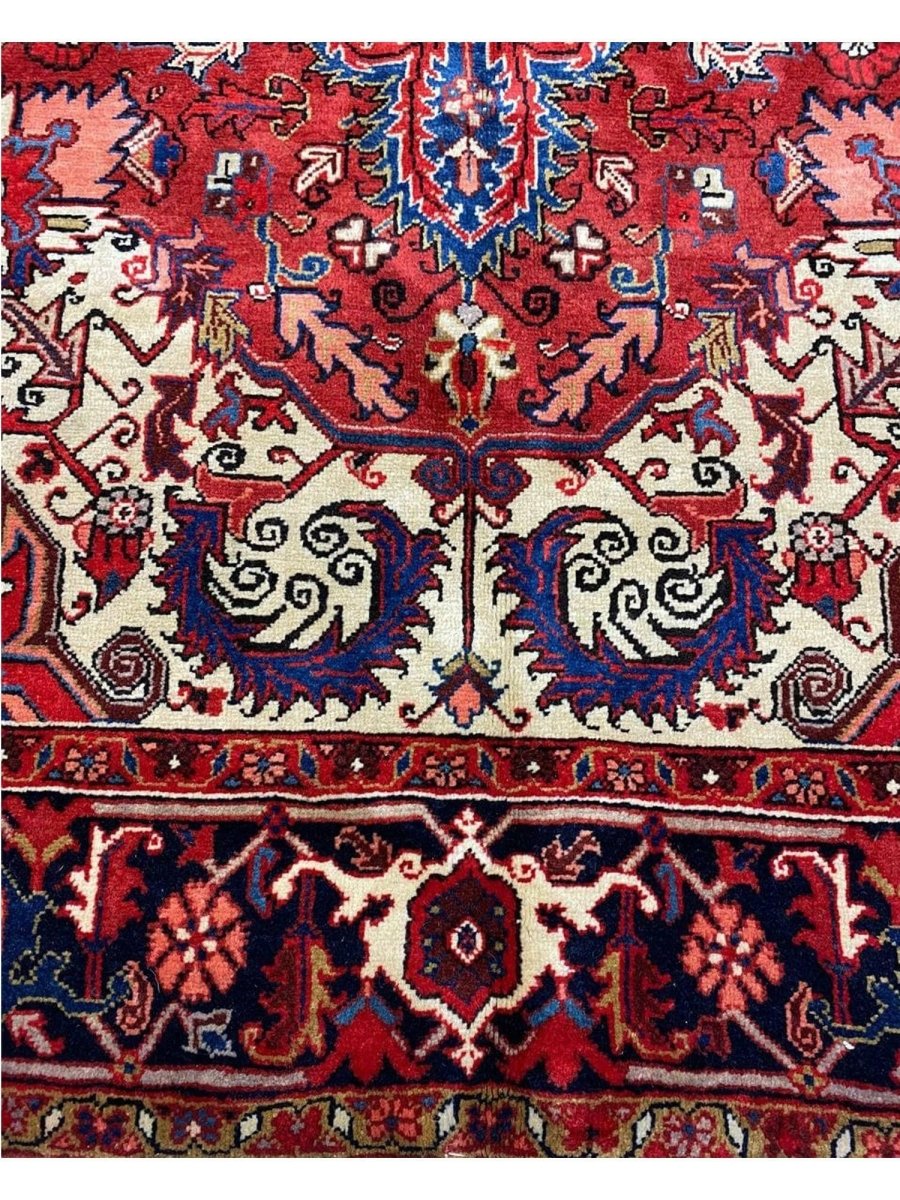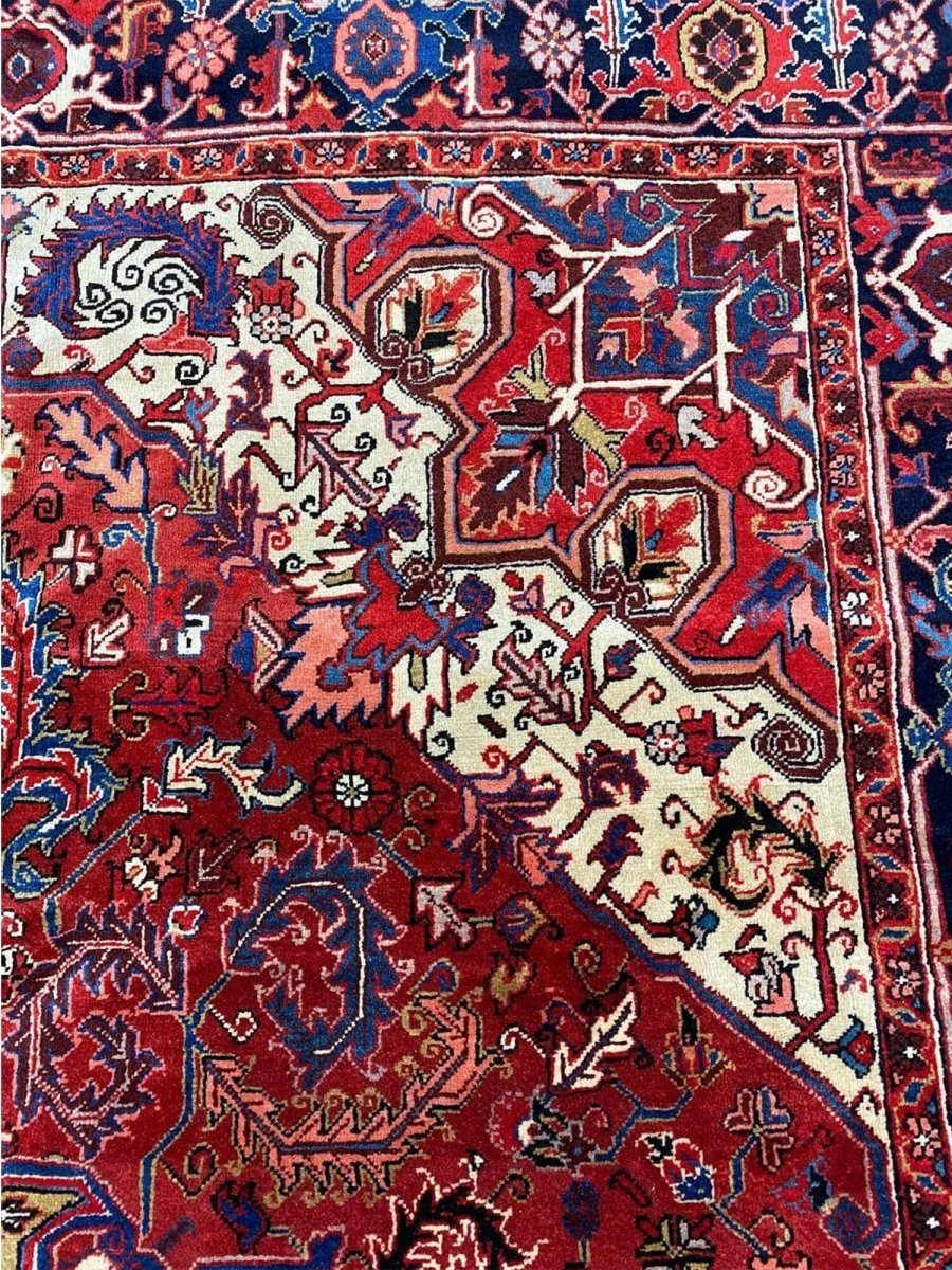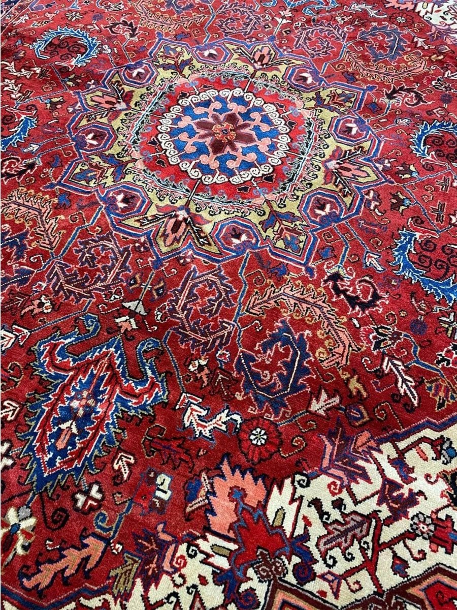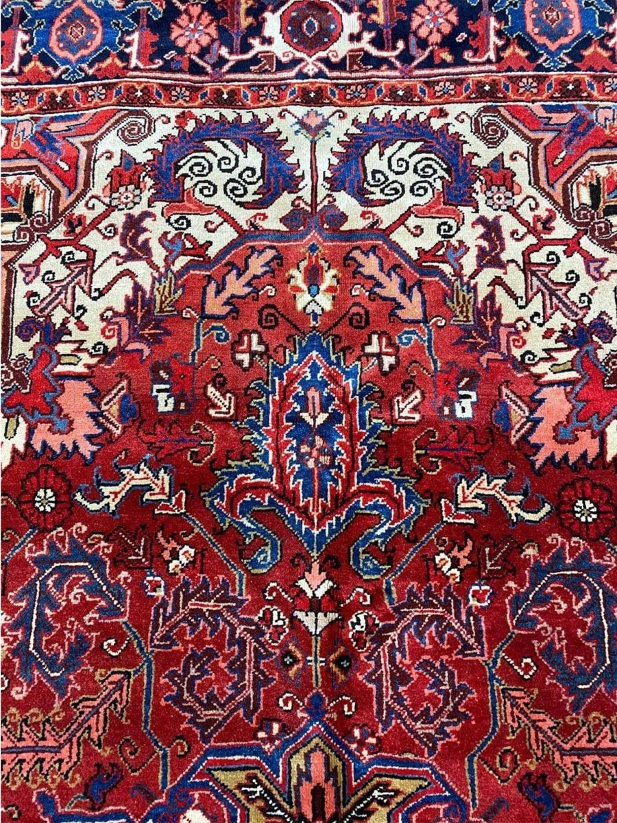 The 7x10 Old Persian Heriz Area Rug is a unique treasure that embodies the rich history of Persian weaving and will transform your living area. Made from high-quality wool, this gorgeous rug features a medallion design that blends in perfectly with any type of interior design. It provides a friendly atmosphere and is perfect for large dining rooms, comfortable living spaces, or as a chic addition in your workplace. It is a multipurpose addition to your house because of the striking blend of burgundy, ivory, blue, pink, yellow, and black hues that offer depth and character. Take advantage of free US delivery.