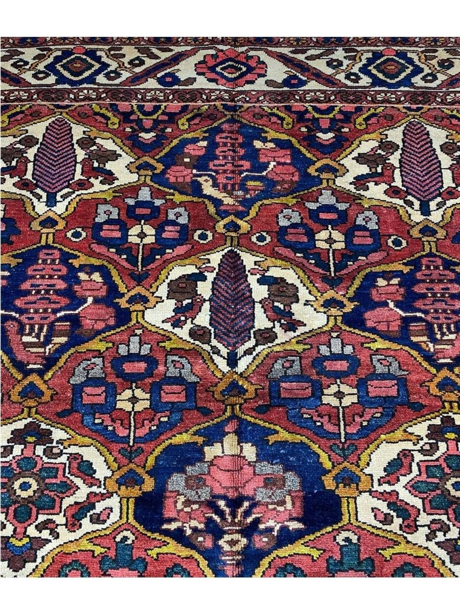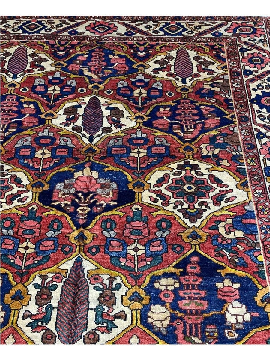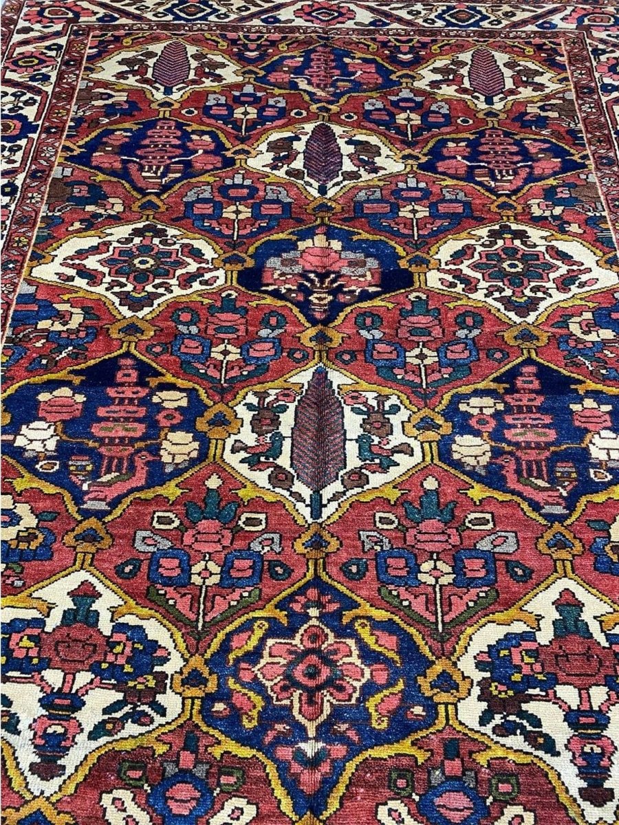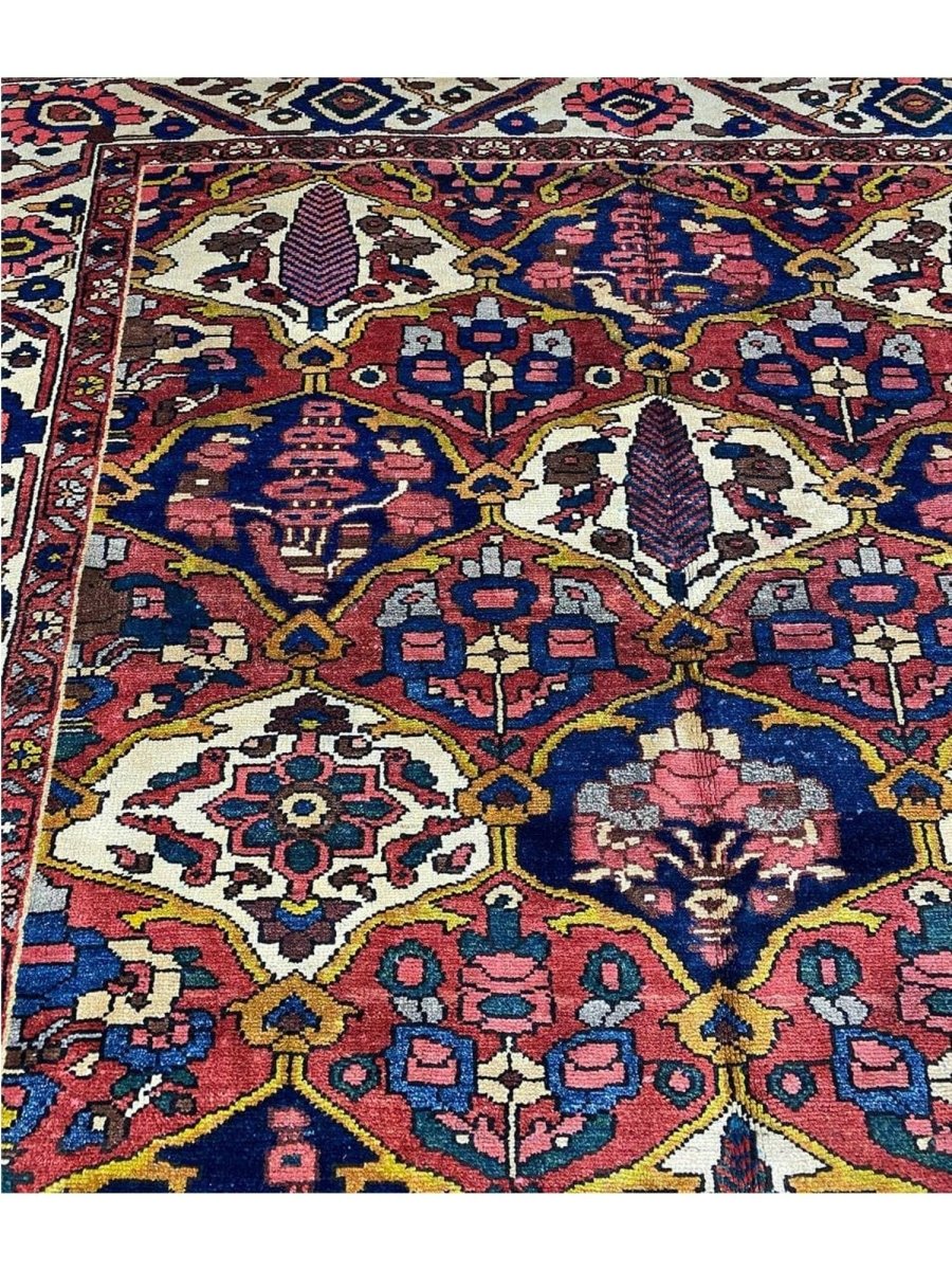 The 7x10 Antique Persian Bakhtiari Area Rug is a unique treasure that embodies the rich history of Persian weaving and will transform your living area. Made from high-quality wool, this gorgeous traditional rug features a geometric design that blends in perfectly with any type of interior design. It provides a friendly atmosphere and is perfect for large dining rooms, comfortable living spaces, or as a chic addition in your workplace. It is a multipurpose addition to your house because of the striking blend of red, blue, ivory, and pink that offer depth and character. This amazing carpeting is a stunning work of art that elevates your living area and goes beyond simple decoration. Take advantage of free US delivery.