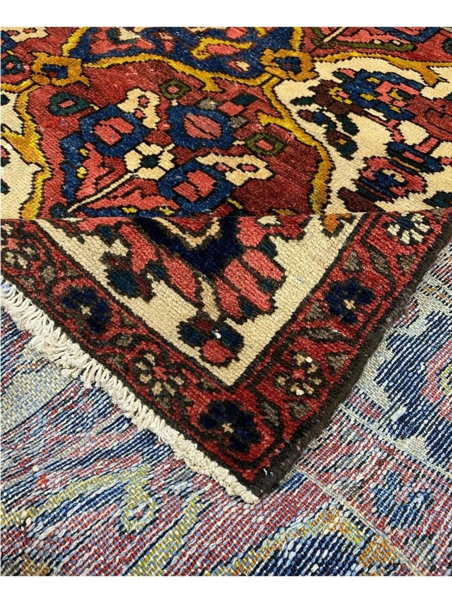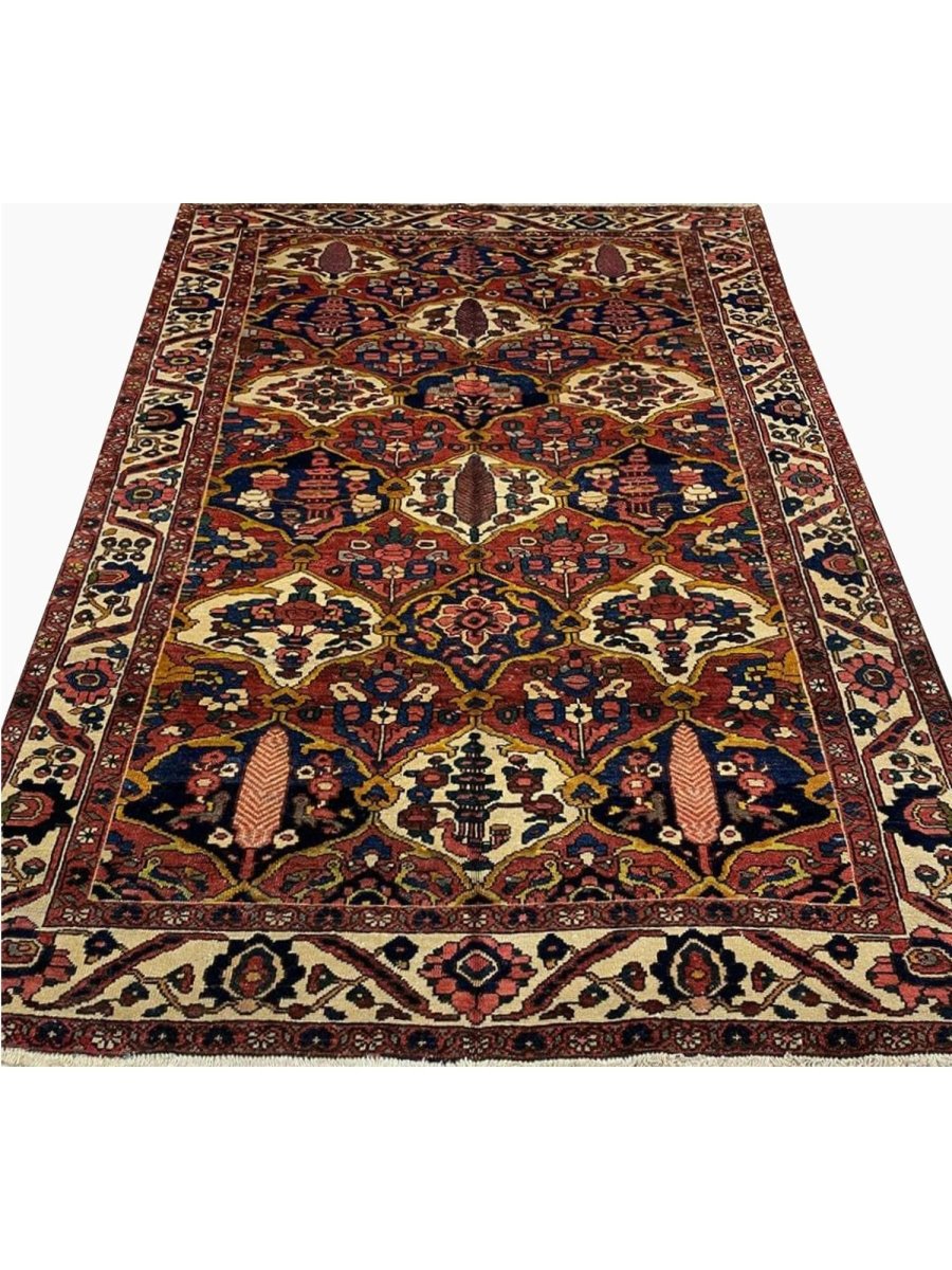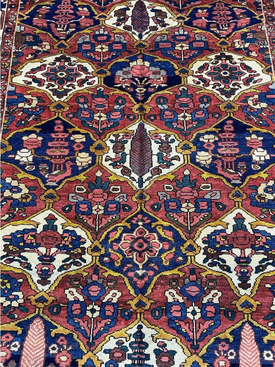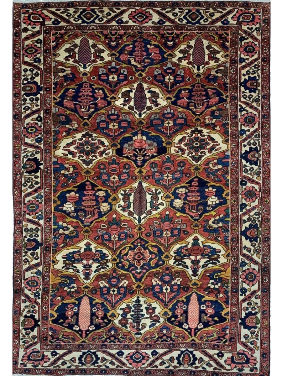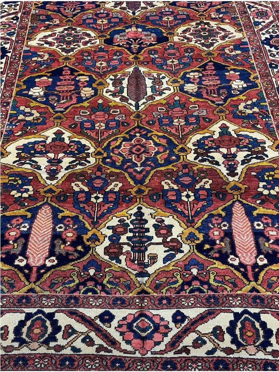 The 7x10 Antique Persian Bakhtiari Area Rug is a unique treasure that embodies the rich history of Persian weaving and will transform your living area. Made from high-quality wool, this gorgeous traditional rug features a geometric design that blends in perfectly with any type of interior design. It provides a friendly atmosphere and is perfect for large dining rooms, comfortable living spaces, or as a chic addition in your workplace. It is a multipurpose addition to your house because of the striking blend of red, blue, ivory, and pink that offer depth and character. This amazing carpeting is a stunning work of art that elevates your living area and goes beyond simple decoration. Take advantage of free US delivery.