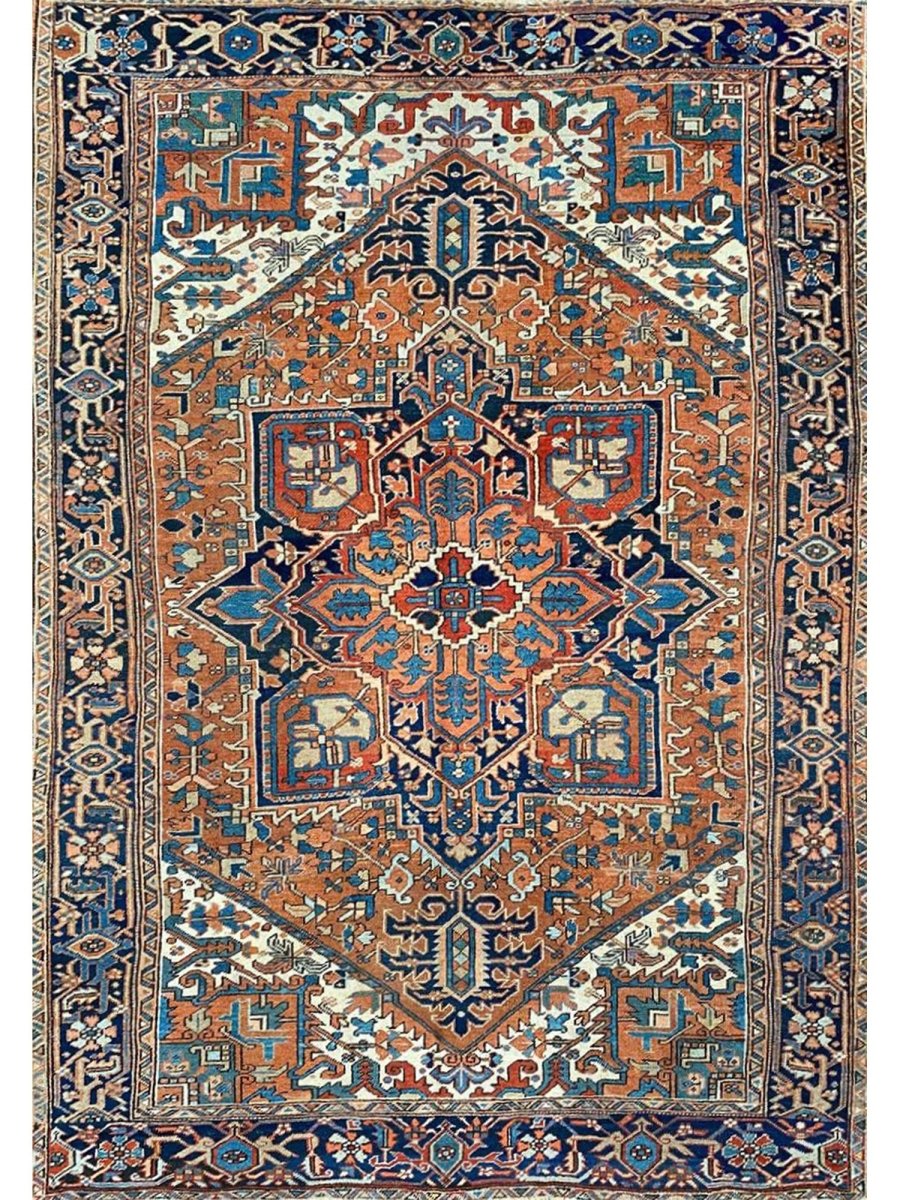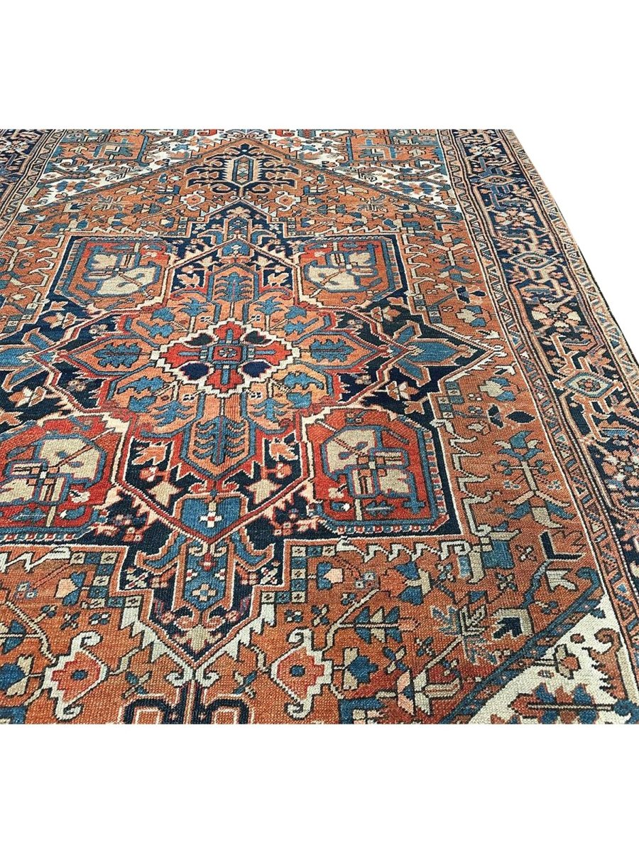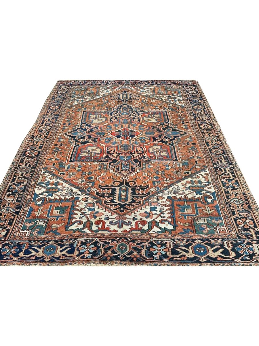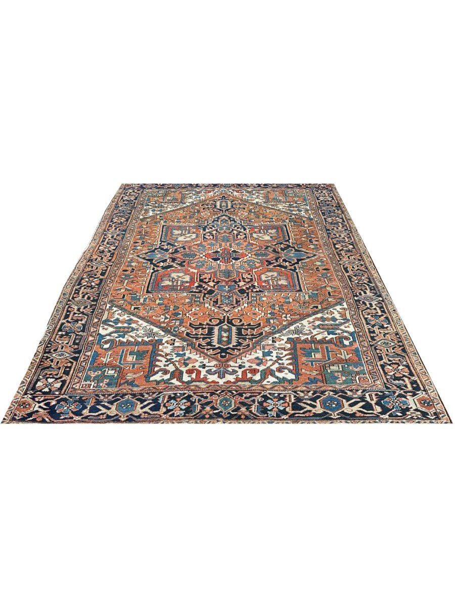Decorate your space with the striking beauty of this 7x10 Antique Persian Heriz area rug. The magnificent rug is handmade in Persia from wool and showcases a commanding central medallion design. The background presents a beautiful orange tone, providing the classic backdrop to the intricate design. Rich geometric motifs have a color palette of navy blue, light blue, beige, brown, and red accents. This piece is perfect for anchoring bedrooms, living rooms, or dining areas. Crafted with traditional hand-making techniques, this wool rug offers enduring durability and a soft touch underfoot. Enjoy the convenience of free and fast delivery within the United States.