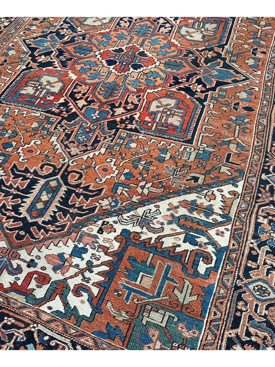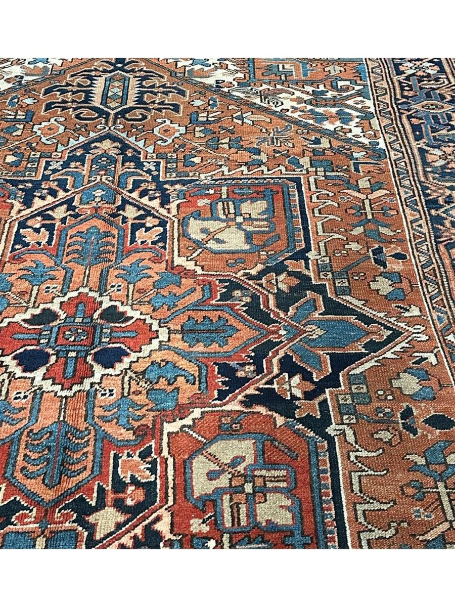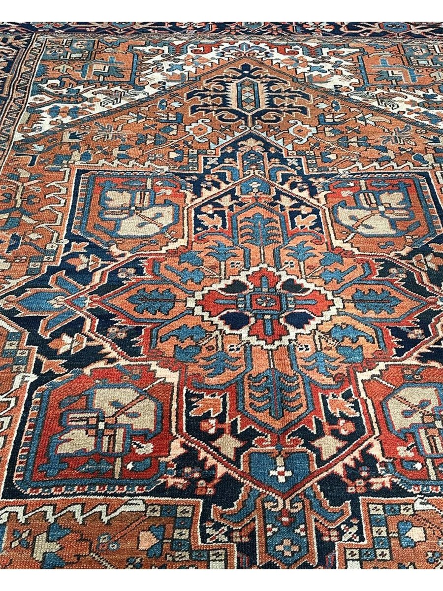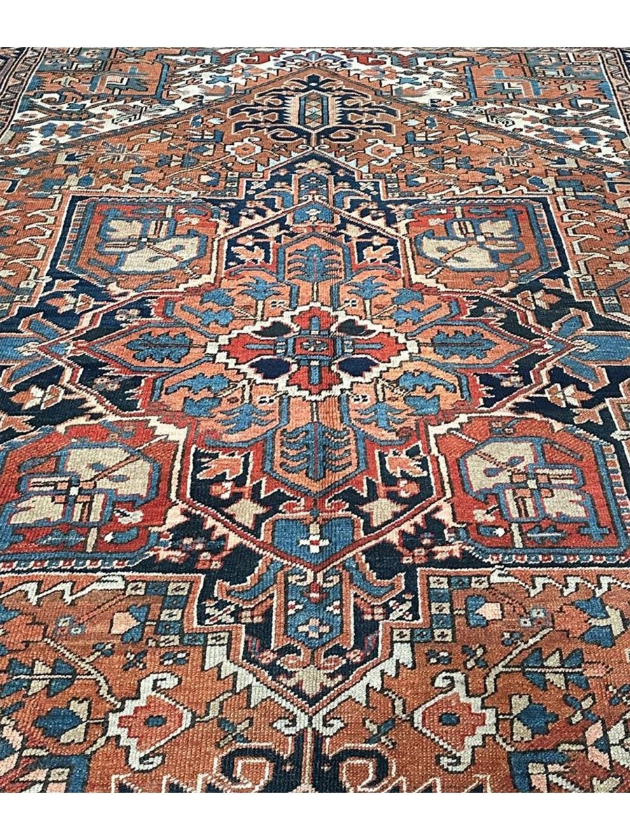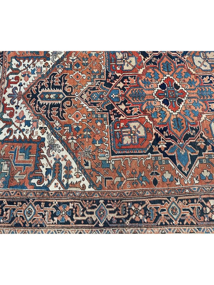 Decorate your space with the striking beauty of this 7x10 Antique Persian Heriz area rug. The magnificent rug is handmade in Persia from wool and showcases a commanding central medallion design. The background presents a beautiful orange tone, providing the classic backdrop to the intricate design. Rich geometric motifs have a color palette of navy blue, light blue, beige, brown, and red accents. This piece is perfect for anchoring bedrooms, living rooms, or dining areas. Crafted with traditional hand-making techniques, this wool rug offers enduring durability and a soft touch underfoot. Enjoy the convenience of free and fast delivery within the United States.