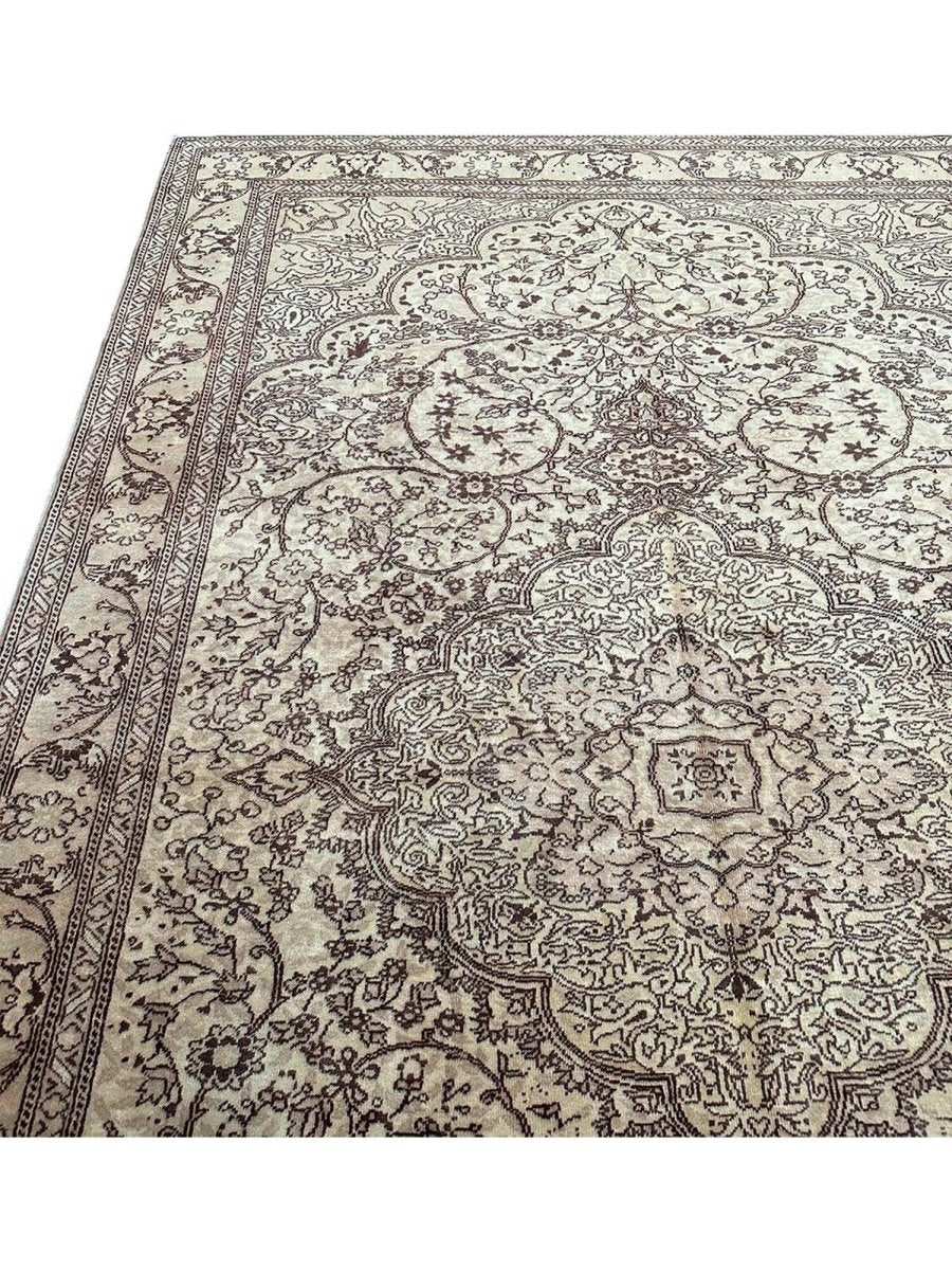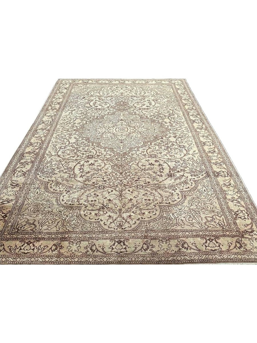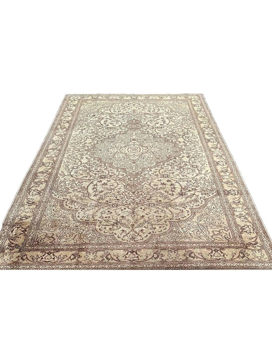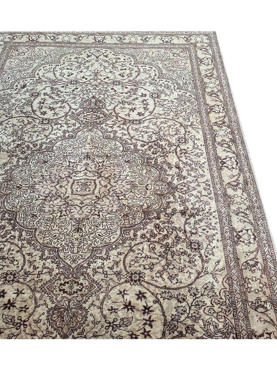 Experience the beauty of traditional Turkish craftsmanship with this exquisite 7x10 old Turkish Kaisari area rug. Hand-knotted in Turkey using a complete hand-ordered construction, this rug boasts exceptional quality and a unique medallion design. The neutral color palette, featuring beige, light brown, dark brown, and subtle white ivory accents, creates a soothing atmosphere, perfect for adding a touch of serenity to any room. The intricate floral pattern and detailing woven throughout the rug add a level of sophistication and elegance, giving off a sense of timeless elegance. Whether placed in a formal living room, cozy bedroom, or high-traffic hallway, this rug is sure to become a stunning focal point that ties the entire space together.