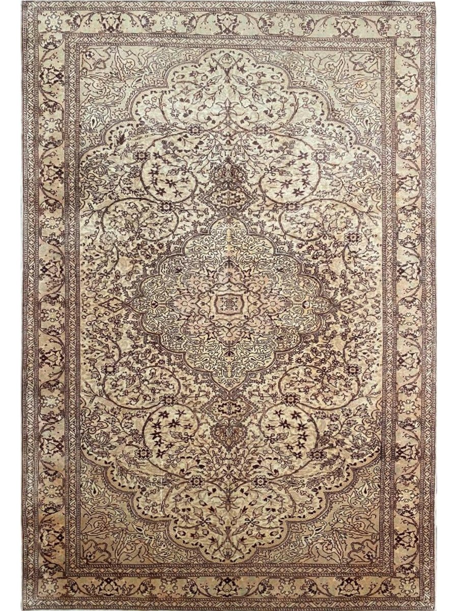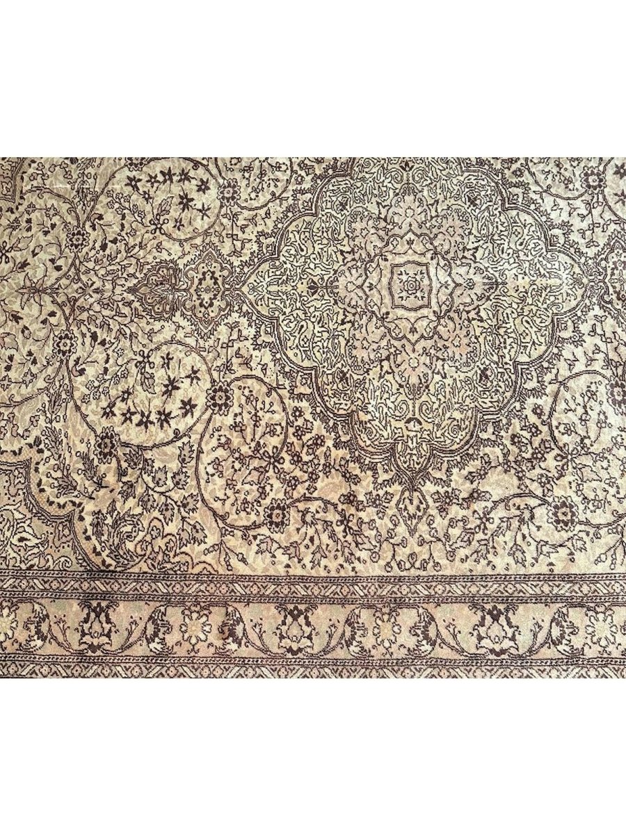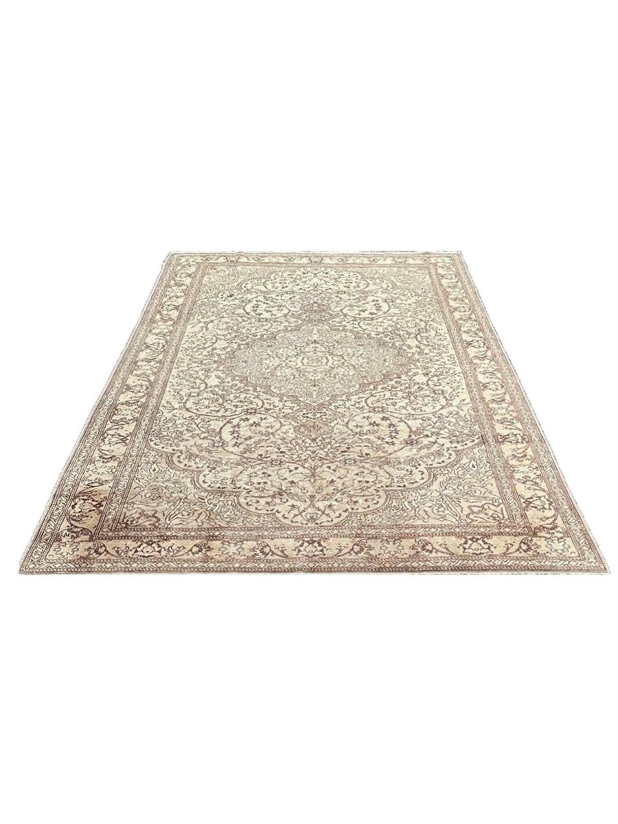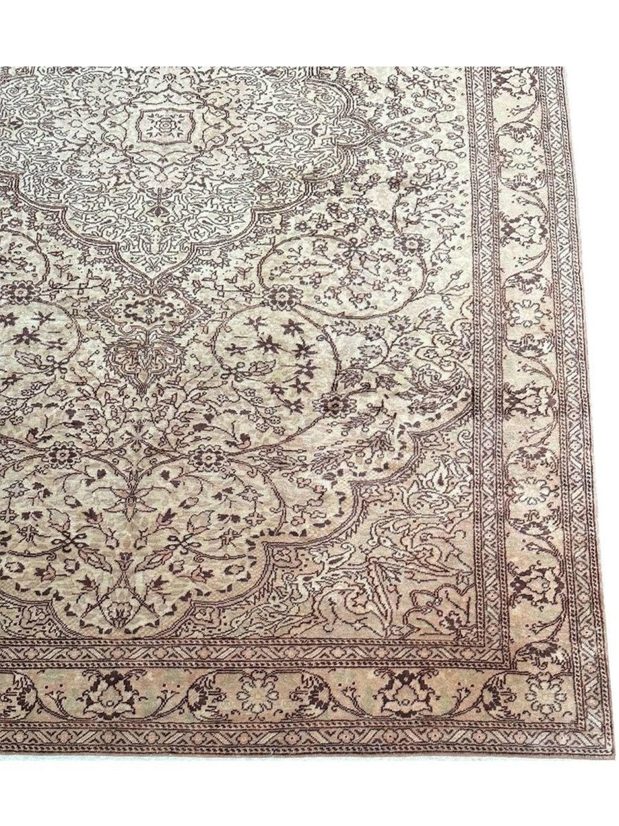 Experience the beauty of traditional Turkish craftsmanship with this exquisite 7x10 old Turkish Kaisari area rug. Hand-knotted in Turkey using a complete hand-ordered construction, this rug boasts exceptional quality and a unique medallion design. The neutral color palette, featuring beige, light brown, dark brown, and subtle white ivory accents, creates a soothing atmosphere, perfect for adding a touch of serenity to any room. The intricate floral pattern and detailing woven throughout the rug add a level of sophistication and elegance, giving off a sense of timeless elegance. Whether placed in a formal living room, cozy bedroom, or high-traffic hallway, this rug is sure to become a stunning focal point that ties the entire space together.