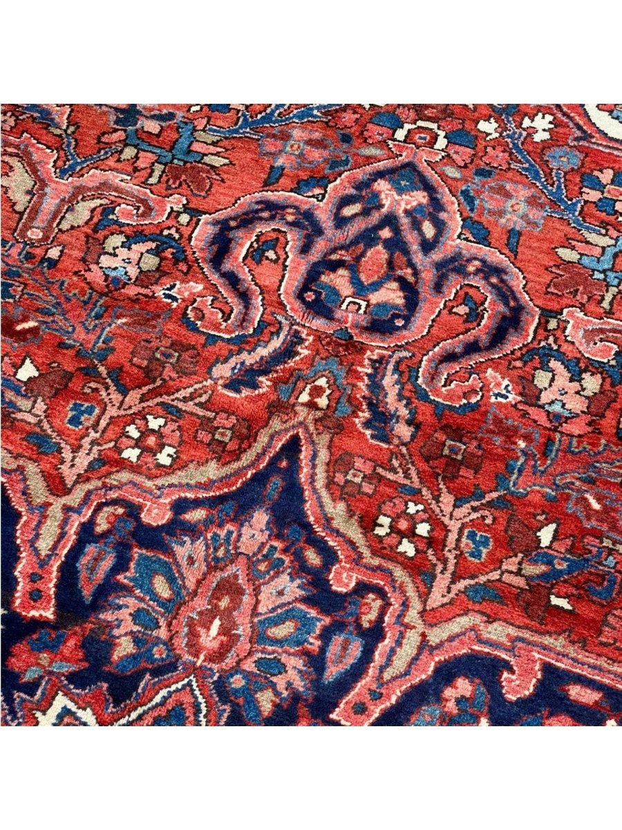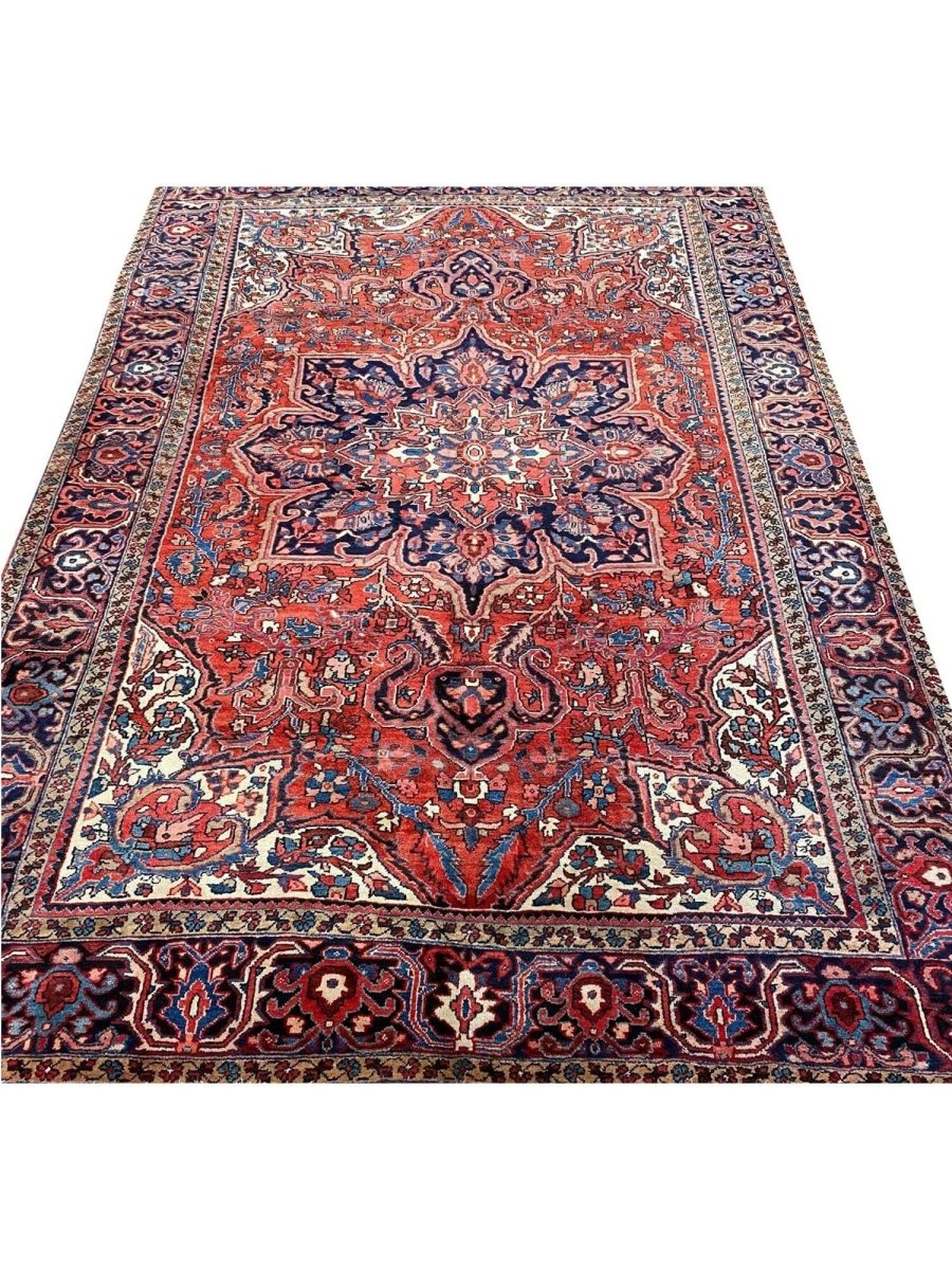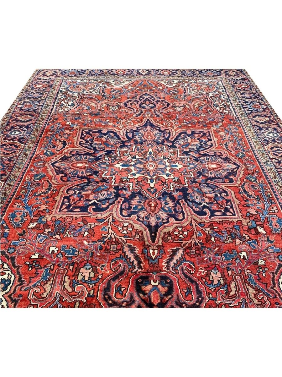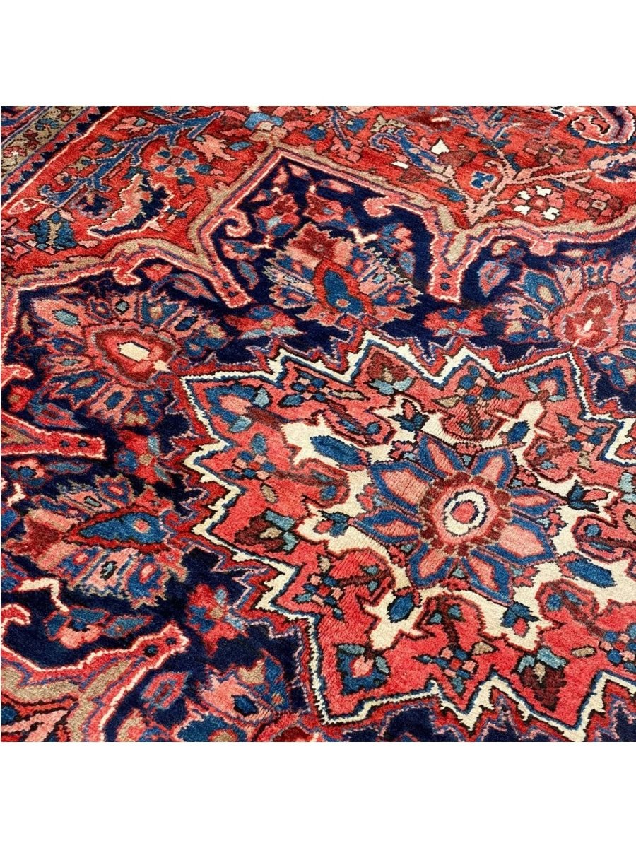 Discover the allure of this 8x12 Old Persian Heriz Area Rug, a unique accent that adds classic style to your house. This gorgeous traditional rug, which is hand-knotted from premium wool, has a medallion design that gives personality to any room. It produces a cozy and welcoming ambiance and is ideal for living rooms, bedrooms, dining halls, or as a focal point in your foyer. Its amazing combination of red, blue, ivory, black, and pink hues make it a great option for a variety of styles. This outstanding sculpture acts as a stunning piece of art in addition to enhancing your decor. Take advantage of free US delivery.