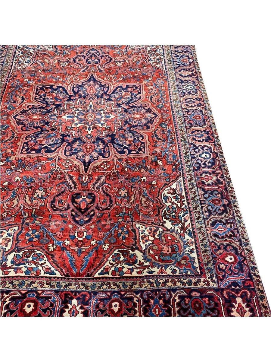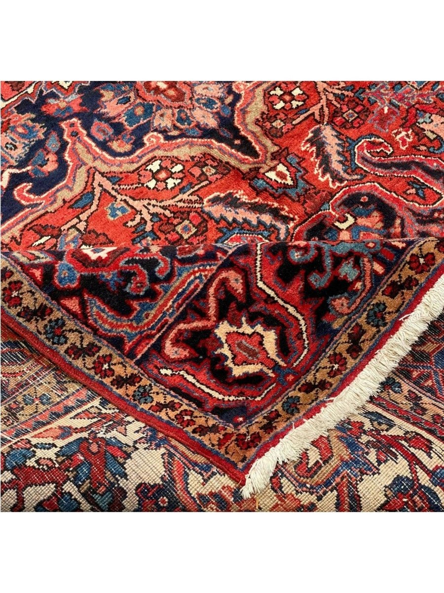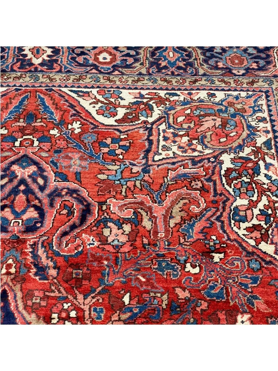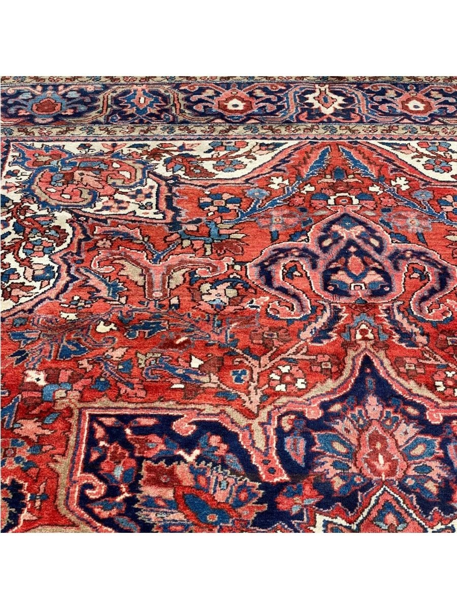 Discover the allure of this 8x12 Old Persian Heriz Area Rug, a unique accent that adds classic style to your house. This gorgeous traditional rug, which is hand-knotted from premium wool, has a medallion design that gives personality to any room. It produces a cozy and welcoming ambiance and is ideal for living rooms, bedrooms, dining halls, or as a focal point in your foyer. Its amazing combination of red, blue, ivory, black, and pink hues make it a great option for a variety of styles. This outstanding sculpture acts as a stunning piece of art in addition to enhancing your decor. Take advantage of free US delivery.