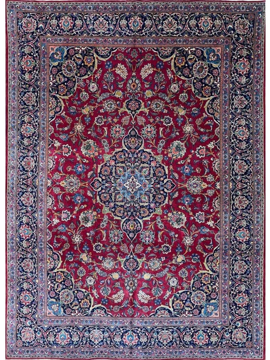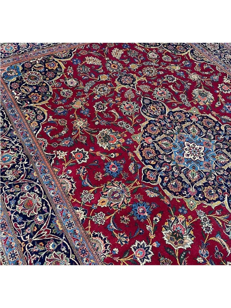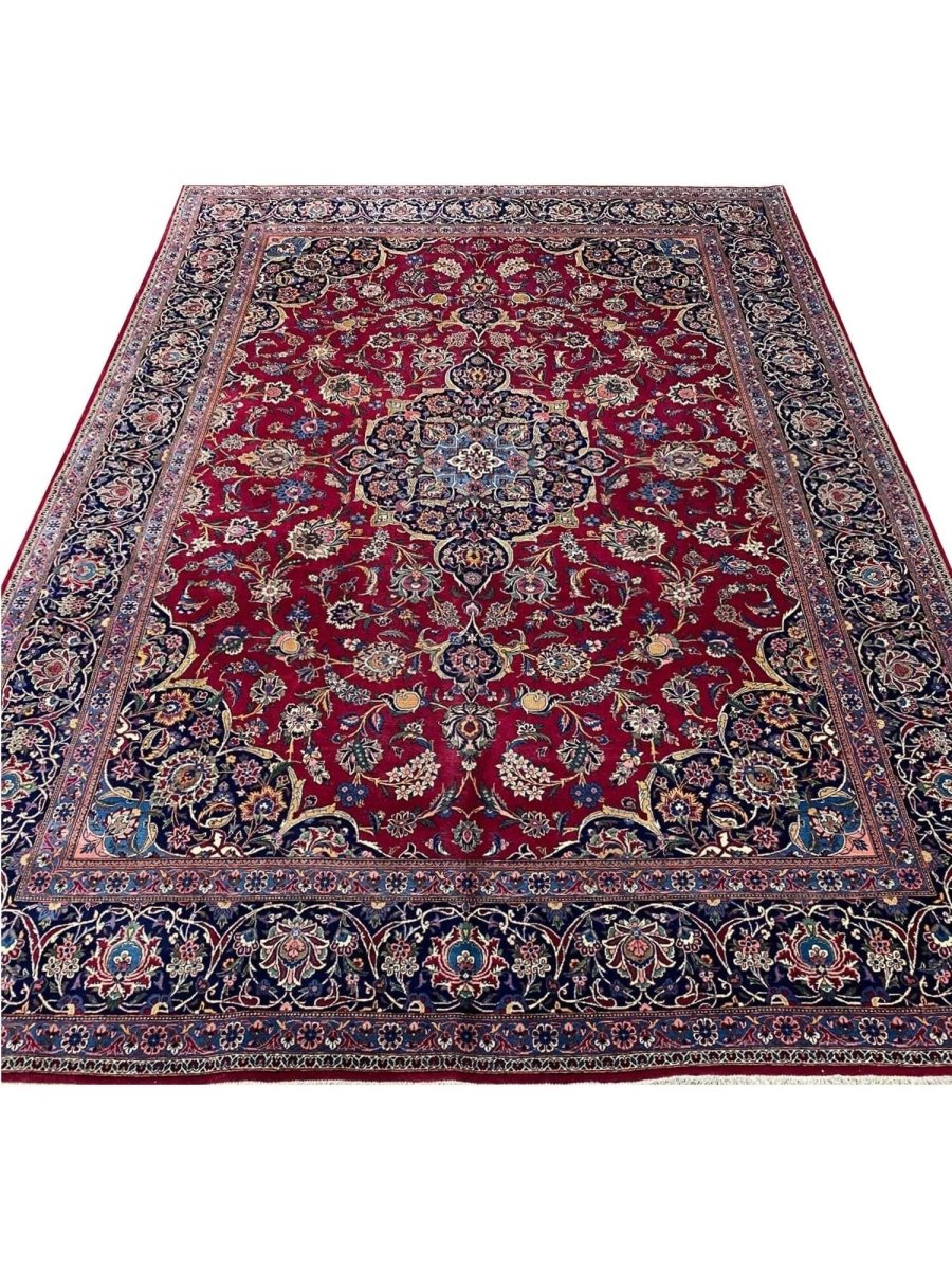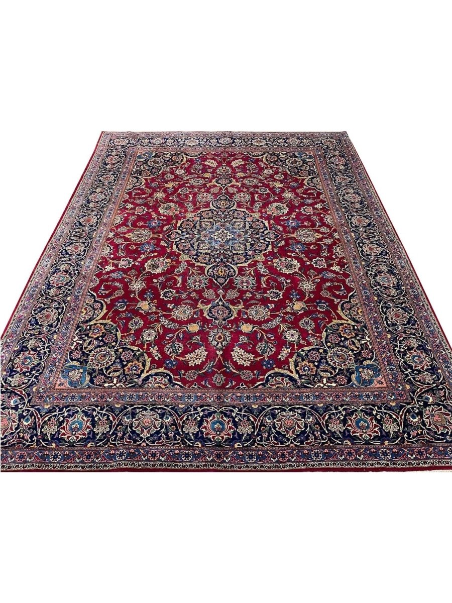 Add a touch of casual style to your home with this 9x12 Old Persian Kashan Area Rug, crafted in Persia. This rug features a captivating medallion pattern, showcasing a simple yet effective design in a burgundy, black ,beige, and blue palette. Its durable wool construction ensures longevity and easy care, perfect for living rooms, bedrooms, and dining spaces. The clean finish reflects quality craftsmanship and design. This piece effortlessly brightens, adding warmth, texture, and a relaxed feel. A blend of simple design and function, it easily enhances any space. Enjoy the benefit of free shipping across the United States. Each rug offers a distinct look, with subtle variations inherent to its creation.