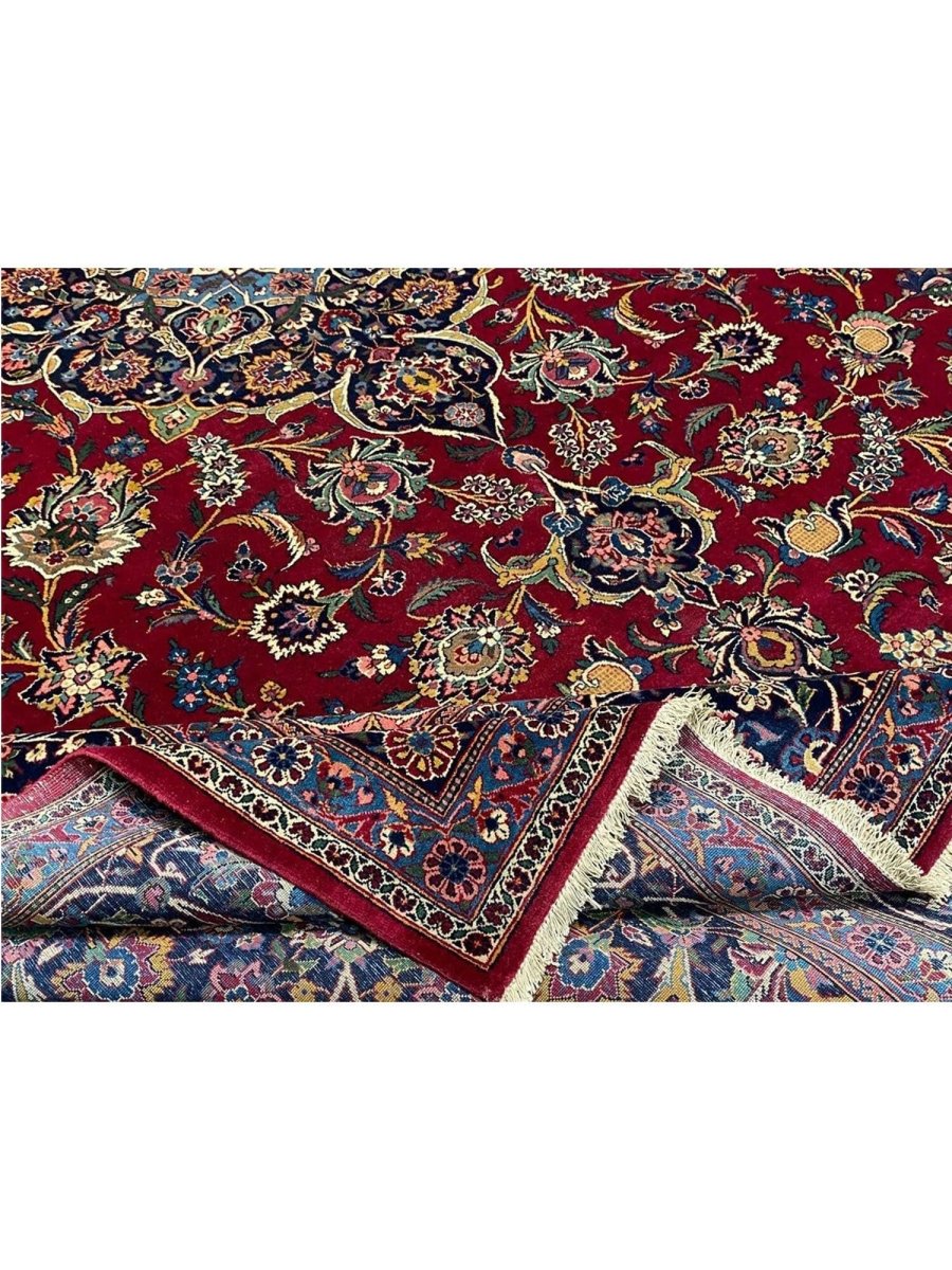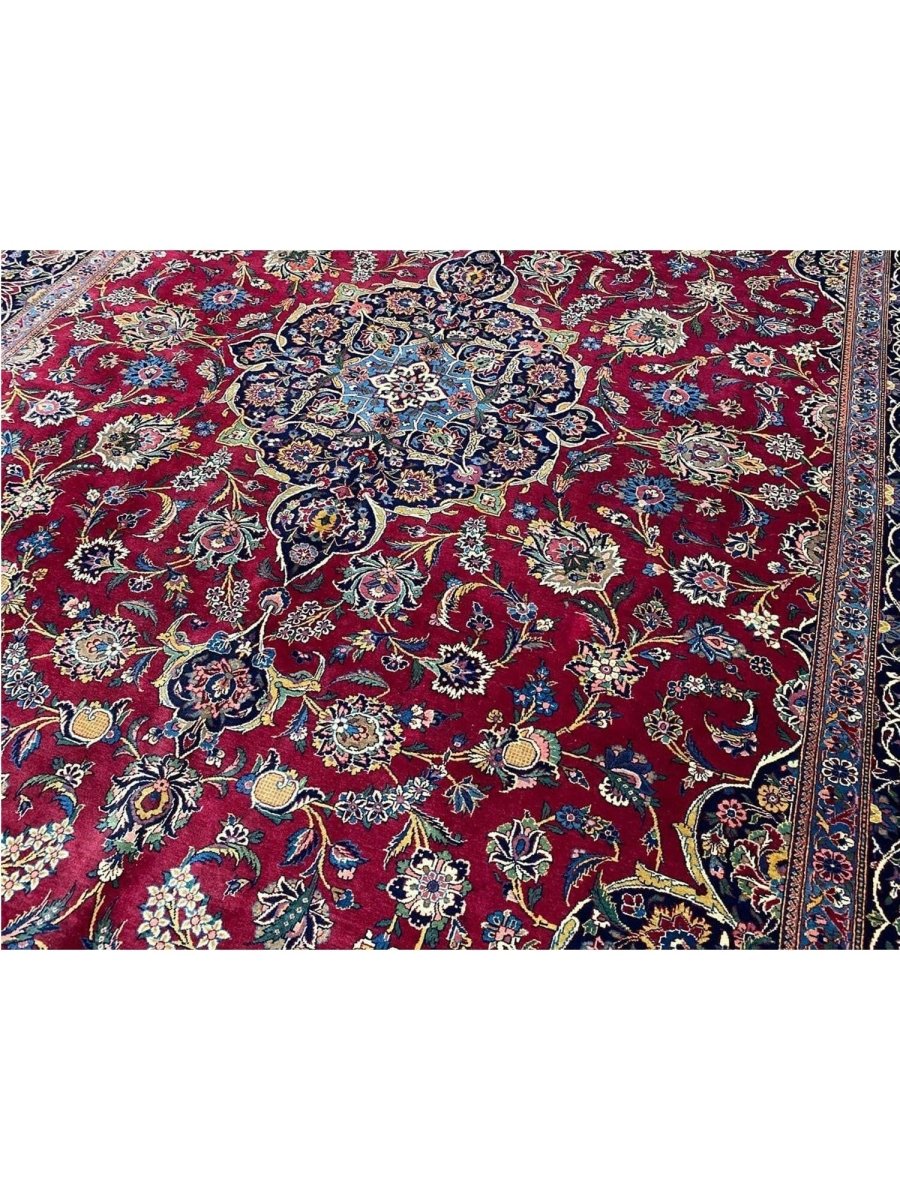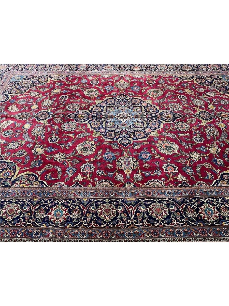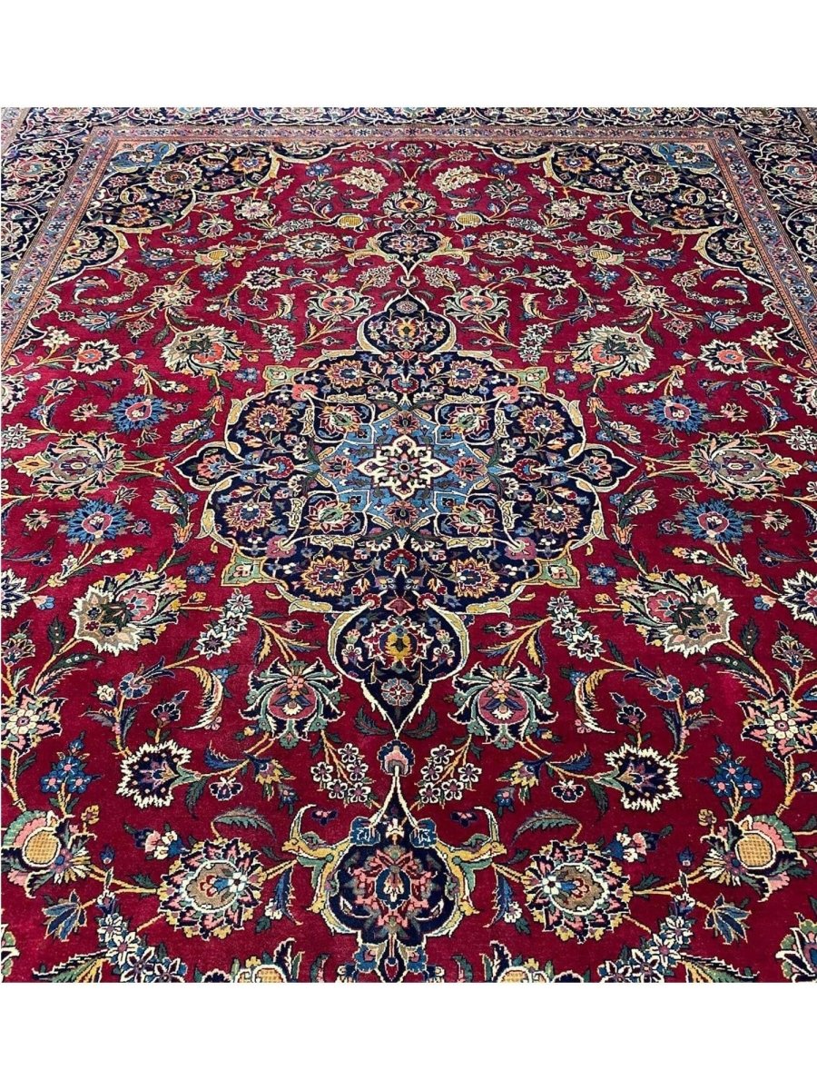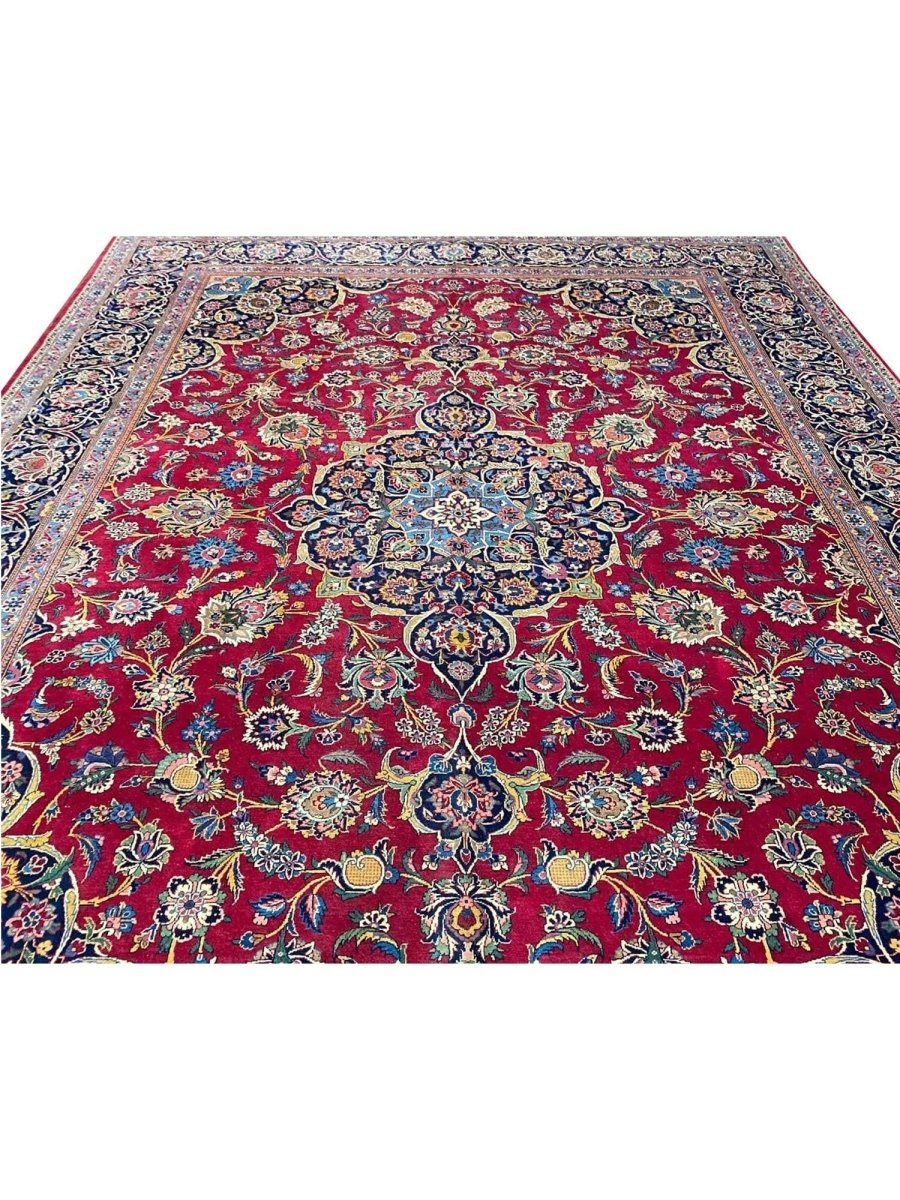 Add a touch of casual style to your home with this 9x12 Old Persian Kashan Area Rug, crafted in Persia. This rug features a captivating medallion pattern, showcasing a simple yet effective design in a burgundy, black ,beige, and blue palette. Its durable wool construction ensures longevity and easy care, perfect for living rooms, bedrooms, and dining spaces. The clean finish reflects quality craftsmanship and design. This piece effortlessly brightens, adding warmth, texture, and a relaxed feel. A blend of simple design and function, it easily enhances any space. Enjoy the benefit of free shipping across the United States. Each rug offers a distinct look, with subtle variations inherent to its creation.