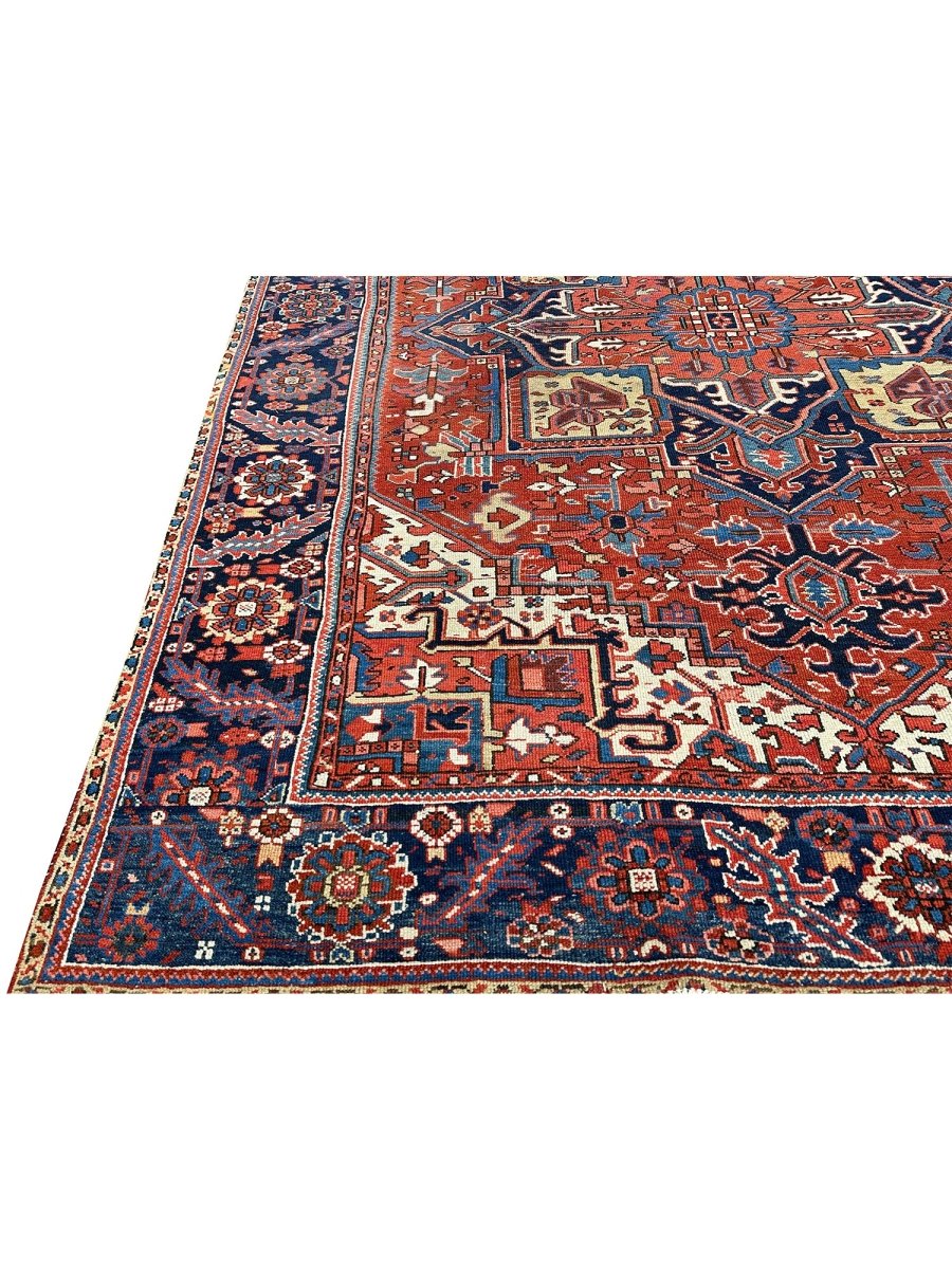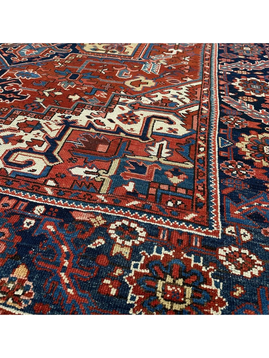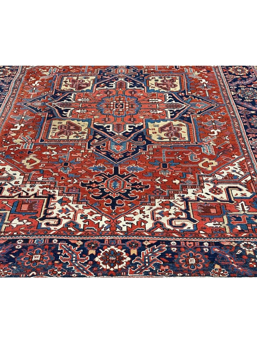Transform your living area with the 8x11 Antique Persian Heriz Rug, a unique find that adds a touch of classic elegance to any room. This stunning traditional rug, crafted from high-quality wool, features a geometric design that enhances your interior decor. It creates an inviting atmosphere its rich hues of red, navy blue, beige, and white make it a versatile addition to your home. Beyond its practical use, this remarkable rug serves as a beautiful focal point in your space. Enjoy free US delivery.