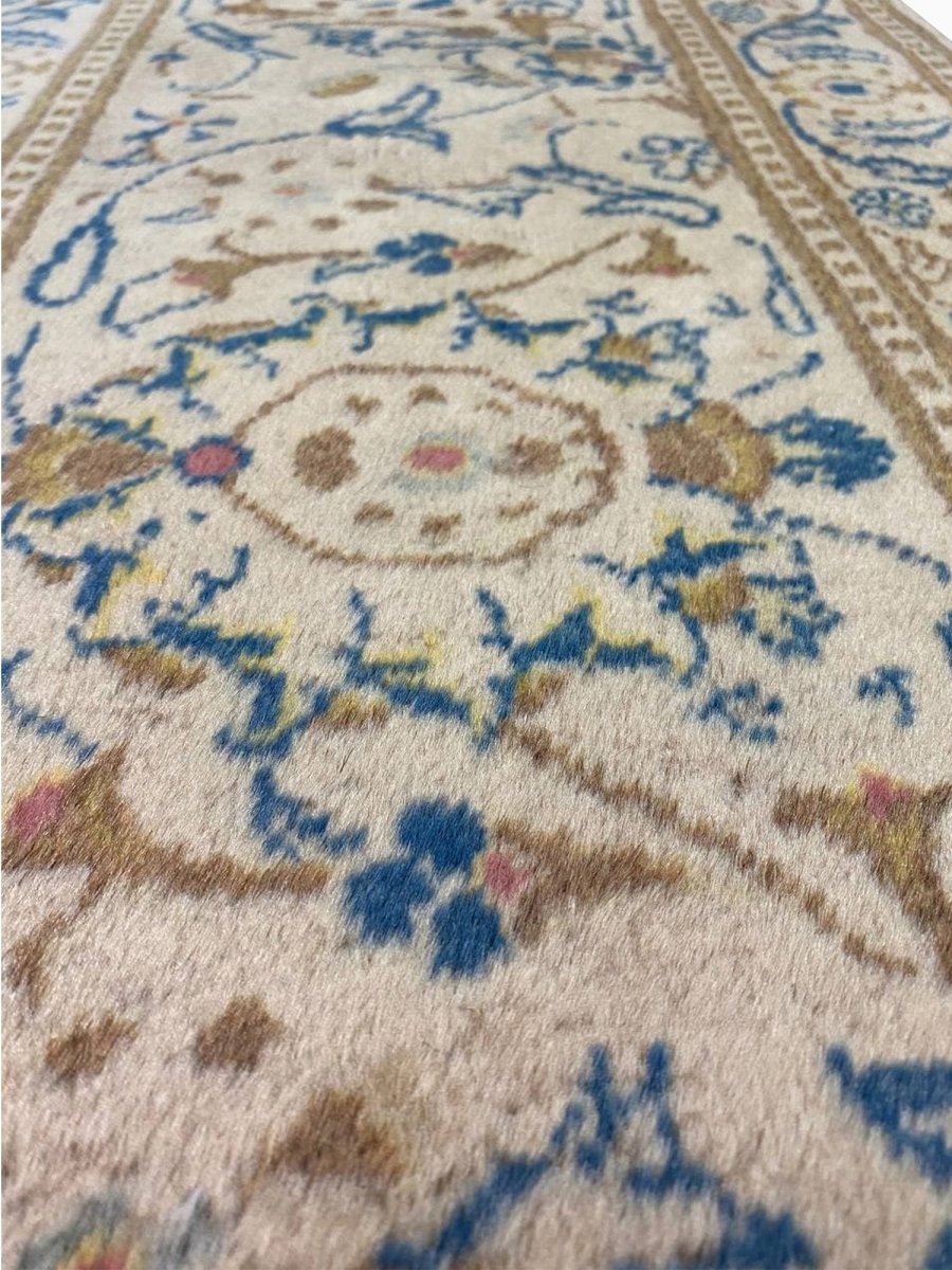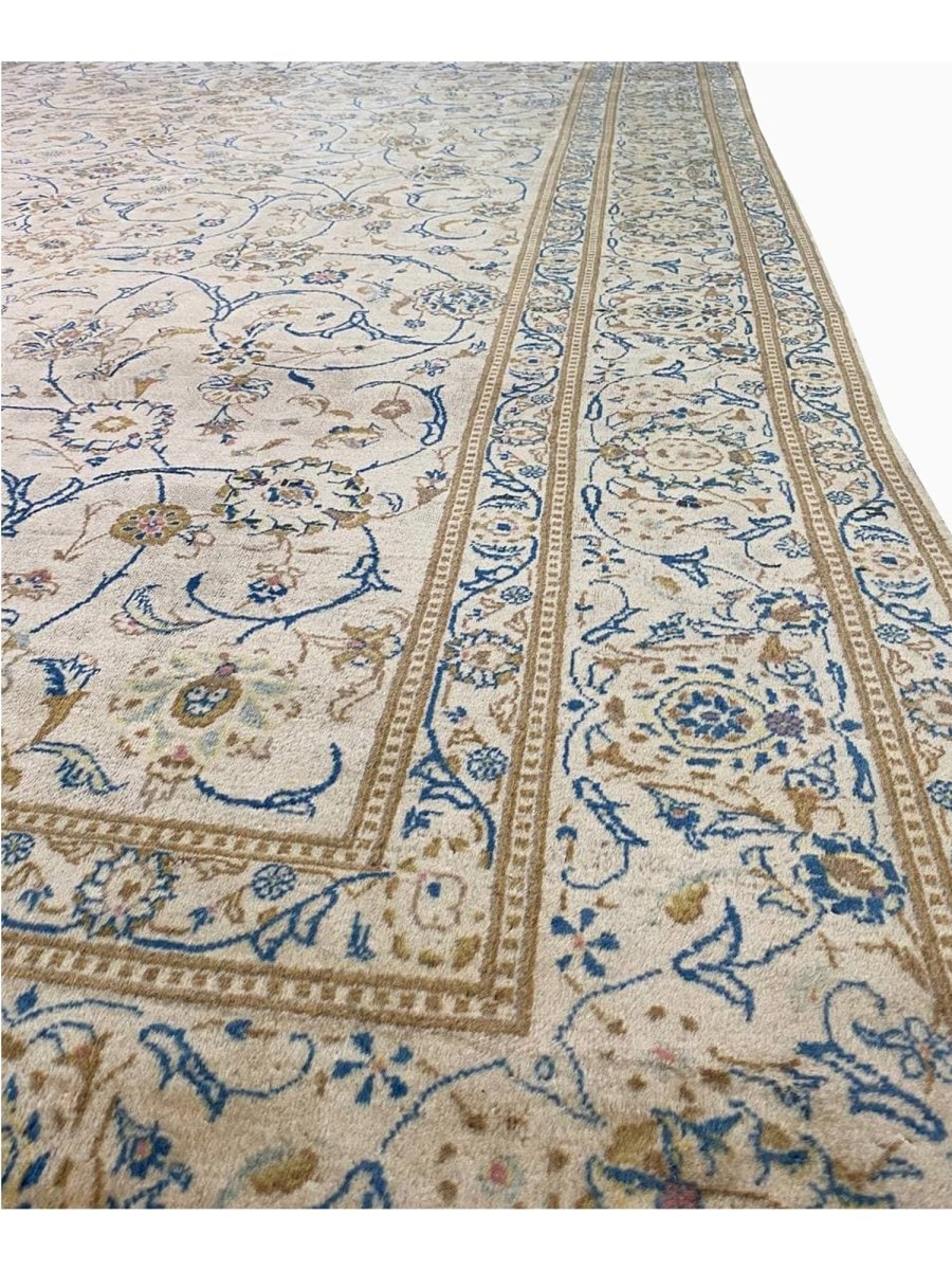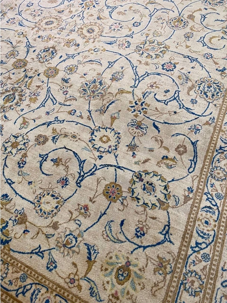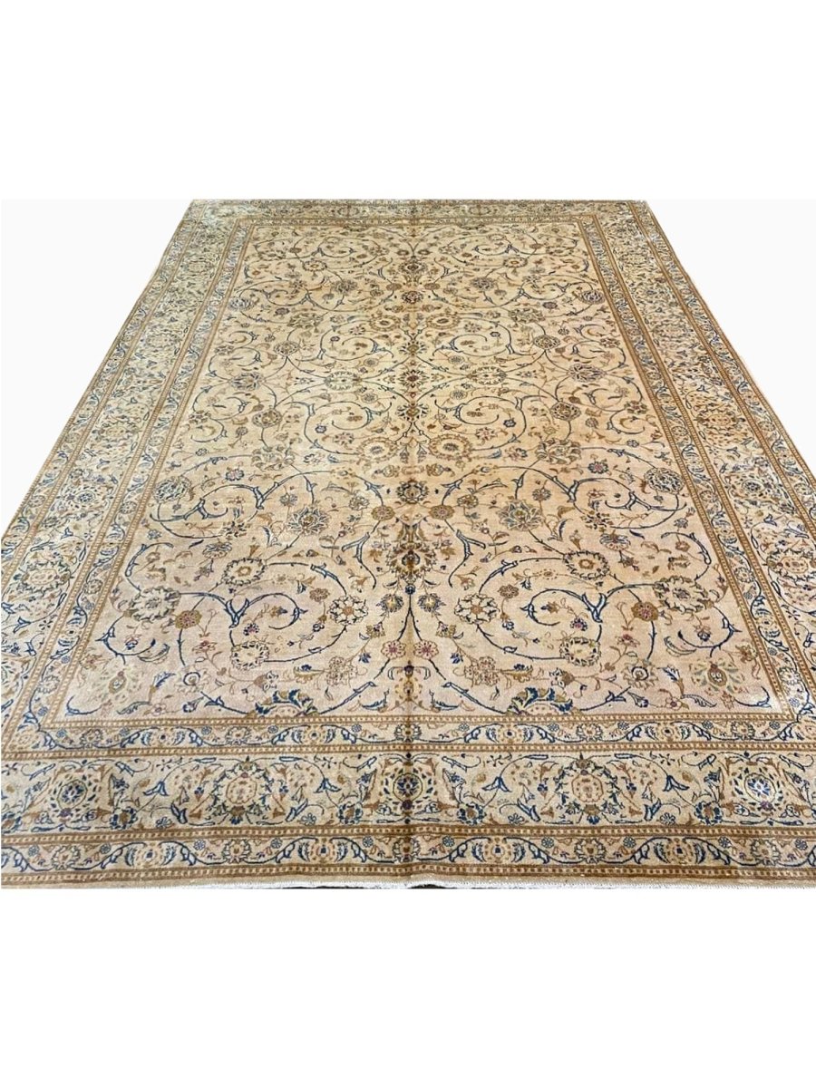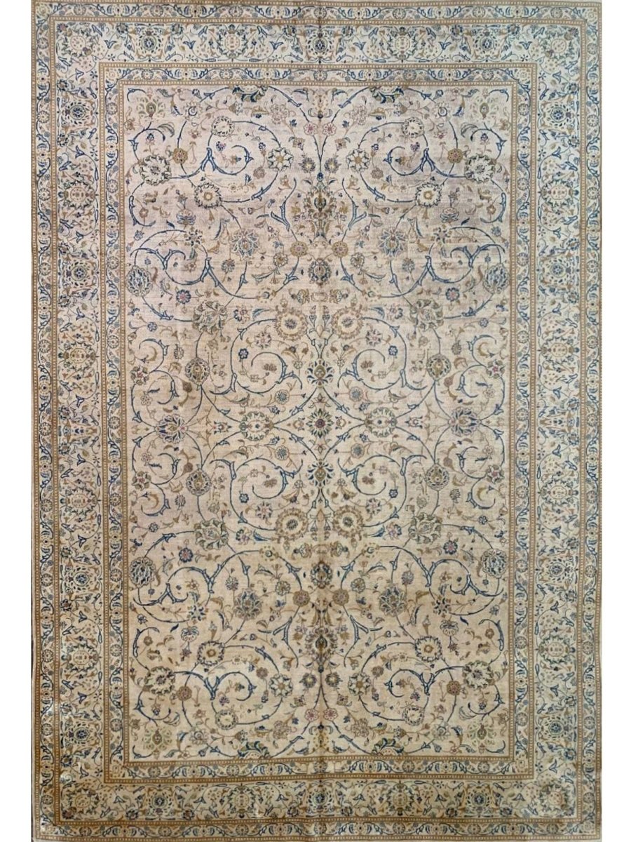 Add a touch of casual style to your home with this 9x14 Antique Persian Kashan Area Rug, crafted in Persia. This traditional rug features a captivating floral pattern, showcasing a simple yet effective design in a soft beige, brown, and blue palette. Its durable wool construction ensures longevity and easy care, perfect for living rooms, bedrooms, and dining spaces. The clean finish reflects quality craftsmanship and design. This piece effortlessly brightens, adding warmth, texture, and a relaxed feel. A blend of simple design and function, it easily enhances any space. Enjoy the benefit of free shipping across the United States. Each rug offers a distinct look, with subtle variations inherent to its creation.