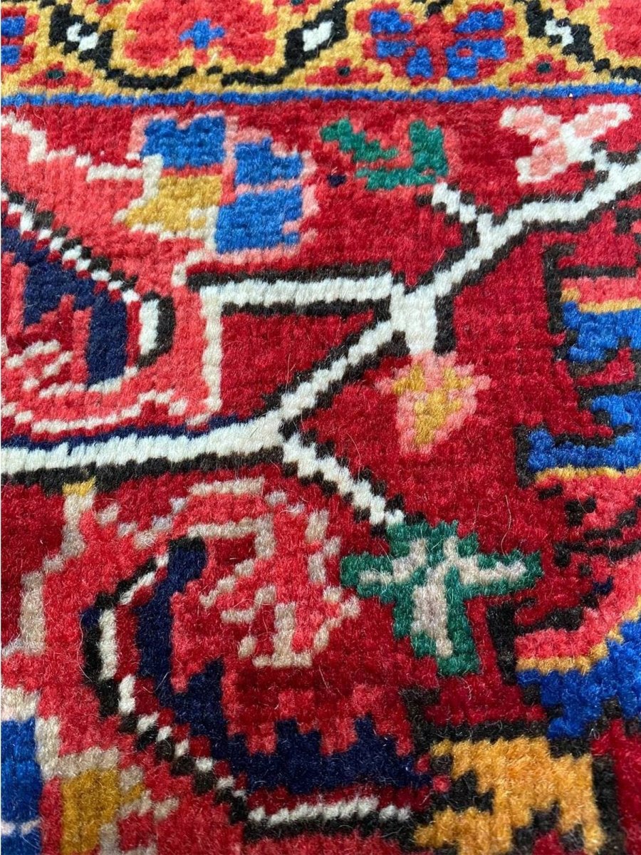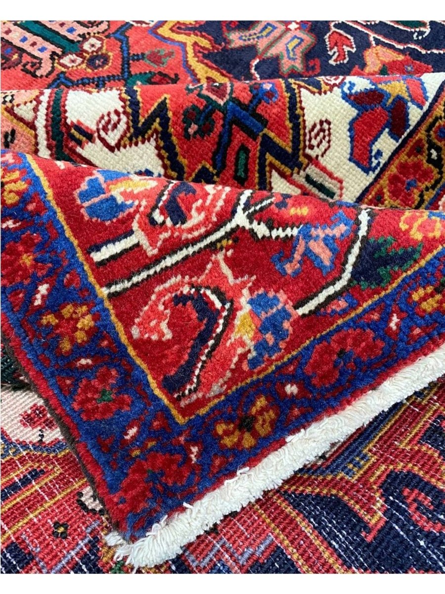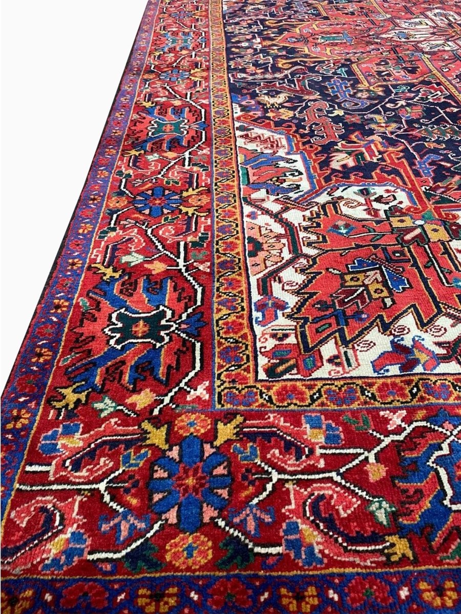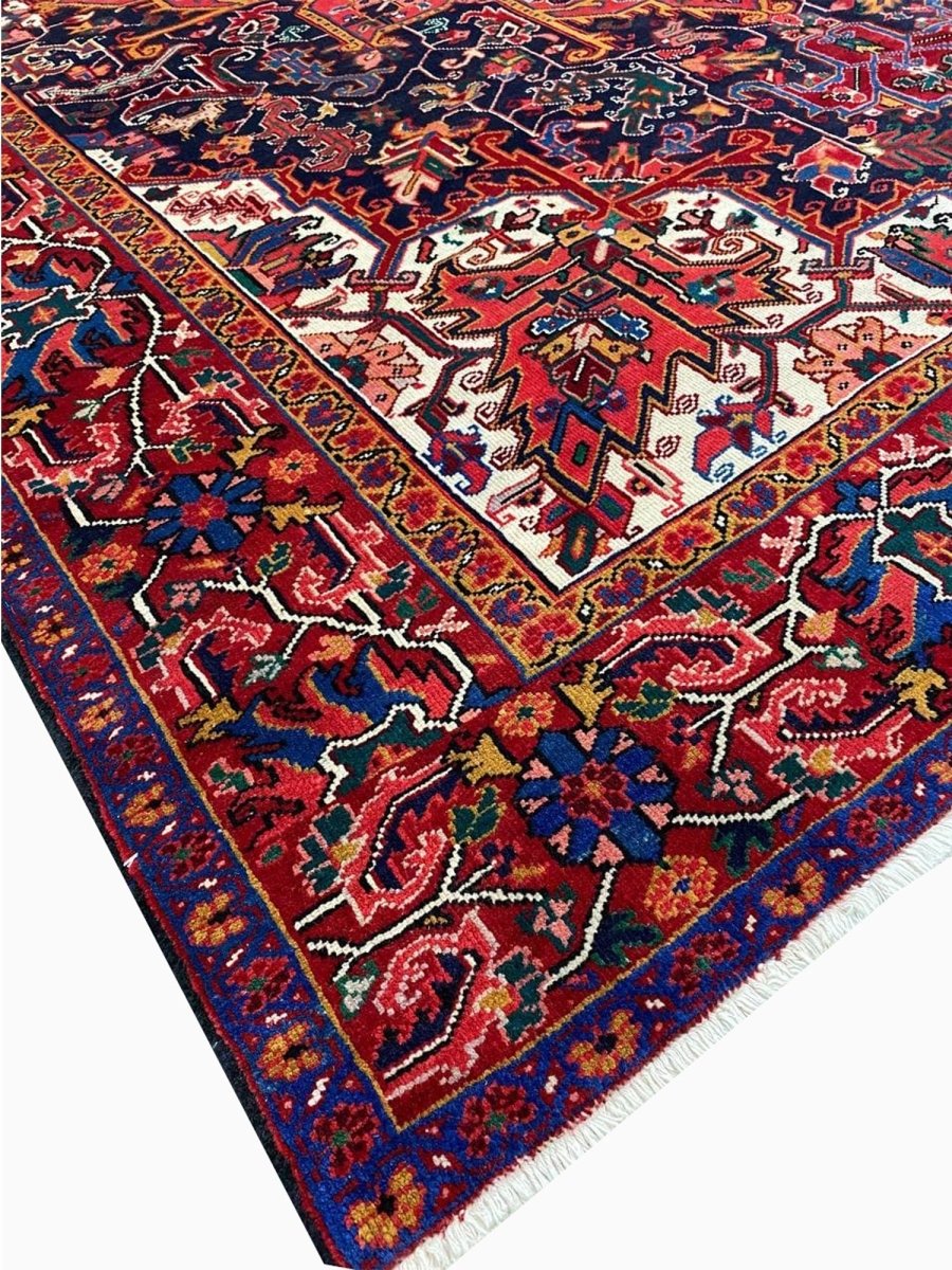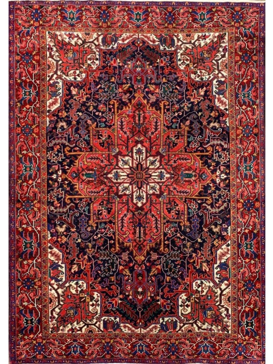 The 8x11 Old Persian Heriz Area Rug, is a unique treasure that embodies the rich history of Persian weaving and will elevate your decor. Made from high-quality wool, this gorgeous rug features a medallion design that blends in perfectly with any type of interior design. It provides a friendly atmosphere and is perfect for large dining rooms, comfortable living spaces, or as a chic addition in your workplace. It is a flexible addition to your house because of the rich blend of red, blue, peach, ivory tones that offer depth and character. This amazing traditional rug is a stunning work of art that elevates your living area and goes beyond simple decoration. Take advantage of free US delivery.
