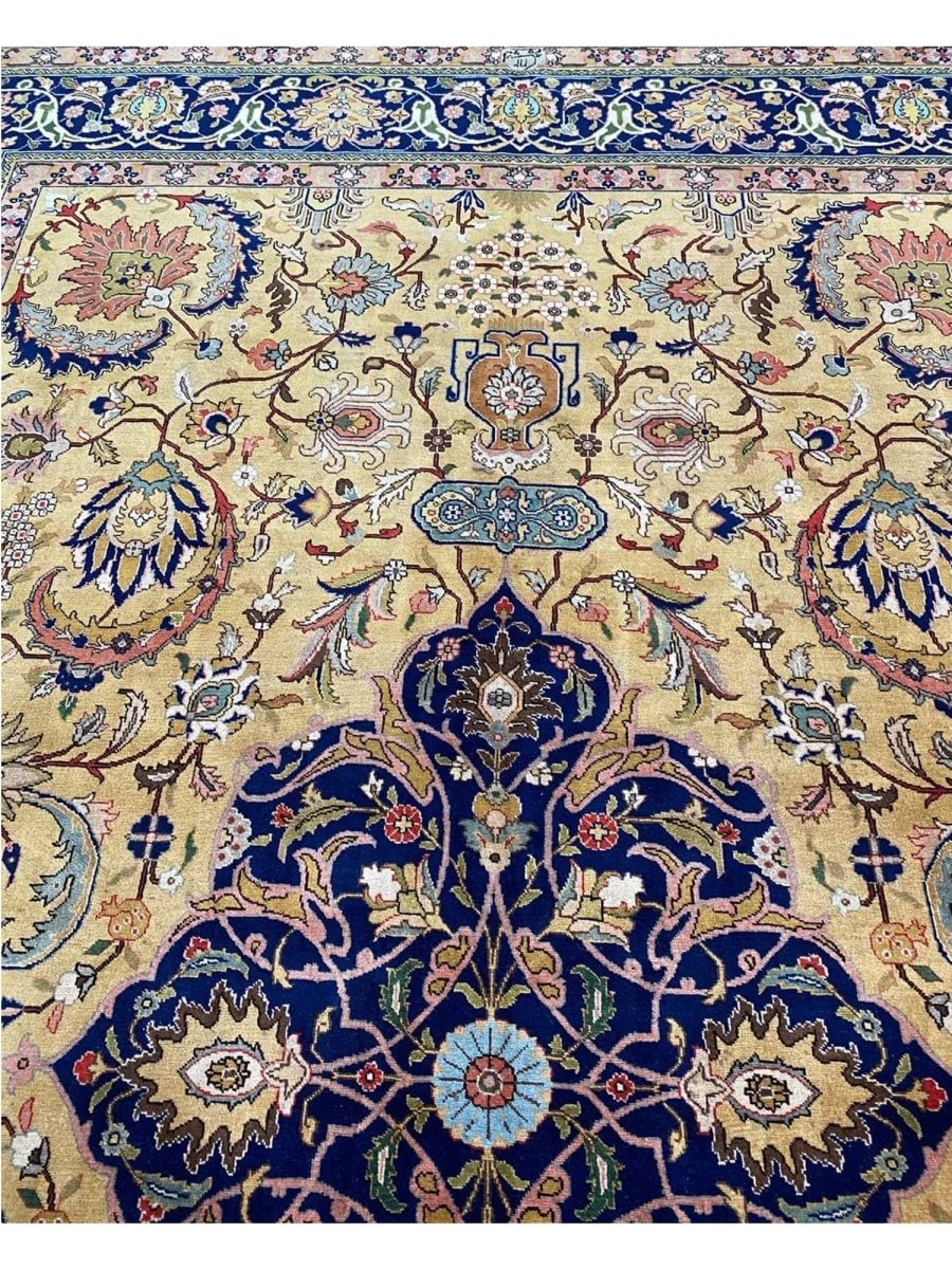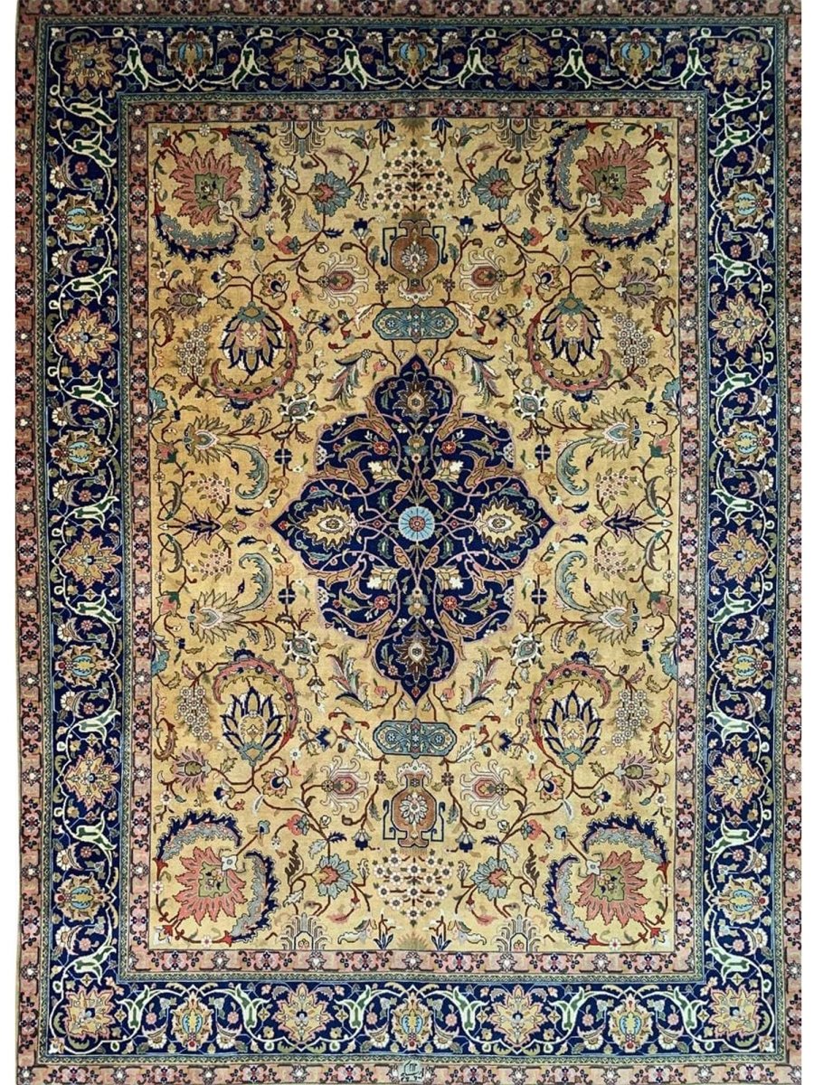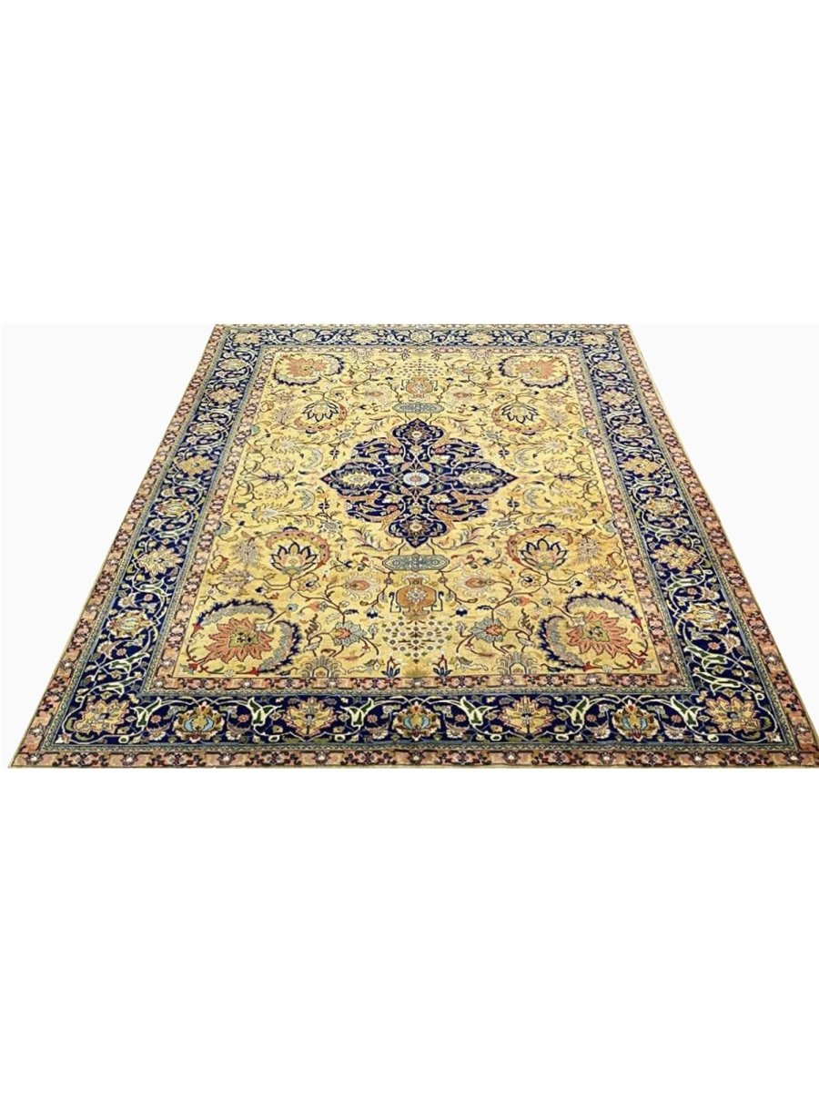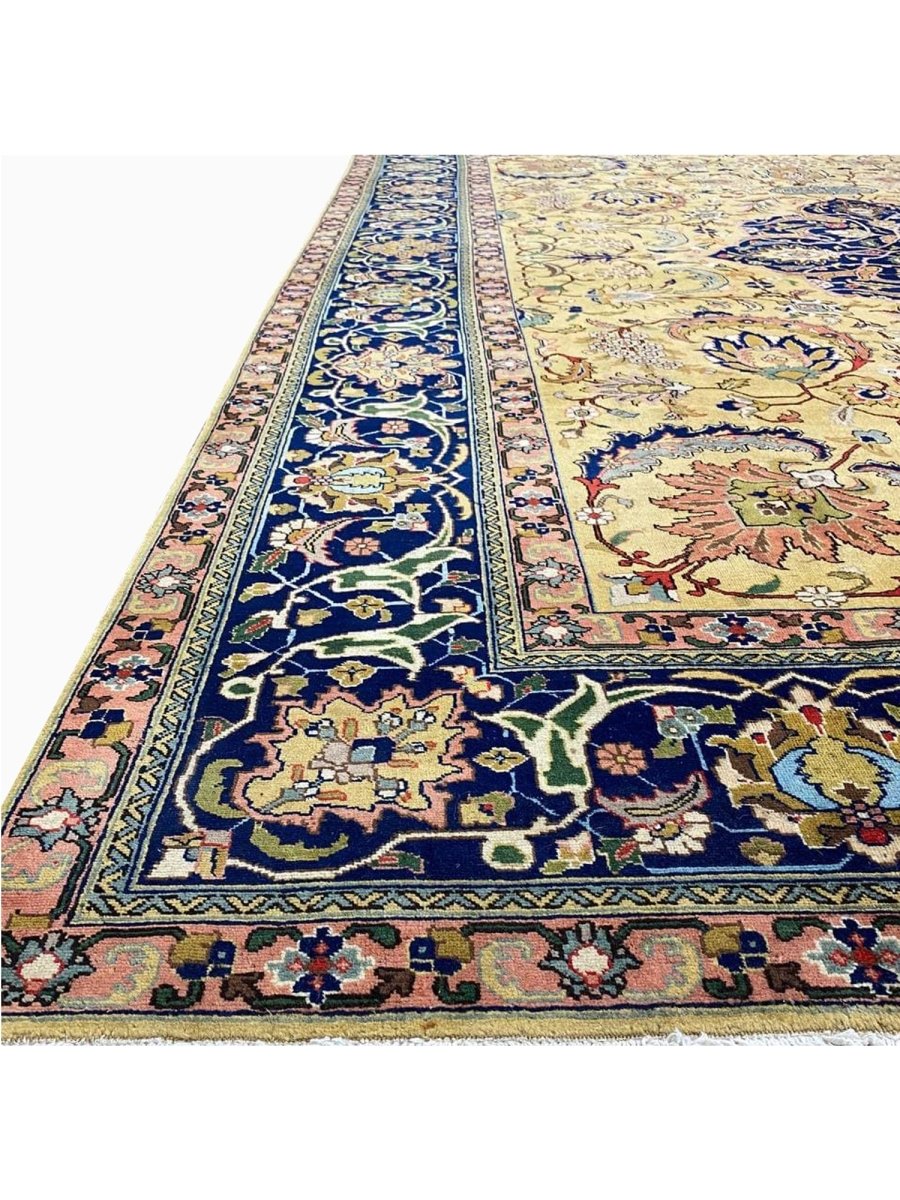 Discover the captivating appeal of the 9x13 Old Persian Tabriz Area Rug, a unique accent that adds classic style to your home. This gorgeous traditional rug, hand-knotted from premium wool, features a beautiful design with medallion motifs that brings personality to any room. It creates a cozy and welcoming ambiance and is ideal for dining tables, living rooms, or as a focal point in your foyer. Its beautiful blend of blue, peach, gold, and green hues makes it a versatile choice for various designs. This outstanding piece serves as a stunning work of art while enhancing your decor. Take advantage of free US delivery.