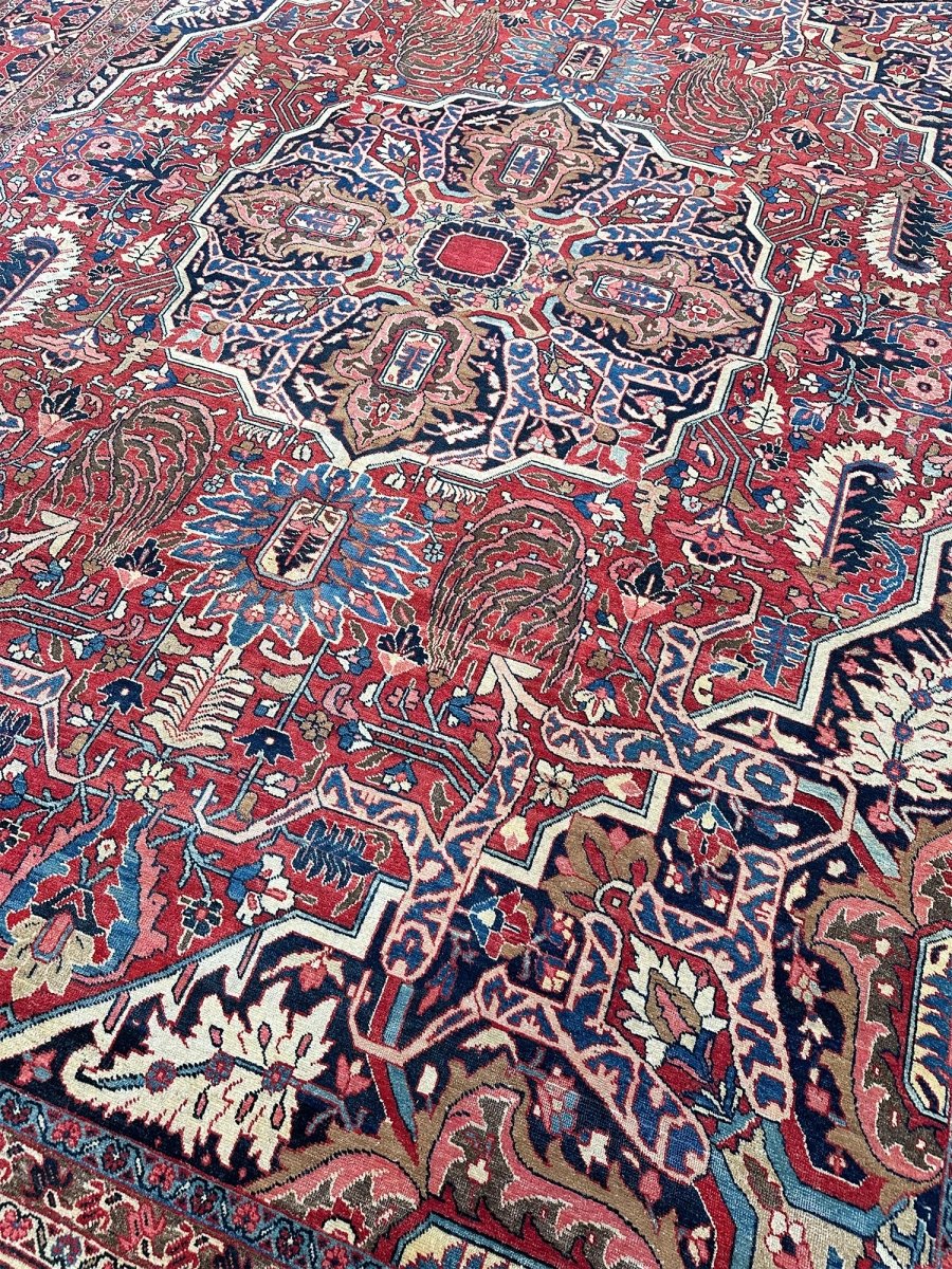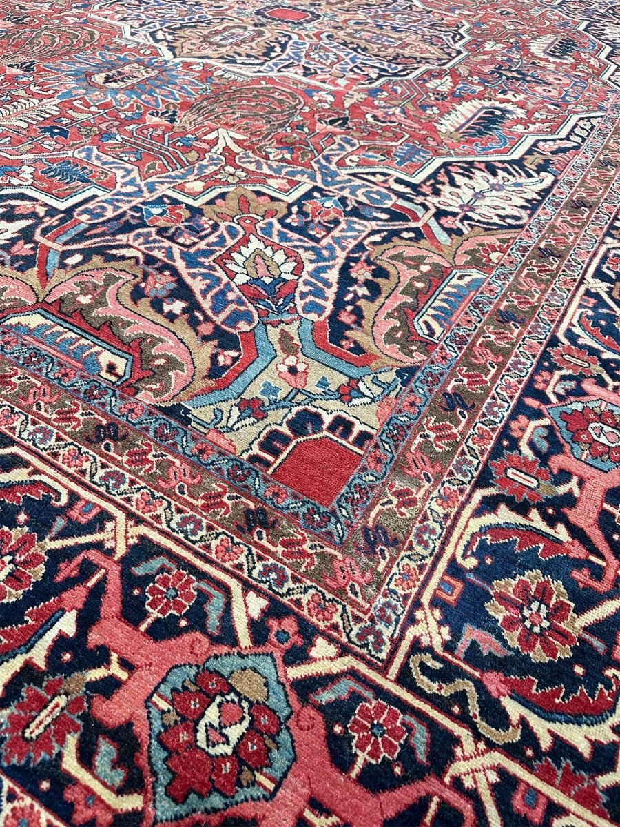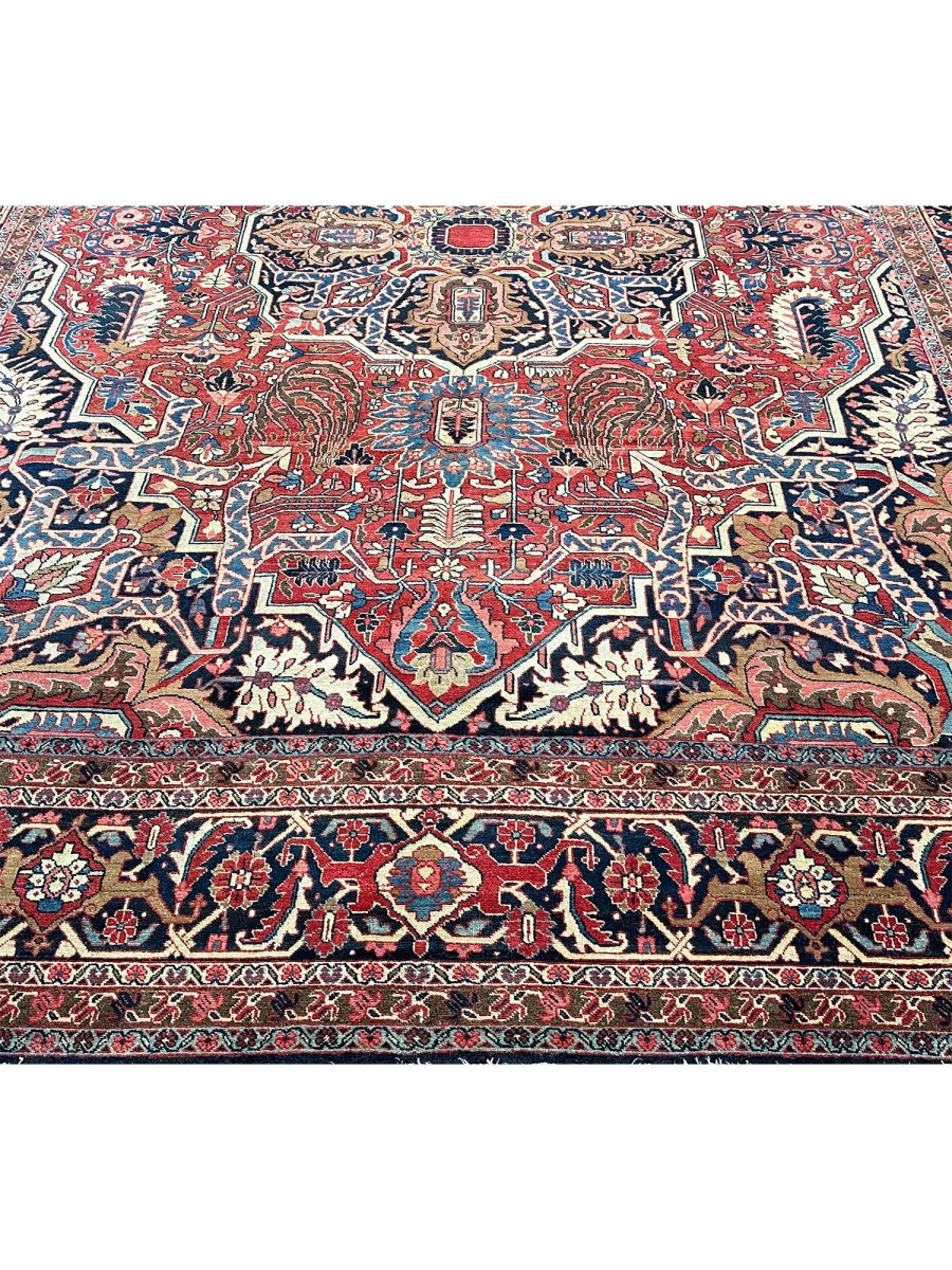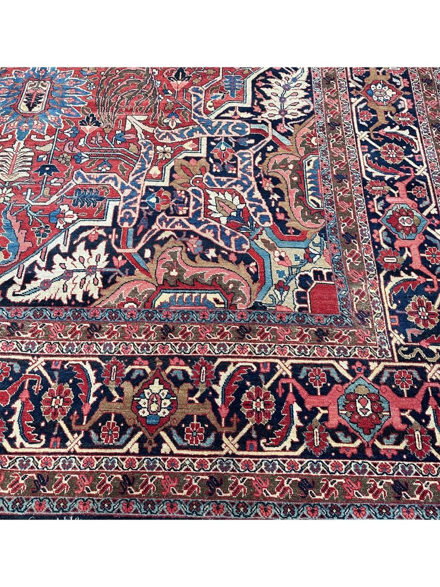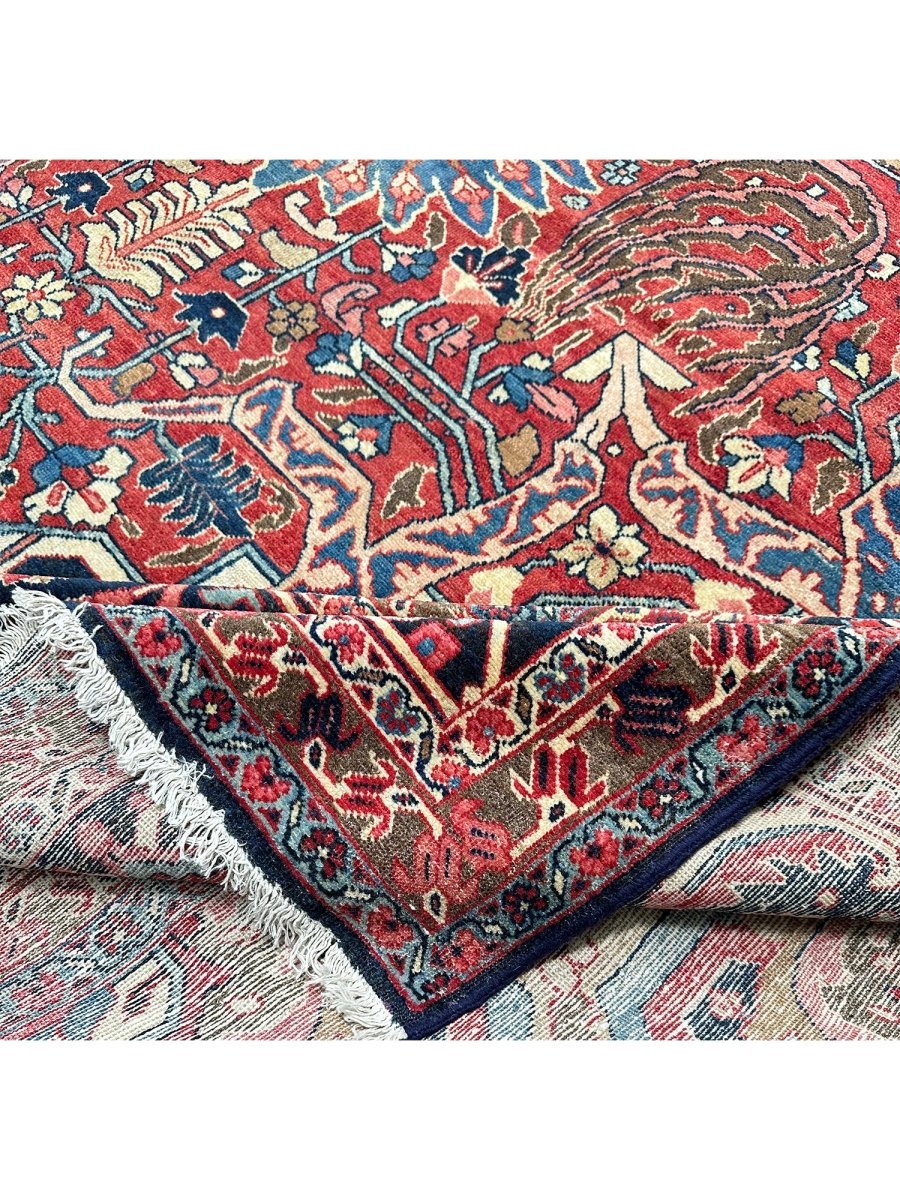 With this exquisite 11x14 Antique Persian Heriz rug, you may step into luxury. It features a stunning geometric pattern and is hand-knotted from excellent wool in Persia. Bold forms and a central medallion are featured throughout the design, which is outlined in light blue, green, and beige and features a compelling red field with dark blue borders. This considerable size adds classic beauty and opulent comfort. The careful craftsmanship guarantees long-lasting quality. This rug is a genuine tribute to the Persian weaving tradition and adds a touch of beauty and history to your home.