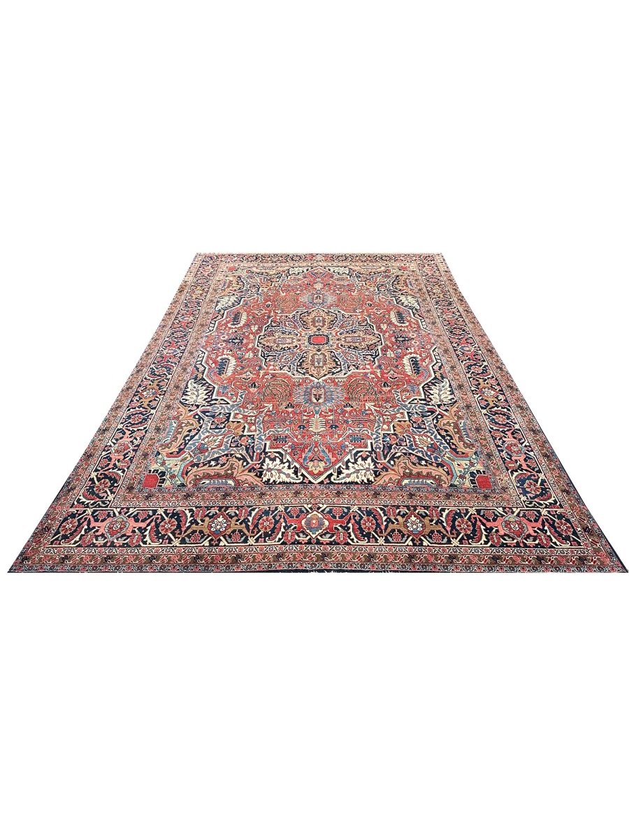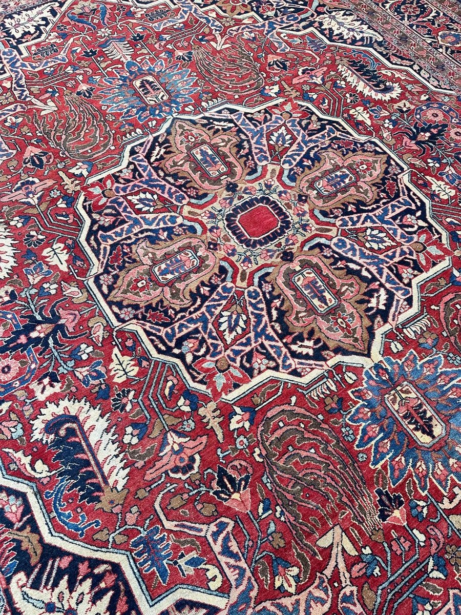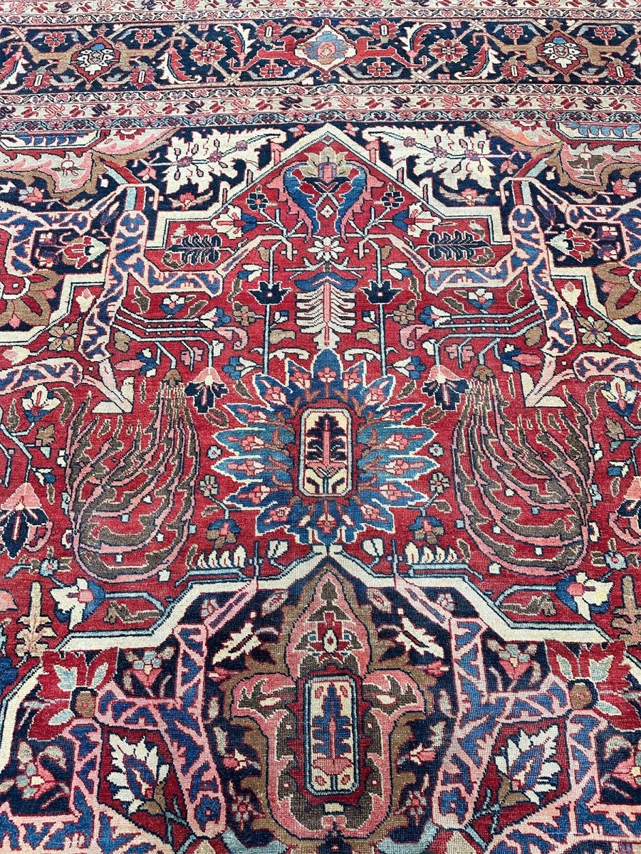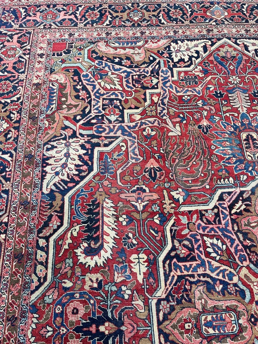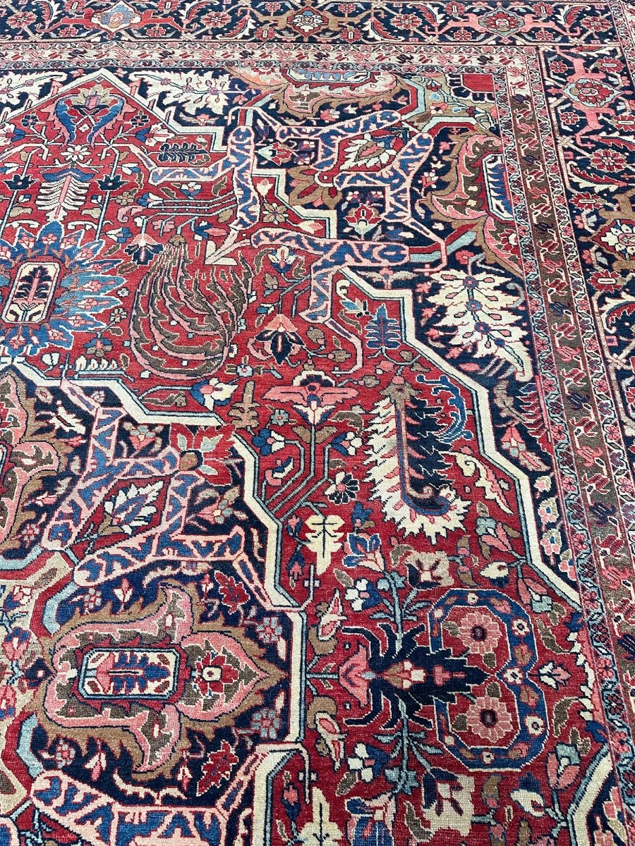 With this exquisite 11x14 Antique Persian Heriz rug, you may step into luxury. It features a stunning geometric pattern and is hand-knotted from excellent wool in Persia. Bold forms and a central medallion are featured throughout the design, which is outlined in light blue, green, and beige and features a compelling red field with dark blue borders. This considerable size adds classic beauty and opulent comfort. The careful craftsmanship guarantees long-lasting quality. This rug is a genuine tribute to the Persian weaving tradition and adds a touch of beauty and history to your home.