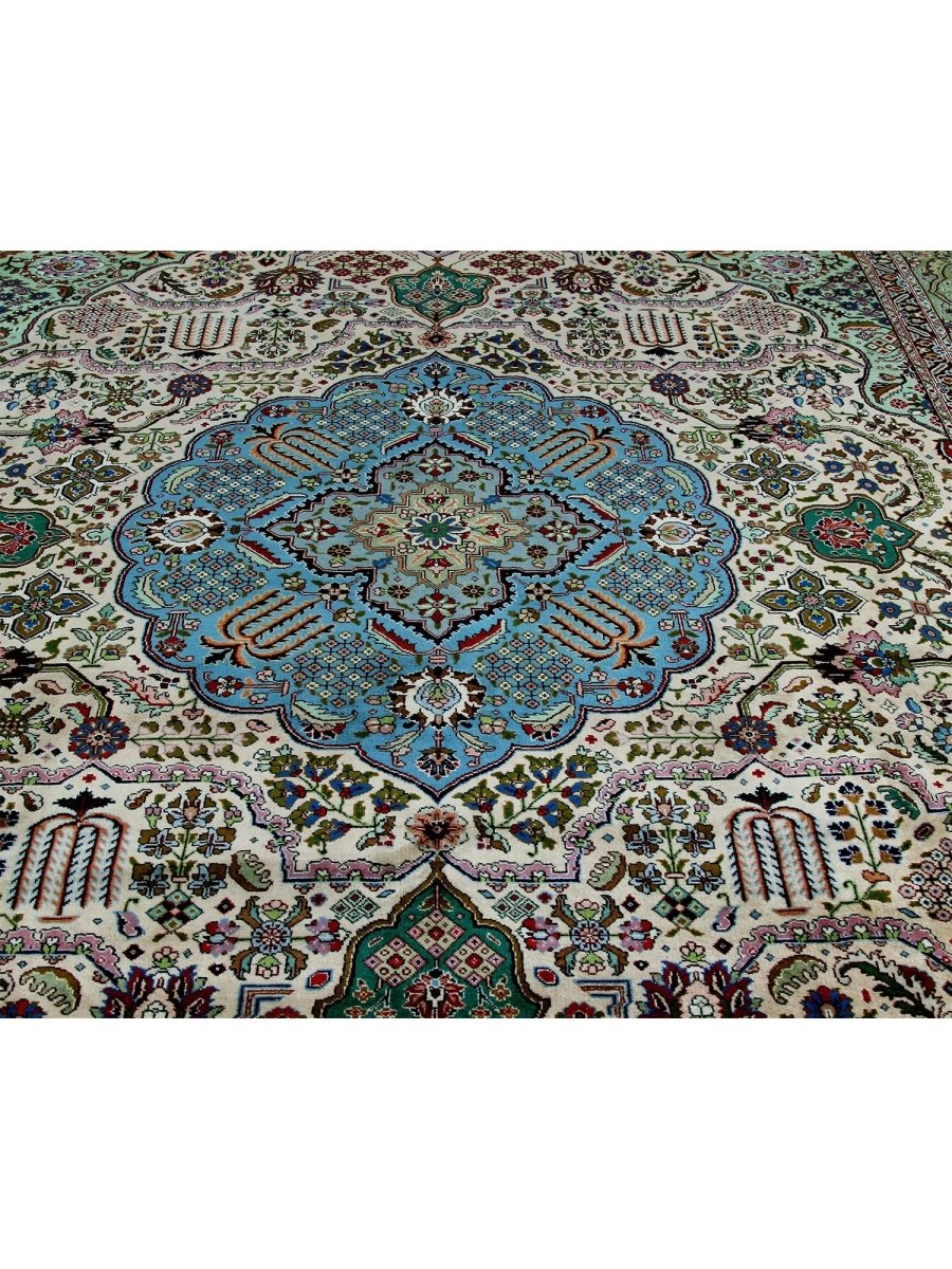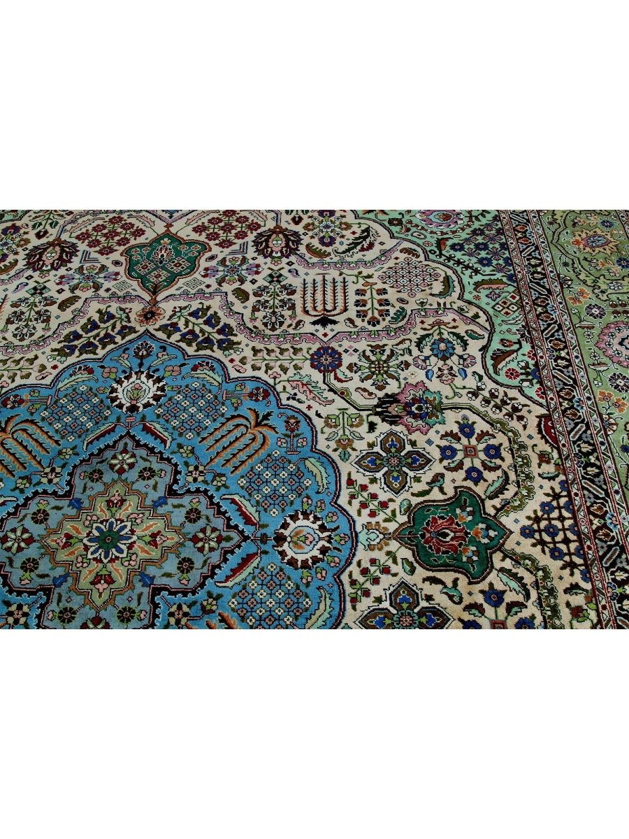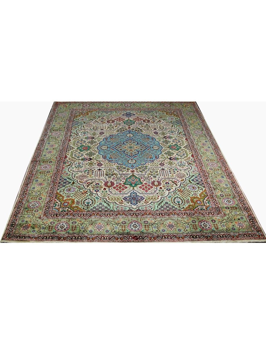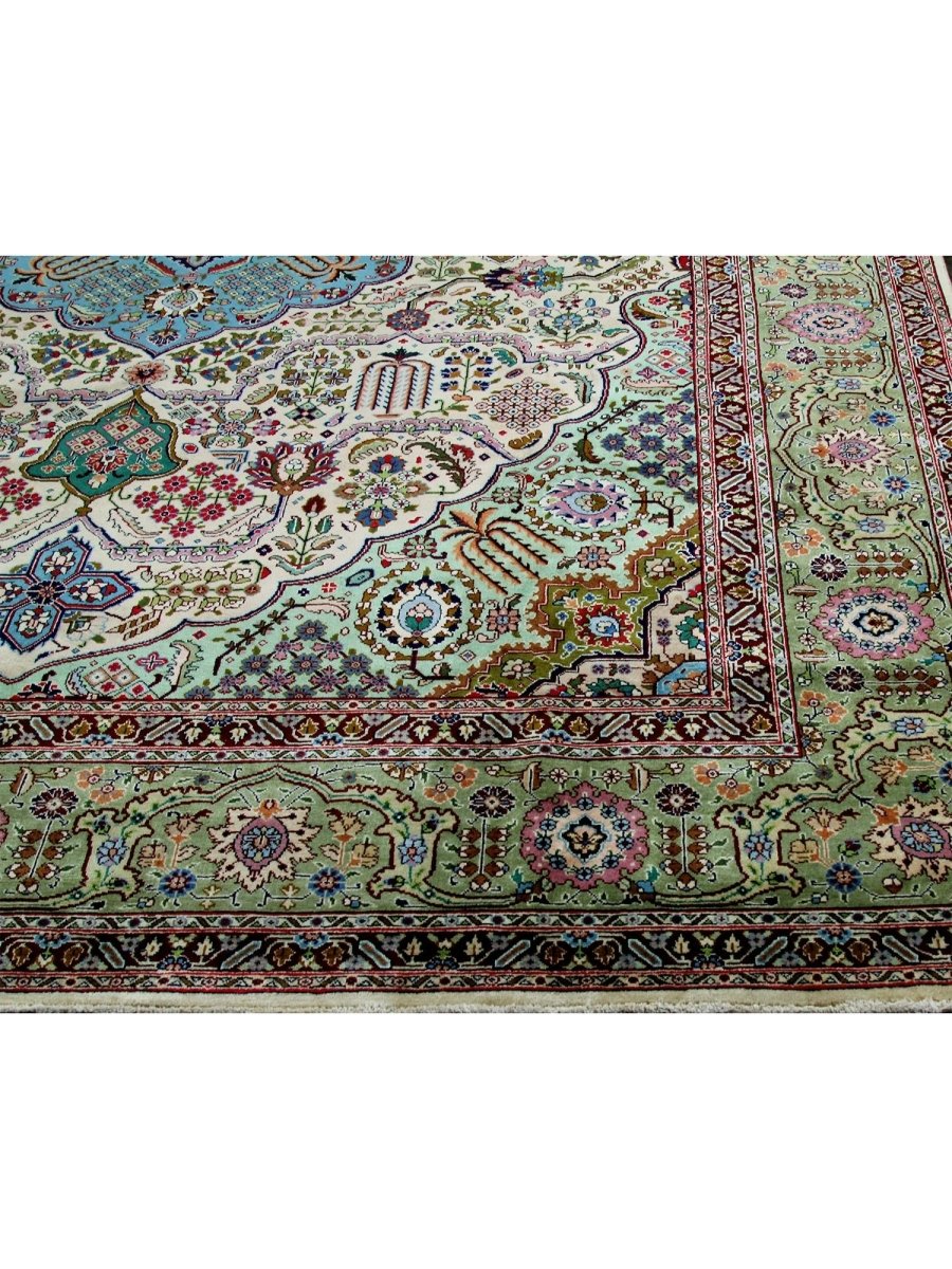 This 10x13 Old Persian Tabriz rug stands as a testament to the ancient art of rug-making, showcasing exceptional craftsmanship and timeless beauty. Hand-knotted by skilled artisans, it has a central medallion design that carries the elegance of Persian tradition. Originating from Persia, renowned for producing the finest rugs, this piece is a true collector’s gem.