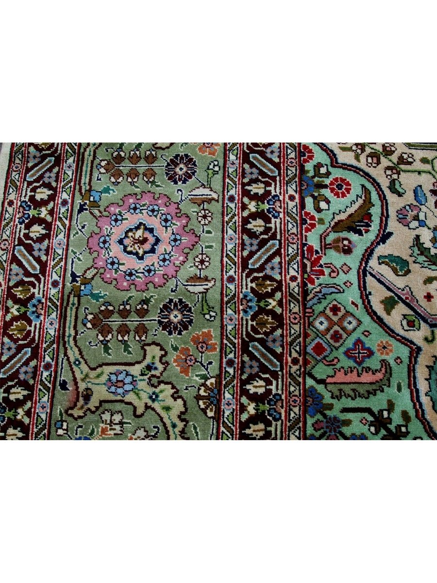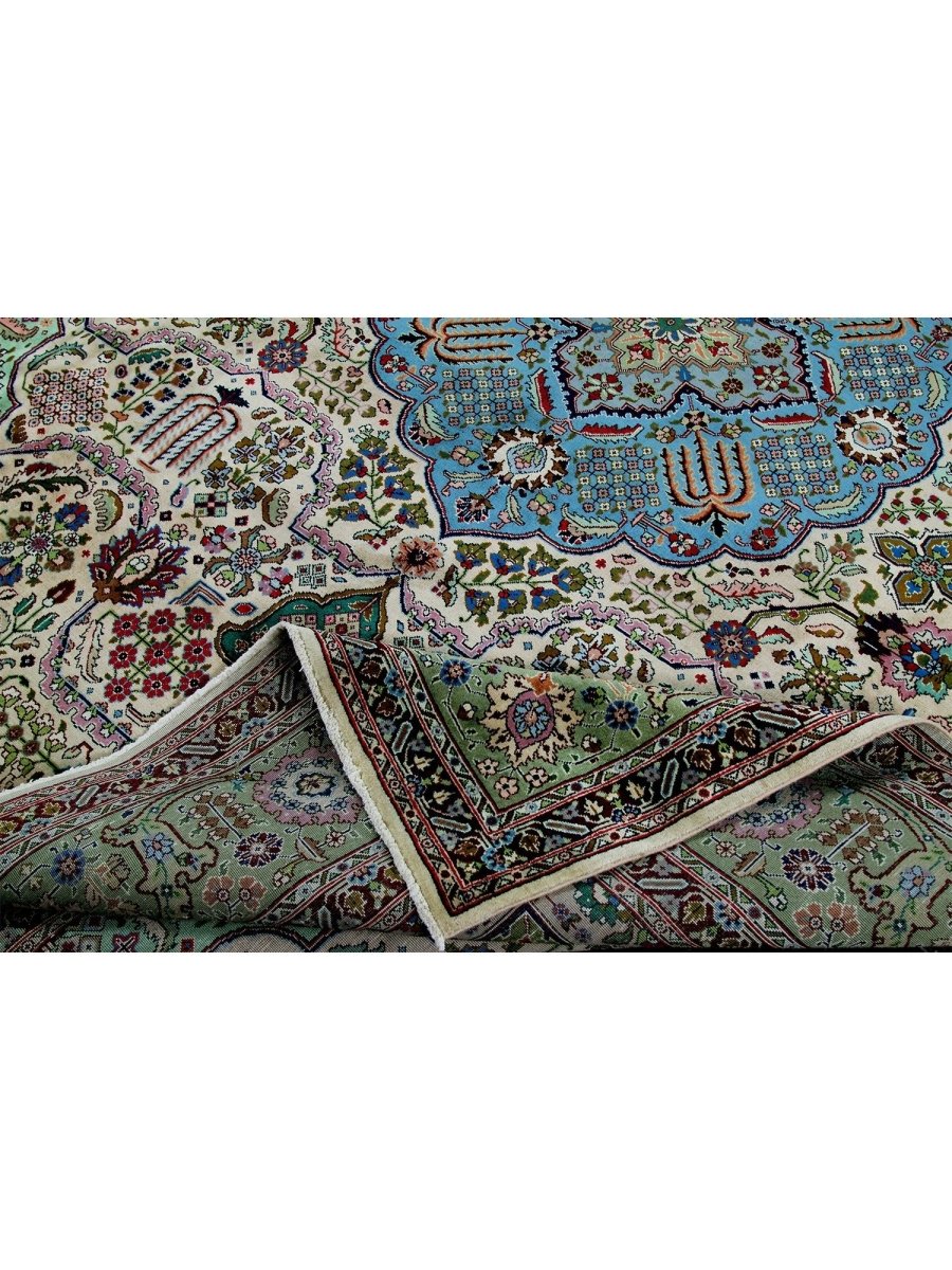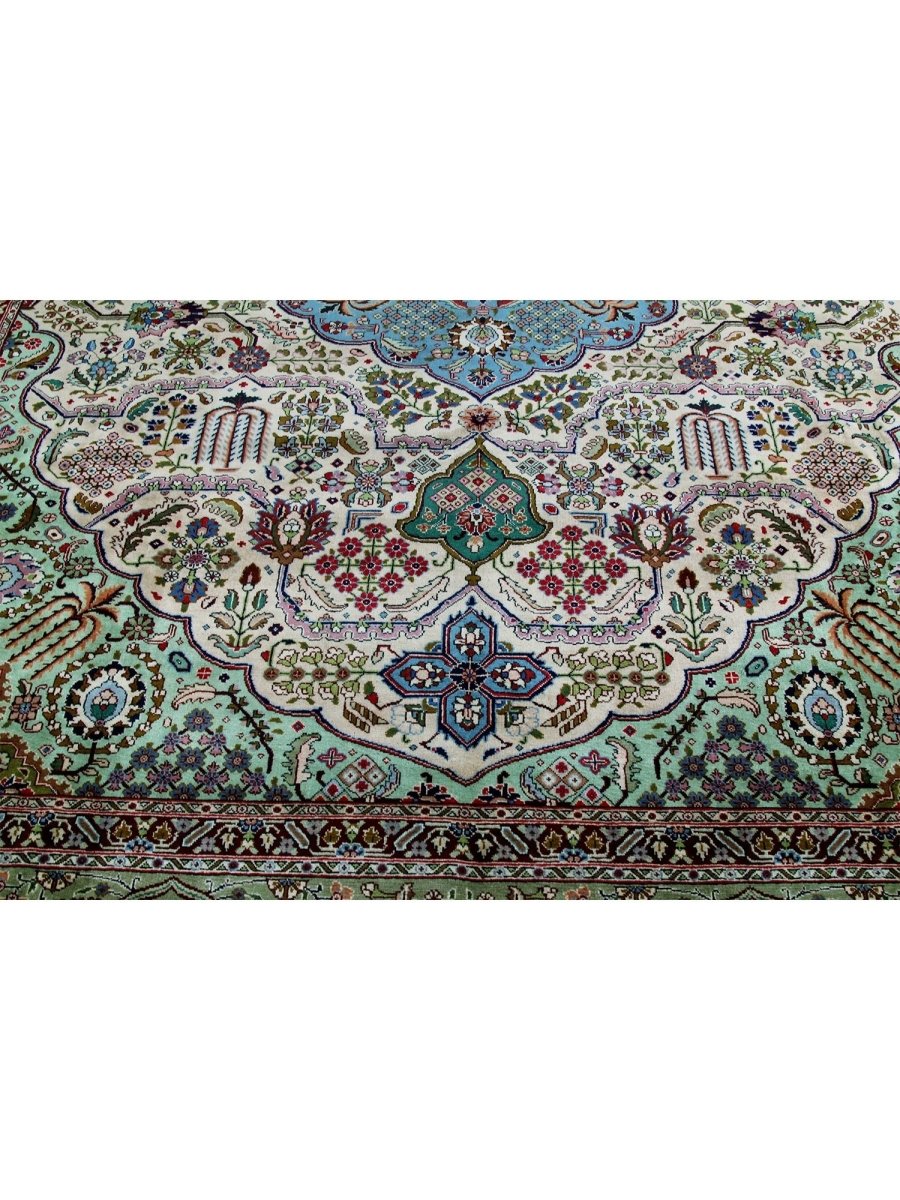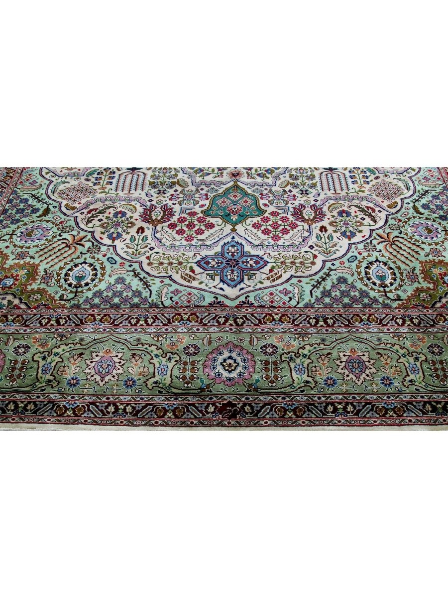 This 10x13 Old Persian Tabriz rug stands as a testament to the ancient art of rug-making, showcasing exceptional craftsmanship and timeless beauty. Hand-knotted by skilled artisans, it has a central medallion design that carries the elegance of Persian tradition. Originating from Persia, renowned for producing the finest rugs, this piece is a true collector’s gem.