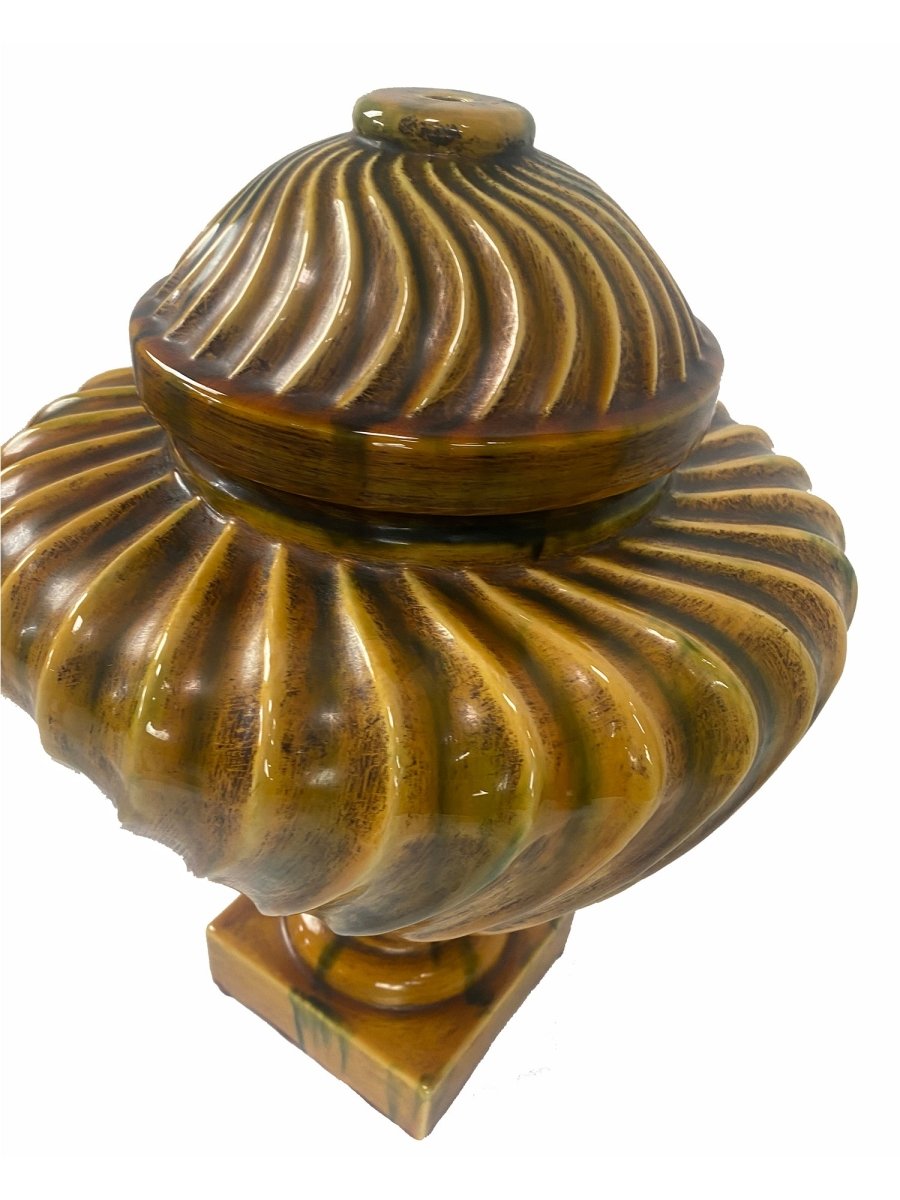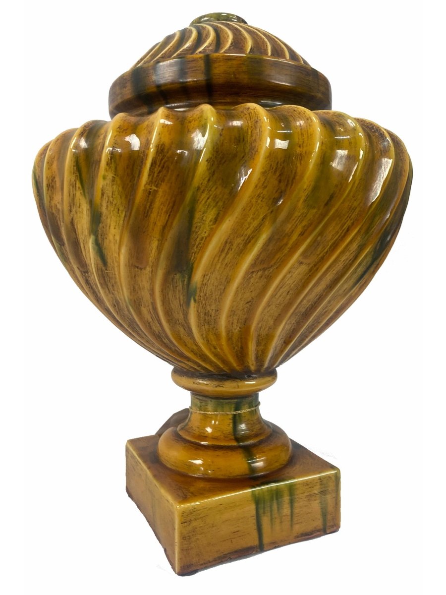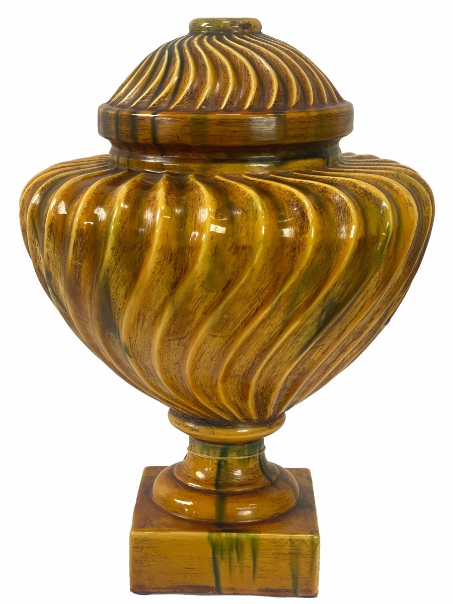 This elegant Italian ceramic urn features a hand-painted swirl pattern in shades of ochre and green, showcasing traditional craftsmanship. Crafted from durable ceramic, it combines artistic detail with timeless Italian style.