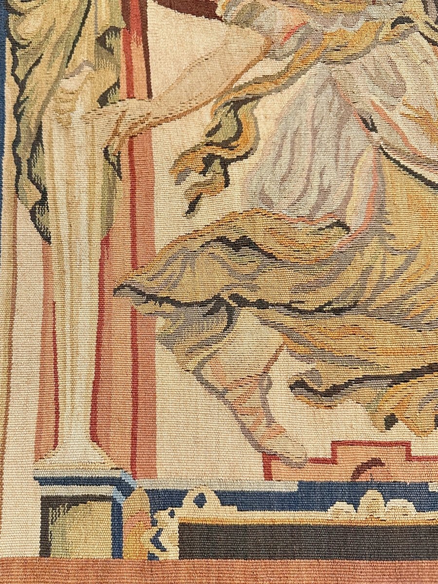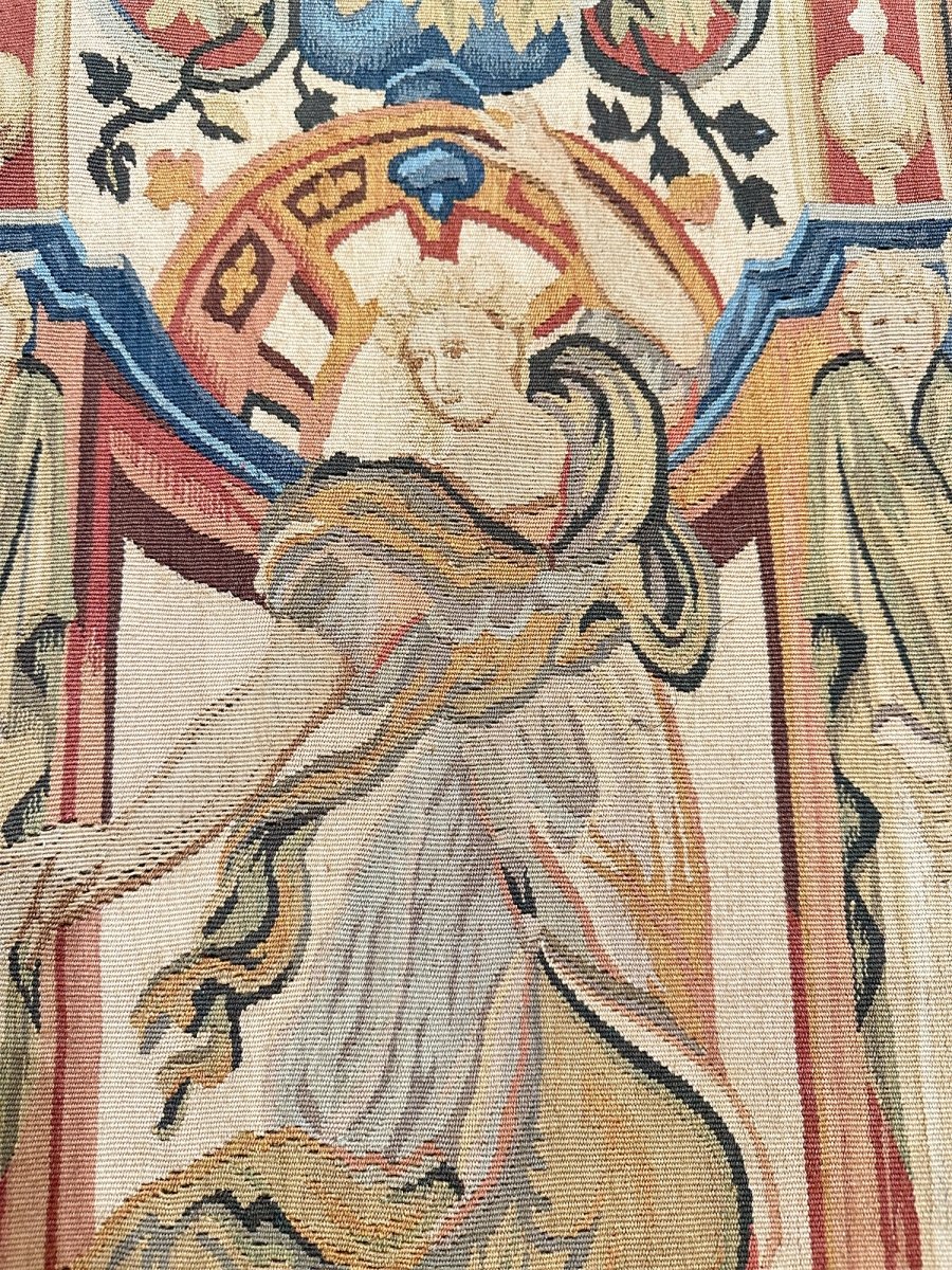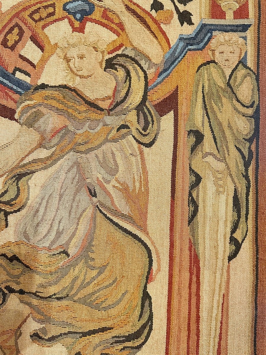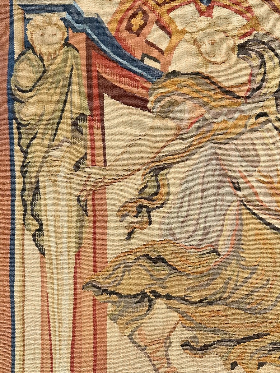Experience the beauty of the Tapestry Fragment - Female in Flowing Dress, a unique piece that brings classic sophistication to your home. Hand-knotted with high-quality wool, this exquisite rug features a pictorial pattern that adds charm to any space. Perfect for curated spaces, it brings warmth and hospitality to your home. The lovely gold, rust, and blue shades make it a versatile choice for various styles. This remarkable piece not only enhances your decor but also serves as a stunning work of art. Enjoy free shipping within the U.S.