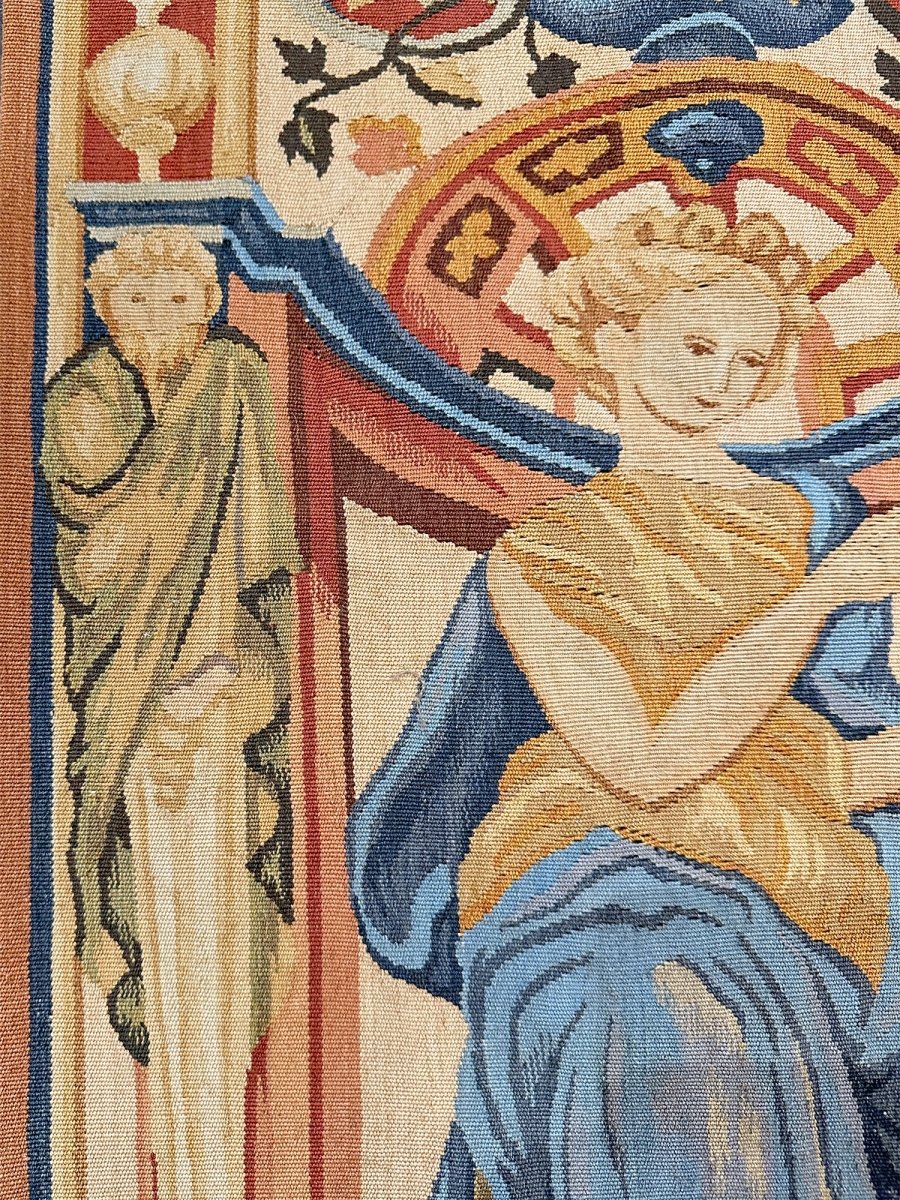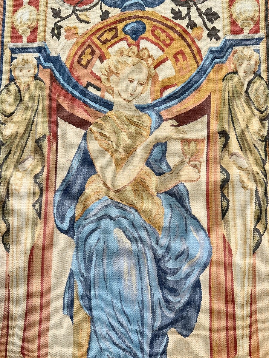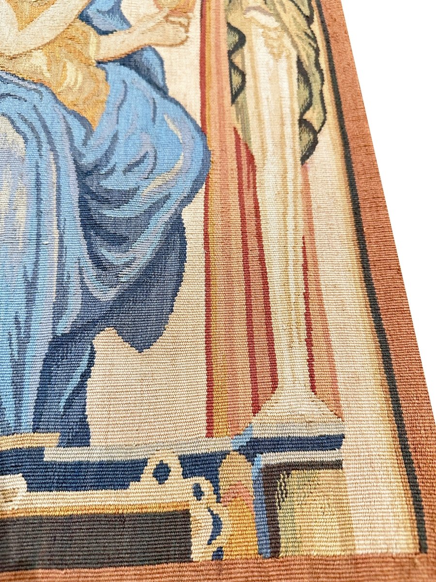 The Tapestry Fragment - Female in Flowing Dress, is a beauty that adds warmth and elegance to any room. Beautifully hand-knotted from the finest quality wool, this stunning rug features a pictorial design that is an ideal choice for style focused interiors as it creates a cozy atmosphere. The striking combination of gold, blue, and rust make it a suitable enhancement for any home style. This outstanding piece not only adds great beauty to your decor but also serves as a fine piece of artwork, sure to be a conversation starter in any home. Enjoy free shipping in the U.S.