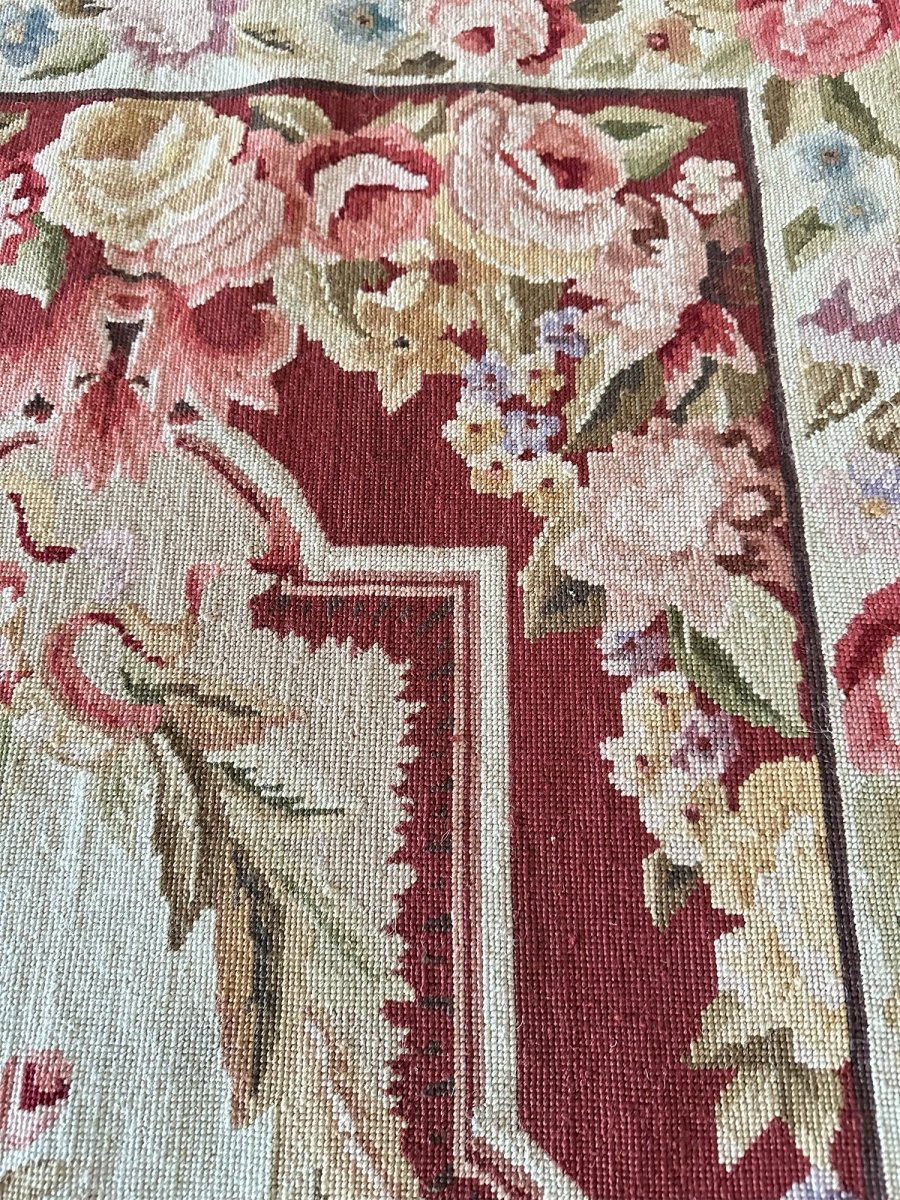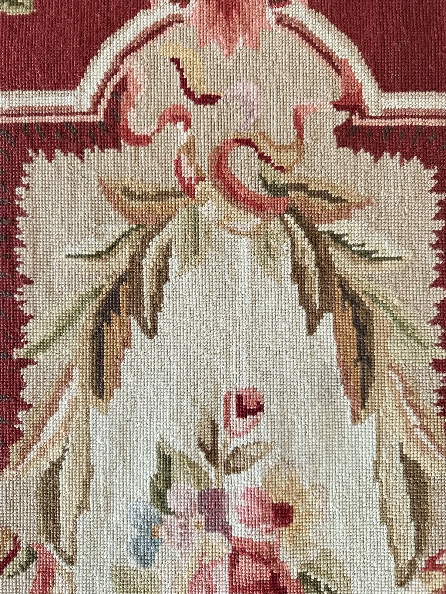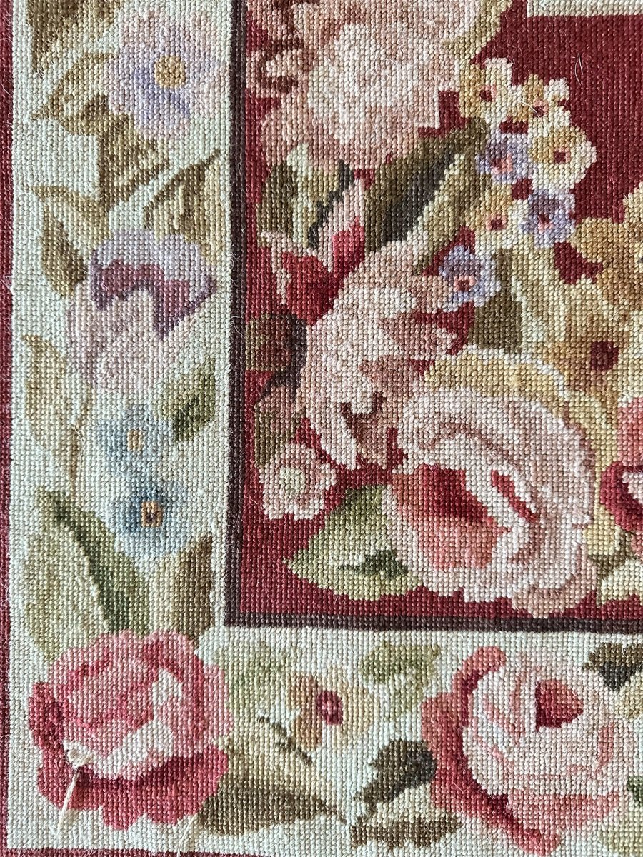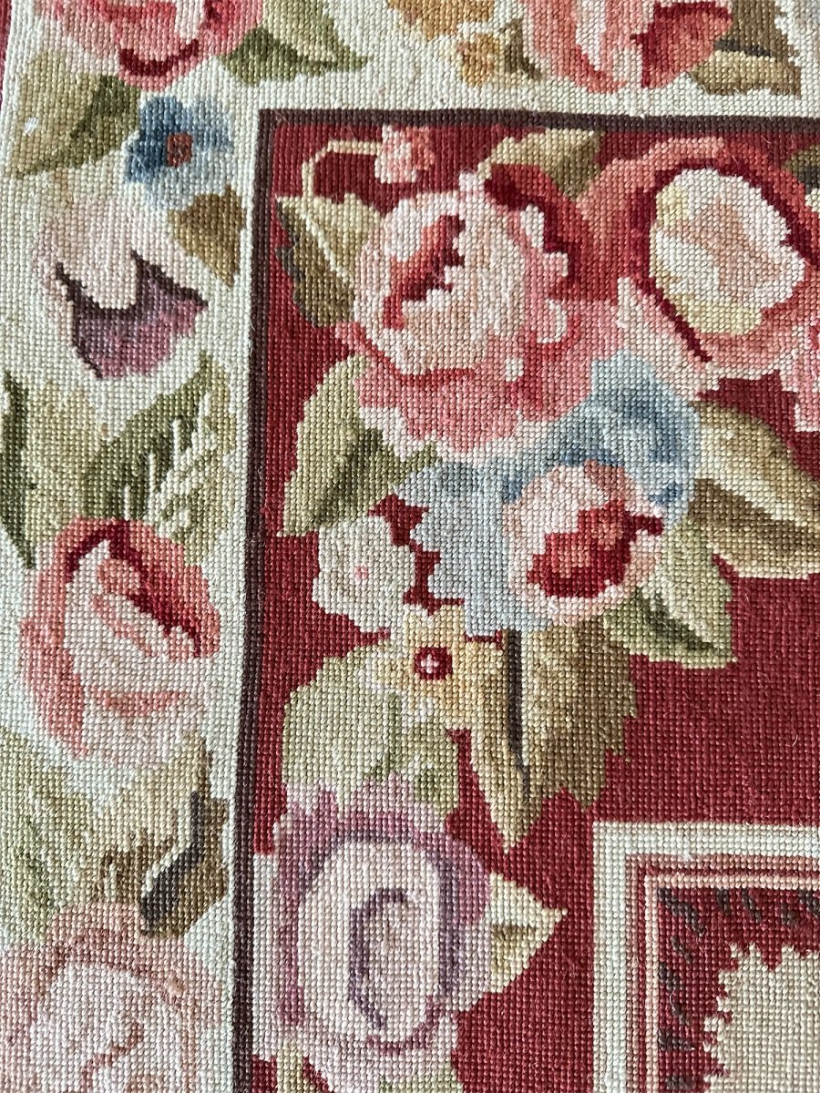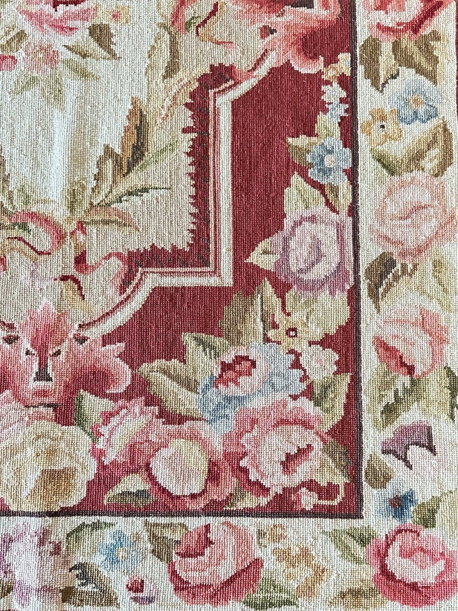 The 3x5 French Needlepoint Style Area Rug is a beauty that adds warmth and elegance to any room. Beautifully hand-knotted from the finest quality wool, this stunning rug features a floral design that is an ideal choice for sophisticated settings, creating a cozy atmosphere. The striking combination of burgundy, cream, olive-green, and blue make it a suitable enhancement for any home style. This outstanding piece not only adds great beauty to your decor but also serves as a fine piece of artwork, sure to be a conversation starter in any home. Enjoy free shipping in the US.