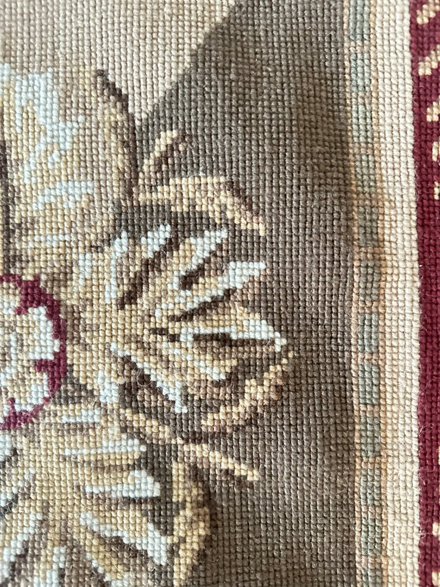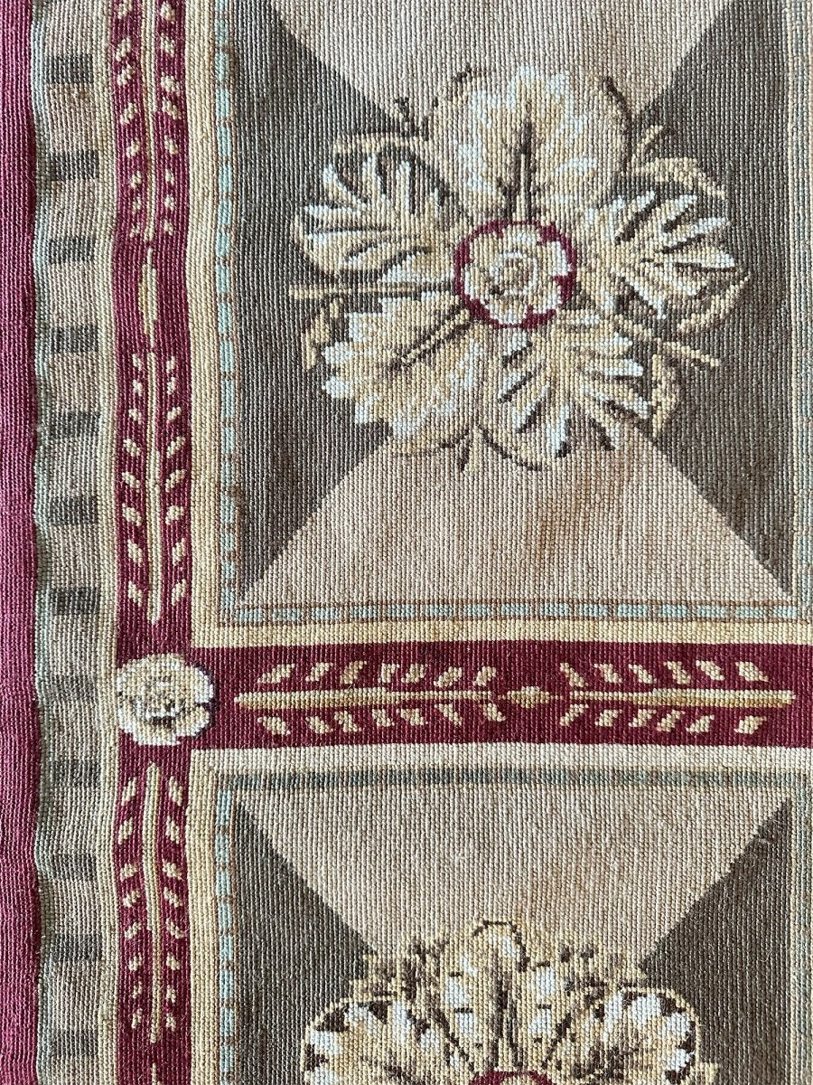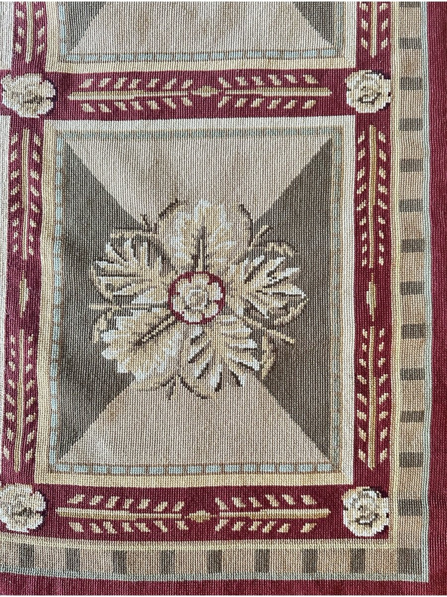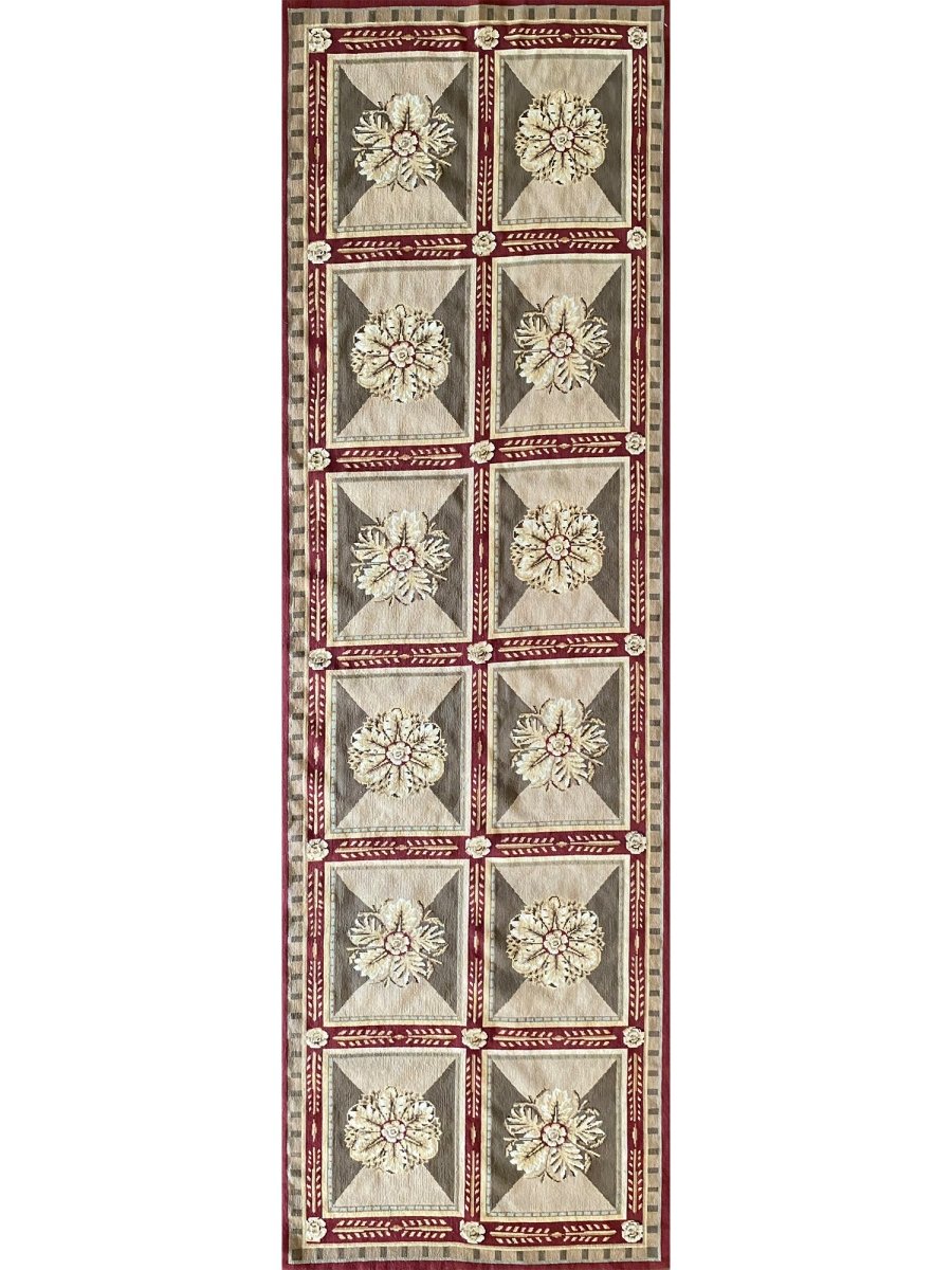 Add a touch of casual style to your home with this 3x9 French Needlepoint Style Runner Rug, crafted in China. This gorgeous rug features a captivating floral pattern, showcasing a simple yet effective design in a taupe, rust, and beige palette. Its durable wool construction ensures longevity and easy care, perfect for timeless interiors. The clean finish reflects quality craftsmanship and design. This piece effortlessly brightens, adding warmth, texture, and a relaxed feel. A blend of simple design and function, it easily enhances any space. Enjoy the benefit of free shipping across the United States. Each rug offers a distinct look, with subtle variations inherent to its creation.