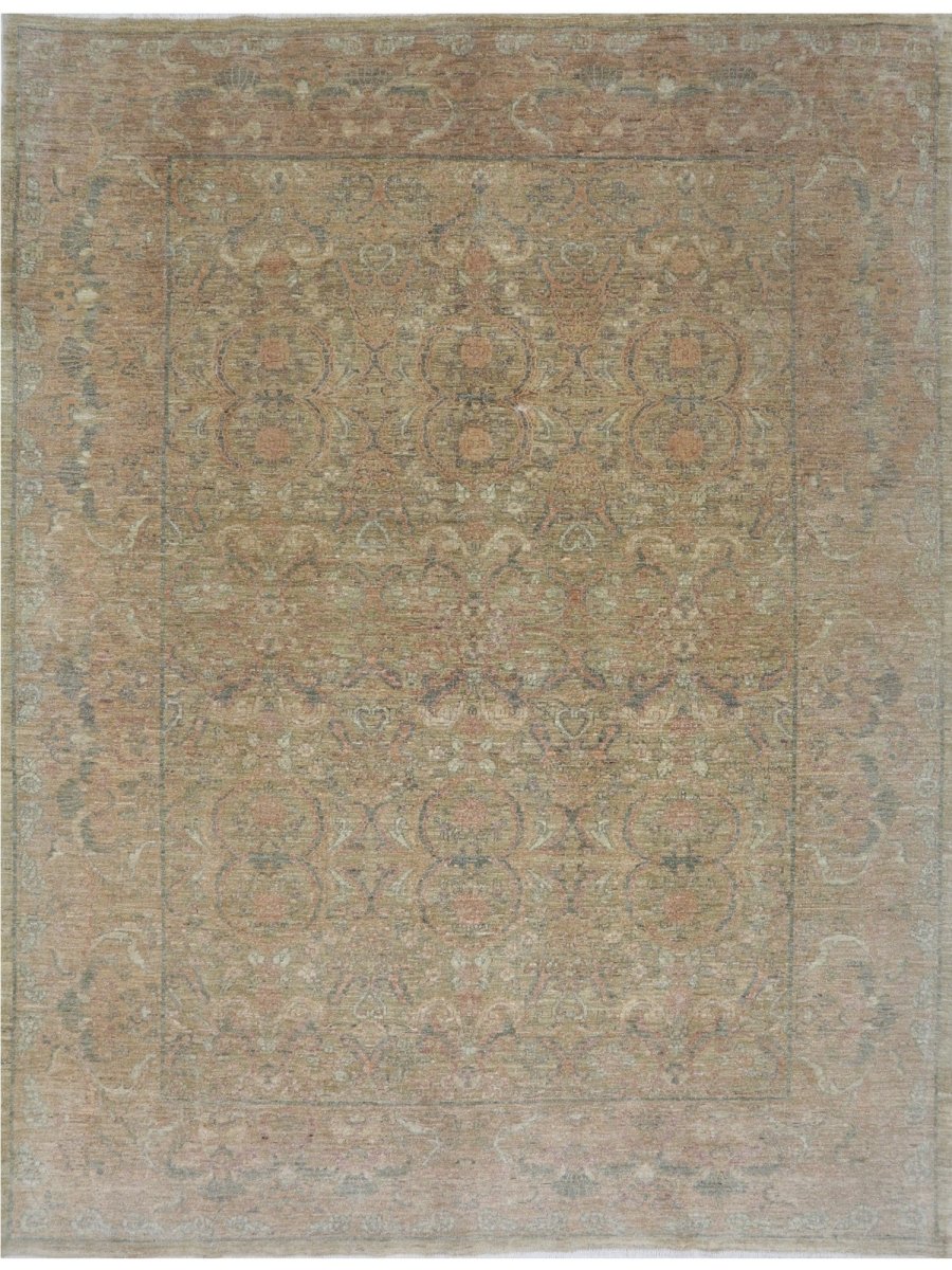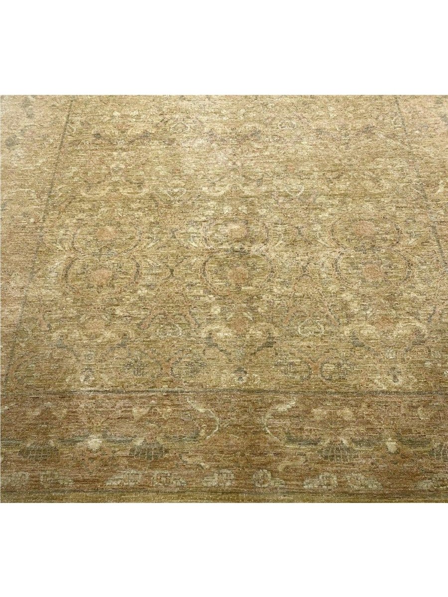 It is presented in a refined color palette dominated by versatile beige and tan, beautifully accented with warm rust tones and serene shades of gray, offering a nuanced aesthetic that effortlessly enhances any room. Its adaptable size makes it an ideal addition to a cozy living room, providing comfort and style to a dining area, or bringing a touch of refined history to a bedroom. This rug seamlessly integrates into various decor styles, adding a layer of subtle artistry and timeless appeal to your home. This hand-knotted rug is a true testament to skilled weaving, promising to be a cherished element that elevates the aesthetic and comfort of your home.