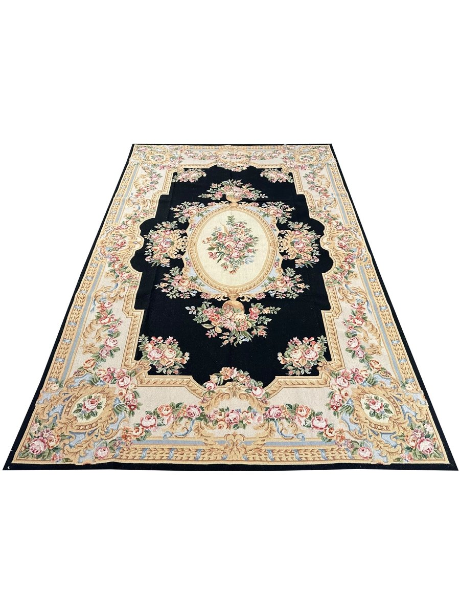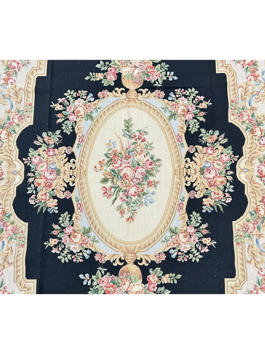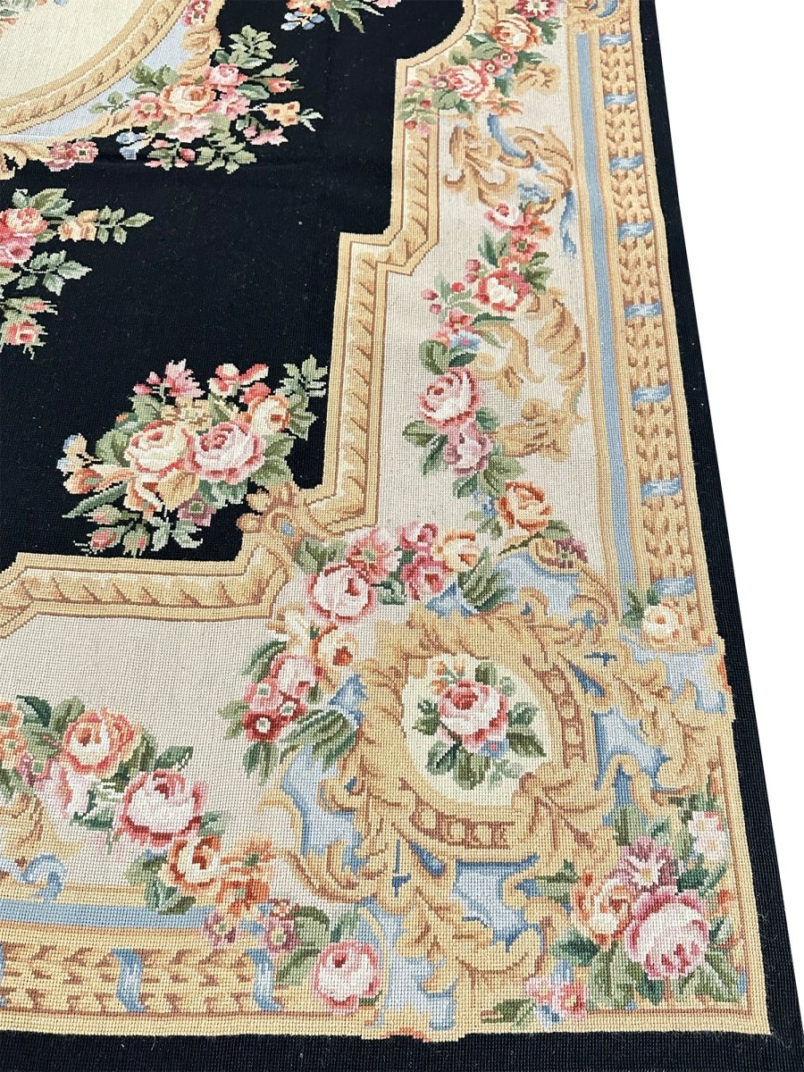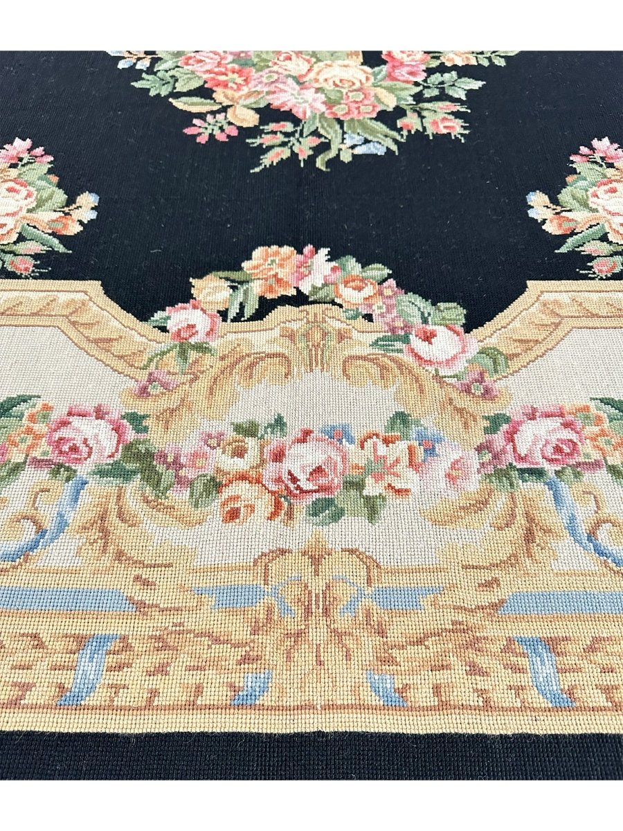 Bring timeless European elegance to your home with this 6x9 French Needlepoint Style Area Rug, hand-knotted from premium wool and expertly crafted in China. Inspired by classic French Needlepoint traditions, this rug features a dramatic black primary field complemented by a refined cream border, creating a sophisticated contrast that suits both traditional and transitional interiors.