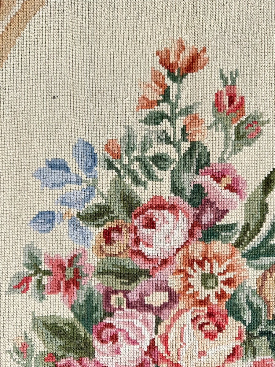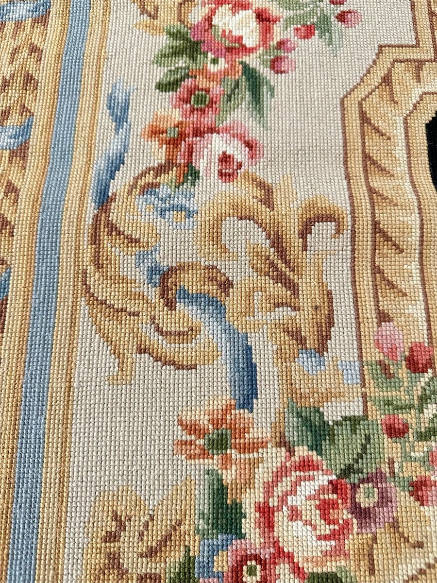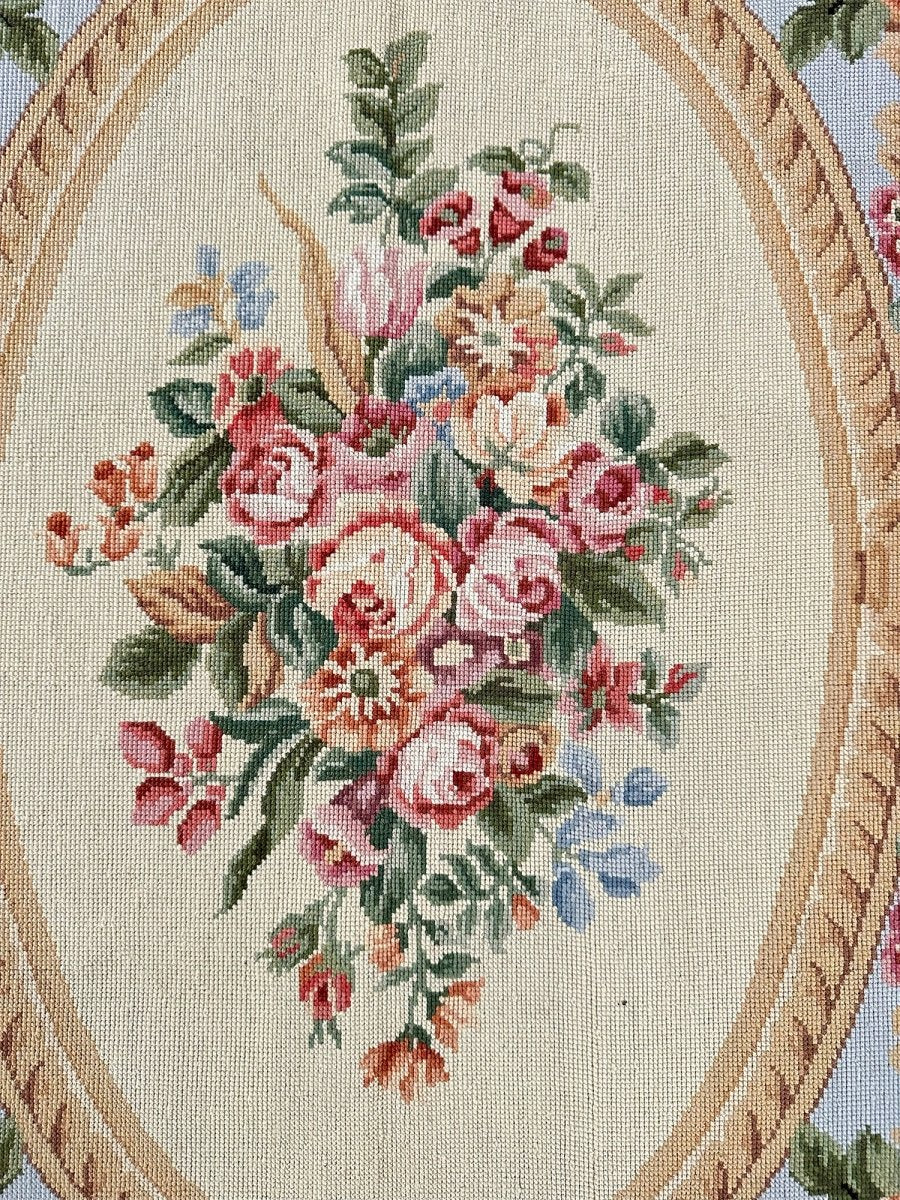 At the center lies an ornate oval medallion with floral motifs, accented with soft hints of pink, blue, green, and gold, adding subtle depth and refinement. Surrounding the medallion, the cream border is adorned with scrolling acanthus leaves, ribbon-like flourishes, and garlands of roses, reflecting the symmetry and artistry of classic French design.
