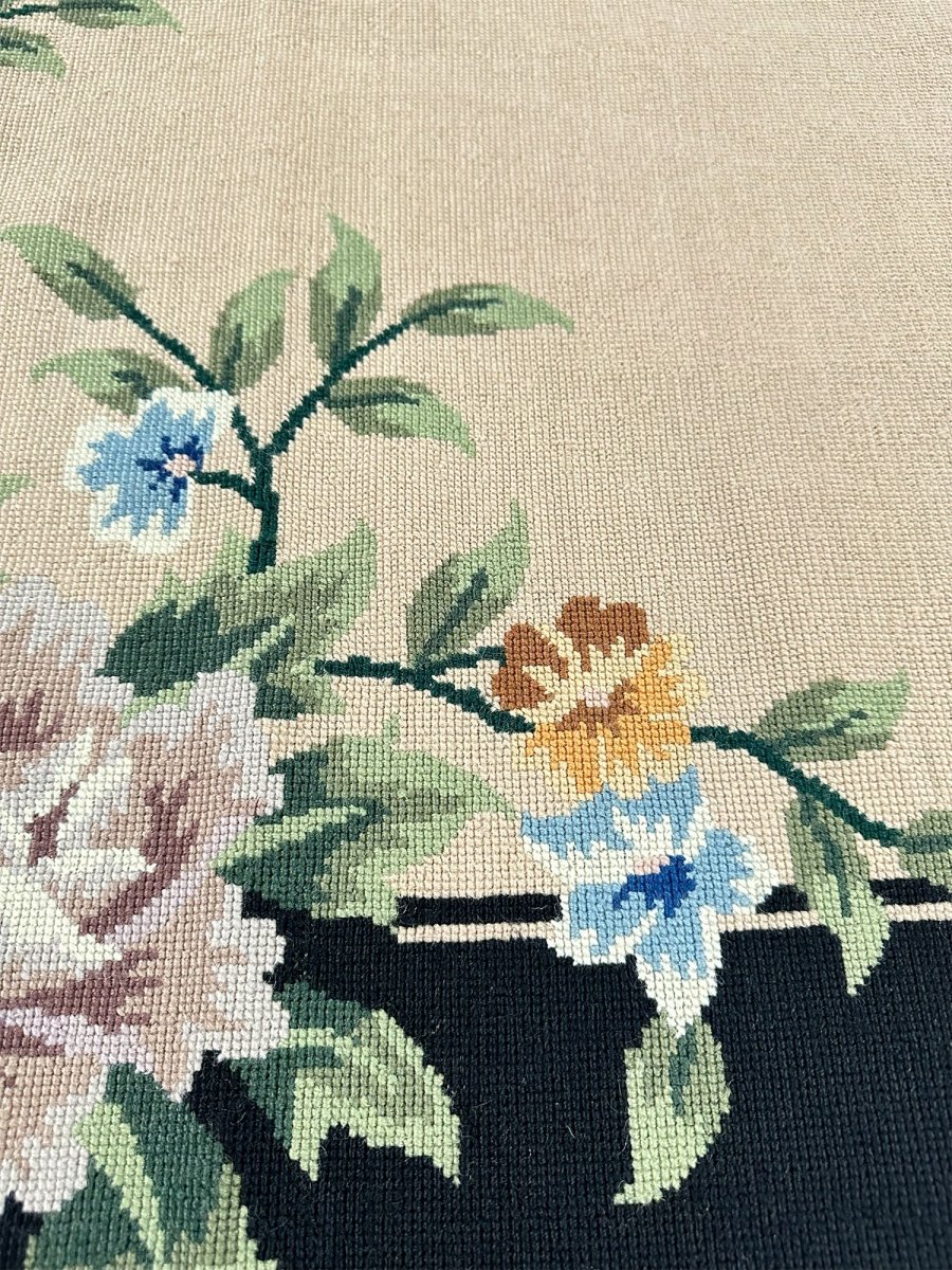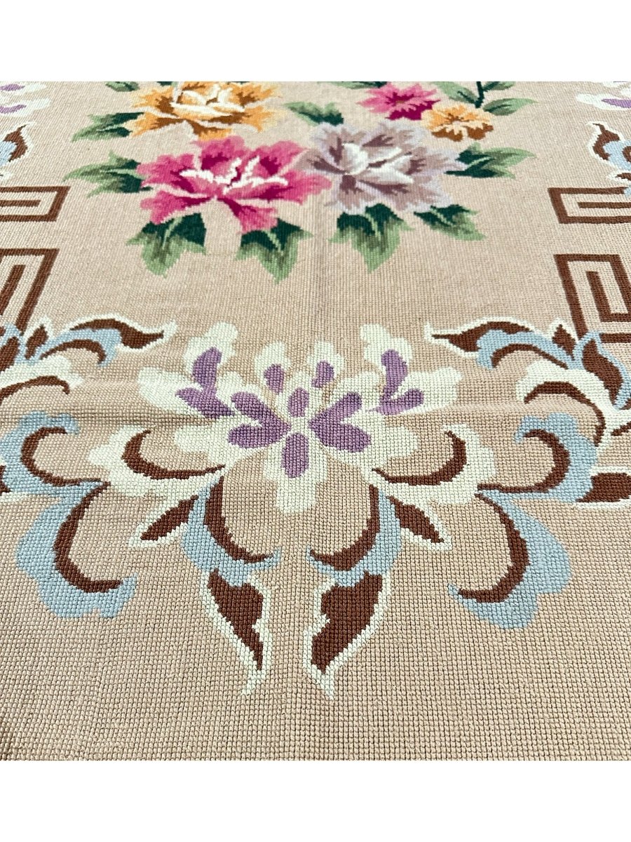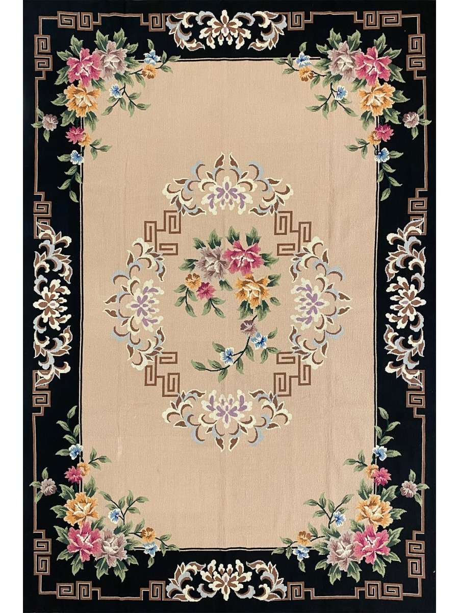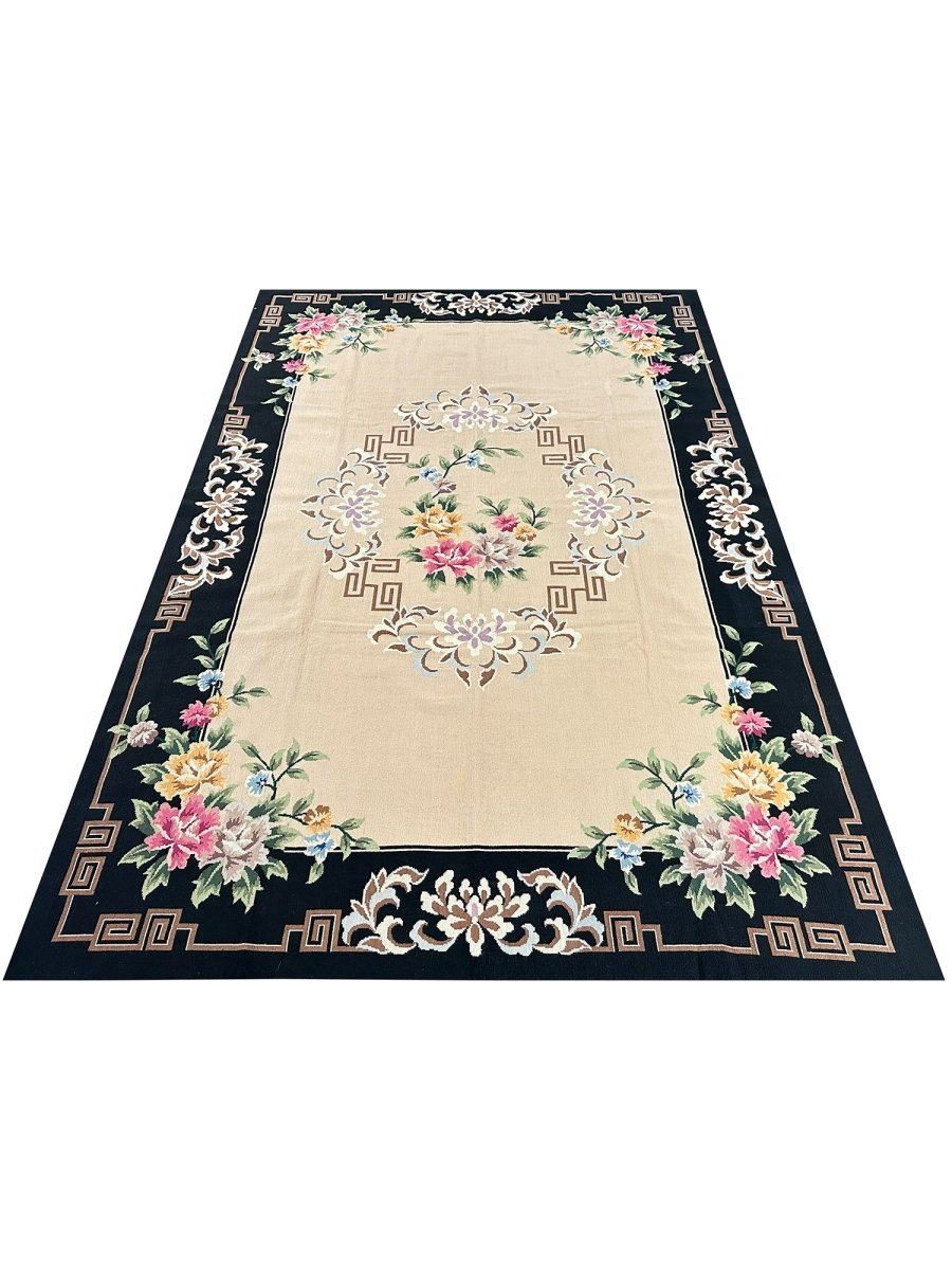 Add timeless elegance to your home with this beautifully crafted French Needlepoint Style Area Rug. Handknotted in China from high-quality wool, this new piece showcases classic needlepoint artistry with a refined floral design. The rug features a warm tan field, accented by a richly detailed black border, creating a sophisticated contrast that highlights the intricate motifs.
