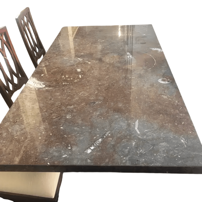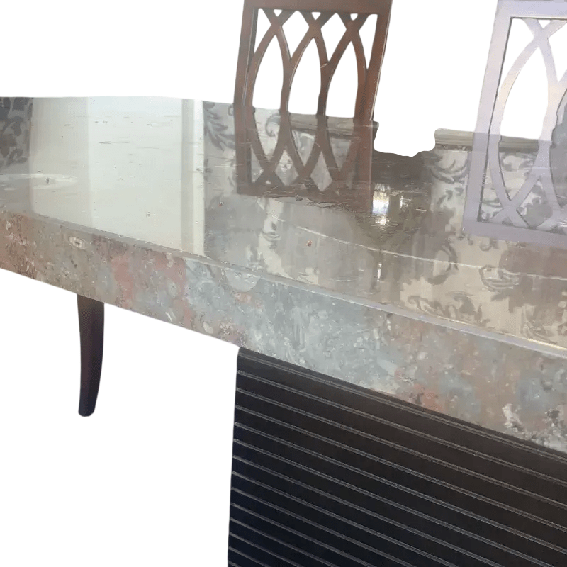 This contemporary Italian dining table combines modern design with luxurious natural materials. The tabletop features a fossilized desert stone surface, showcasing unique patterns and organic texture that create a striking visual centerpiece.