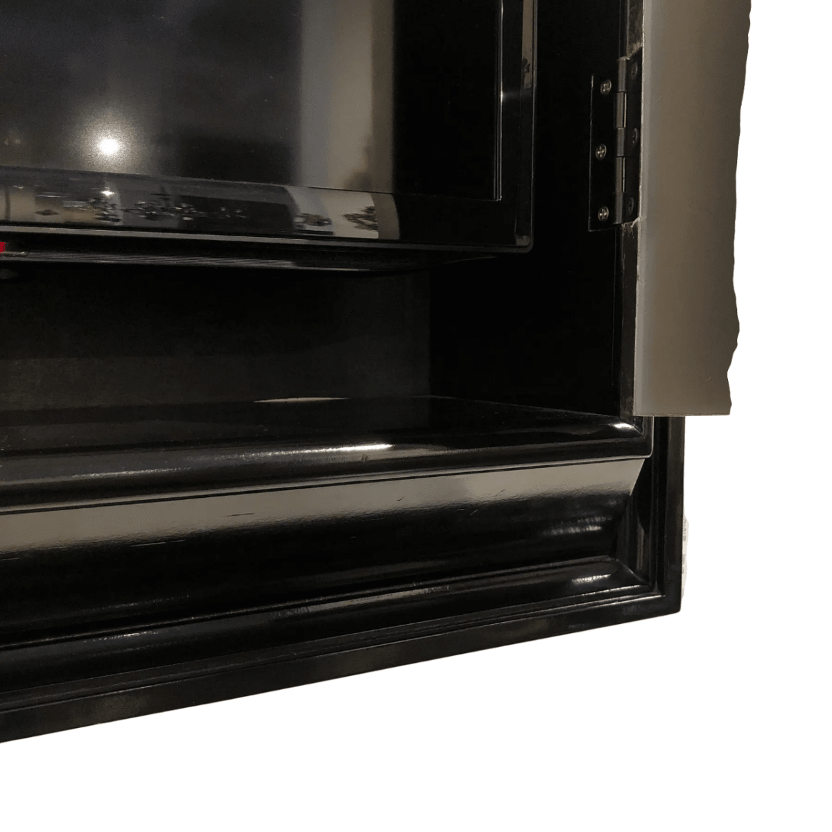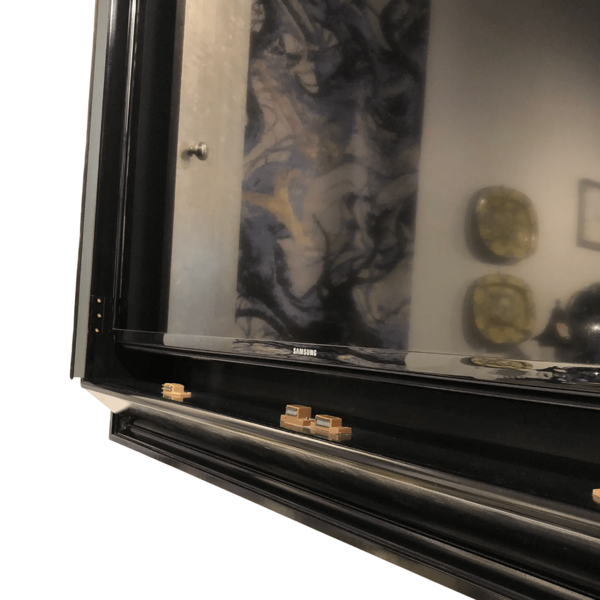 The doors open smoothly from the center, providing easy access to conceal a television while maintaining a polished decorative appearance when closed. Combining modern style with subtle old-world character, this wall-mounted display case serves as both a functional media solution and a striking design statement.