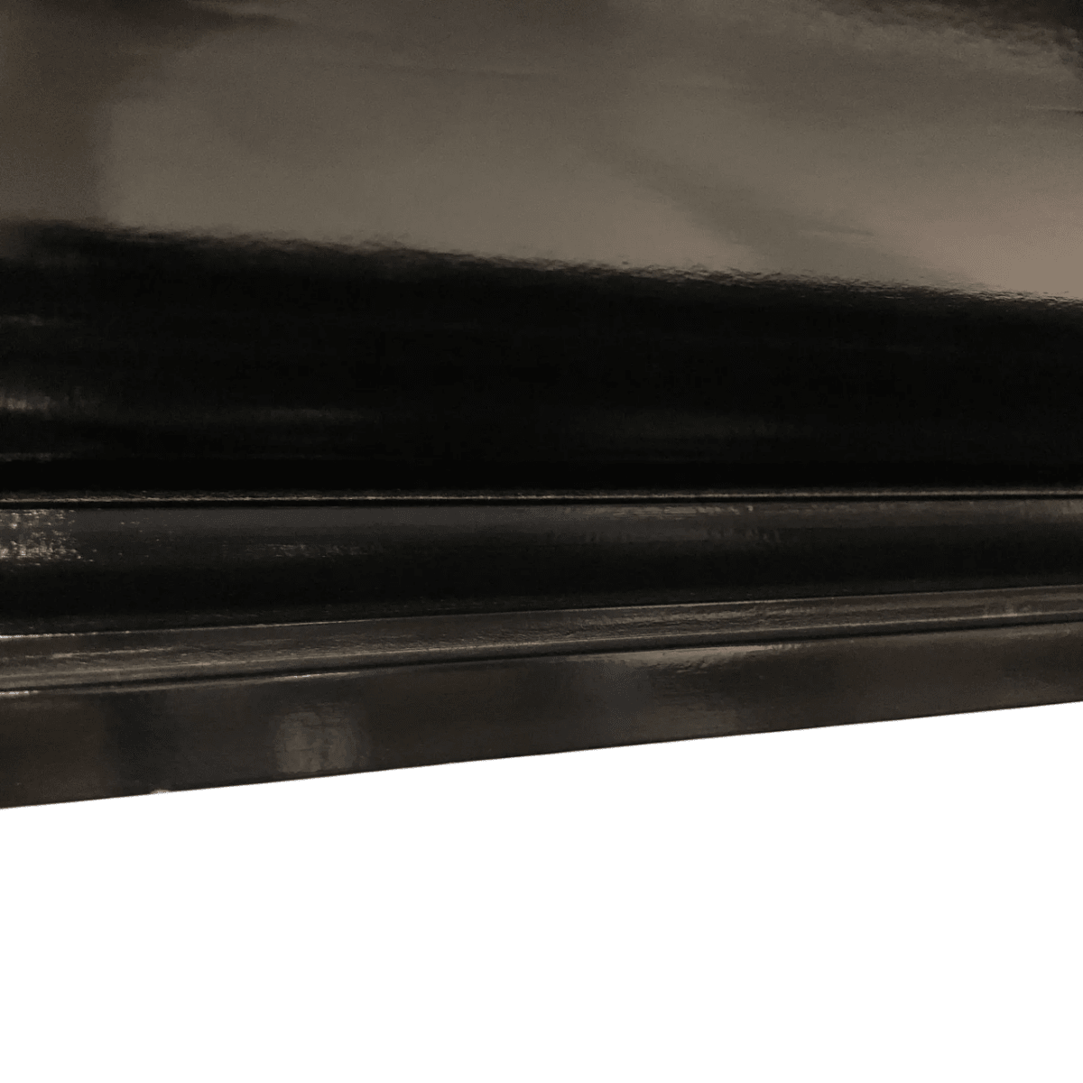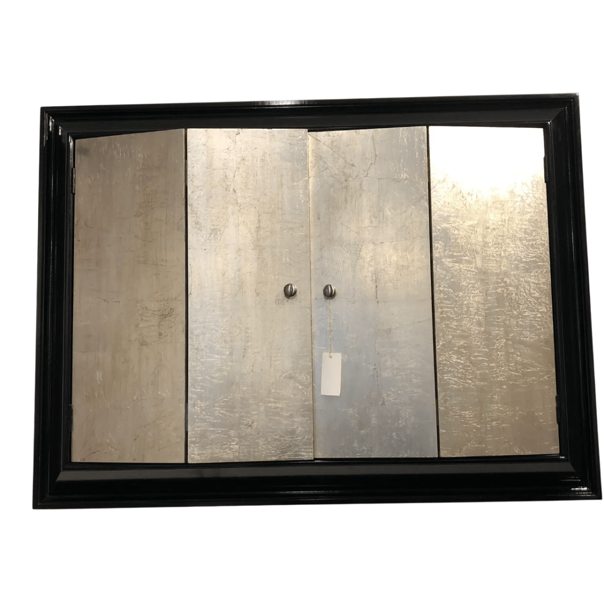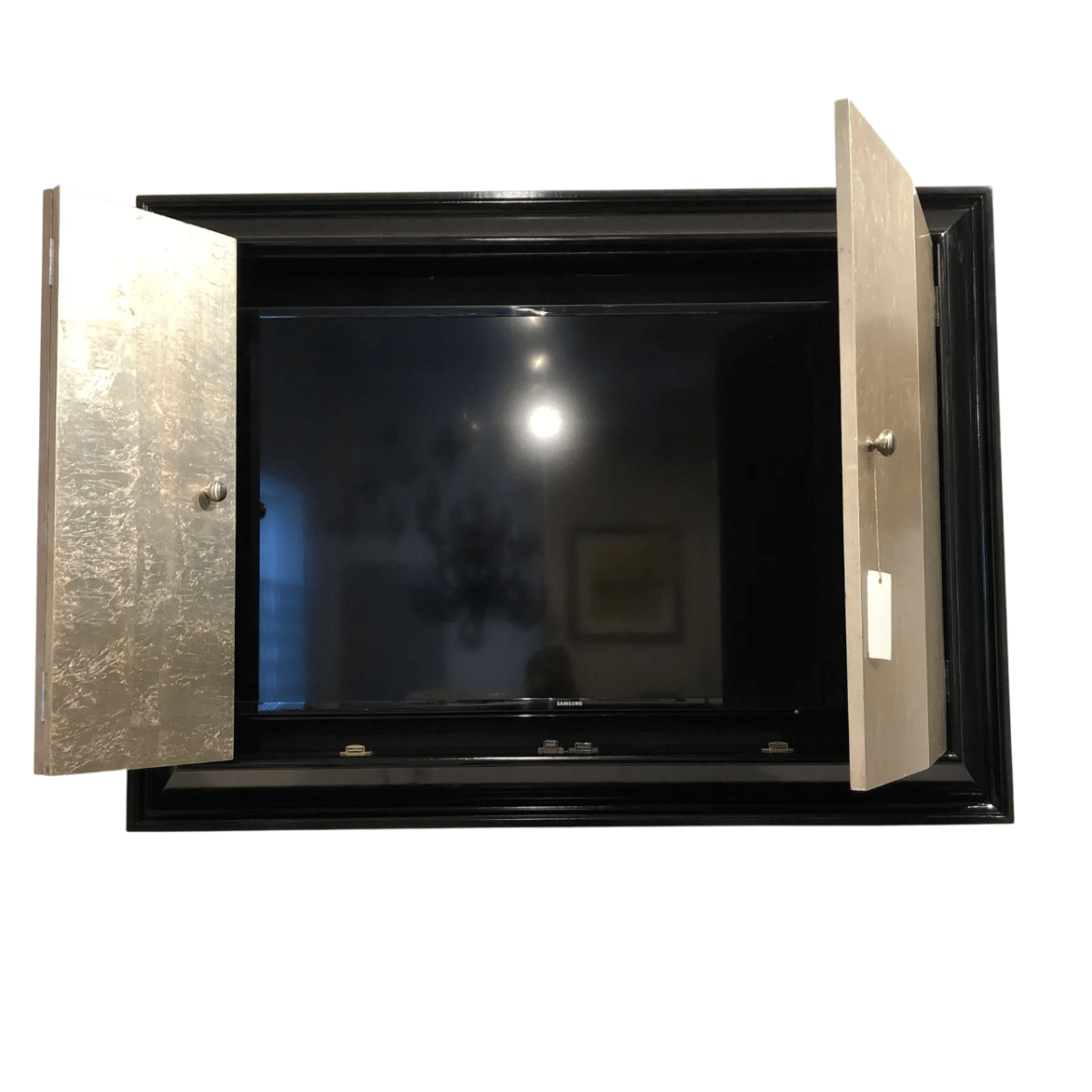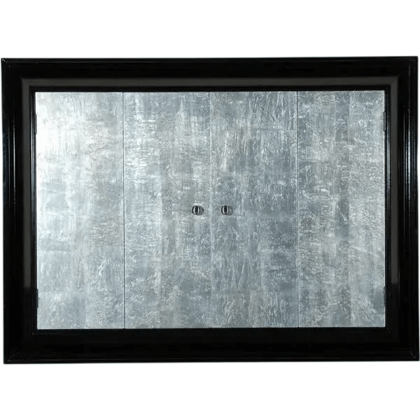 This contemporary wall-mounted TV display case combines functionality with sophisticated design. The sleek black frame features a clean stepped molding profile, contrasting beautifully with the two hinged doors finished in richly textured distressed silver leaf. The hand-worked silver surface adds an artistic and refined quality to the piece.