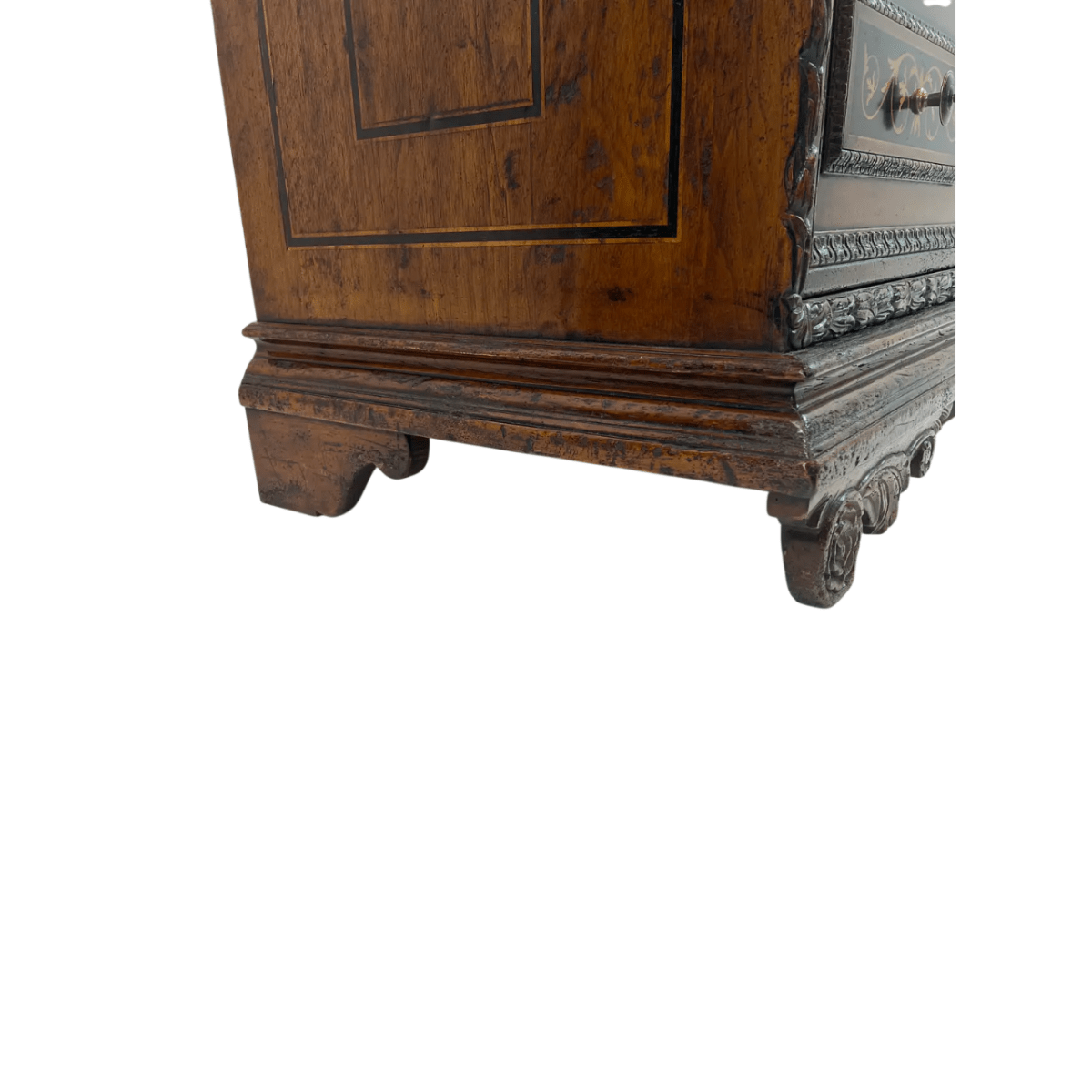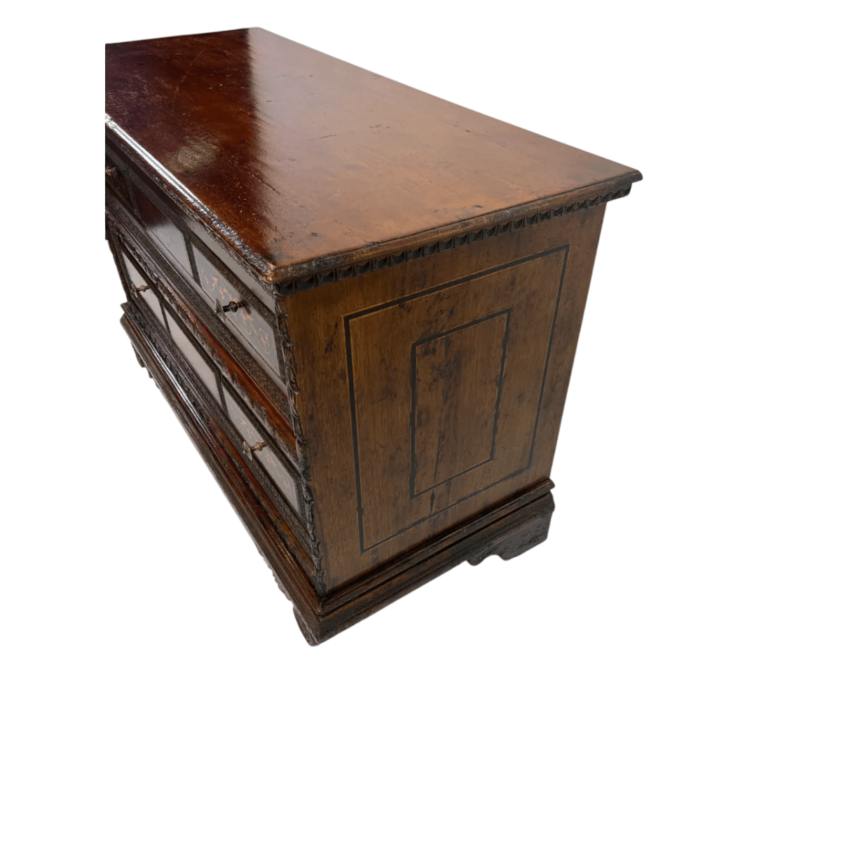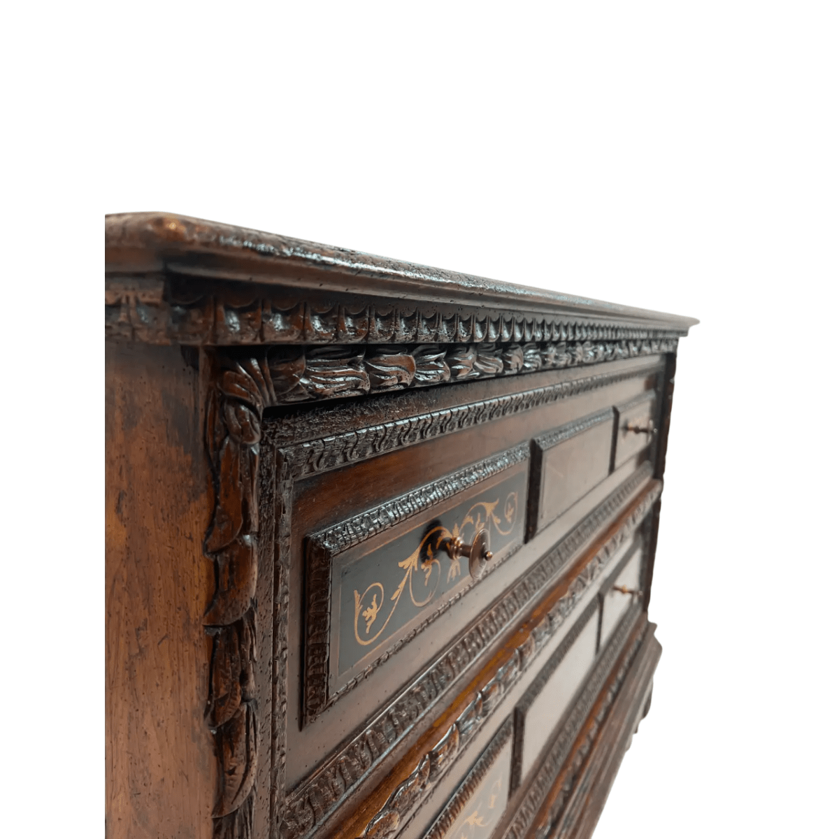 This 1990s vintage two-drawer chest is crafted in a traditional early 17th-century style, featuring a rich walnut wood body accented with maple and ebony inlay that highlights intricate decorative detail. The design includes carved elements and refined bronze hardware, giving the piece classic elegance with a slightly distressed finish for character.
