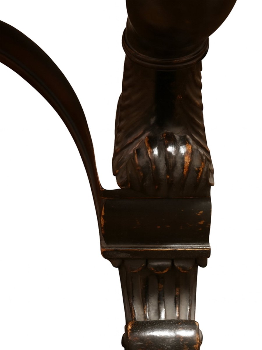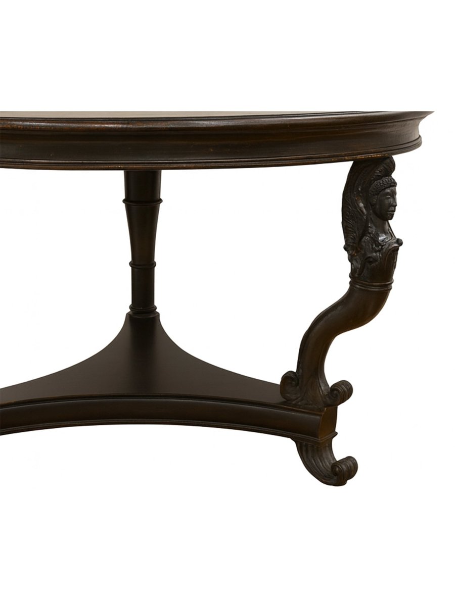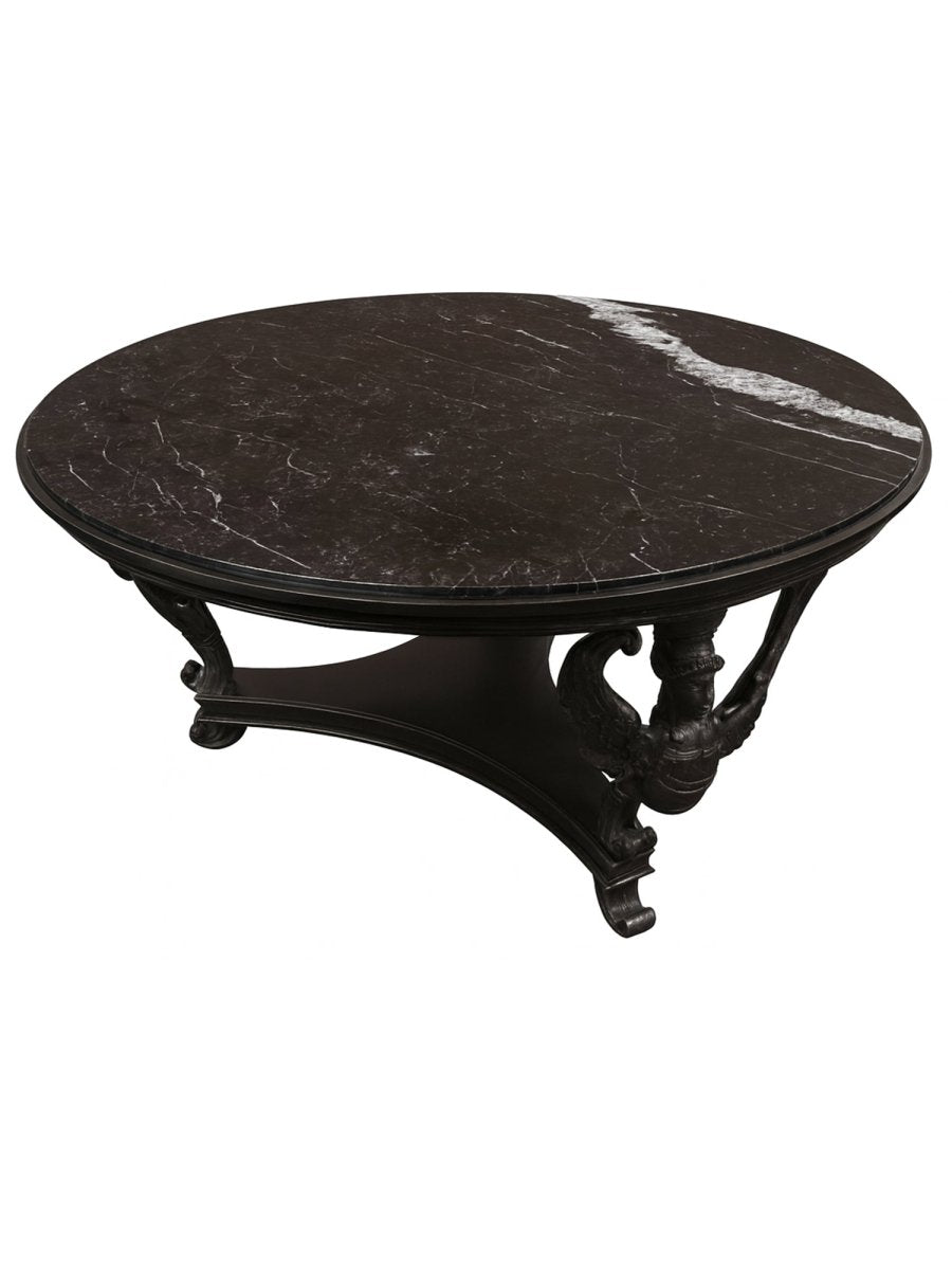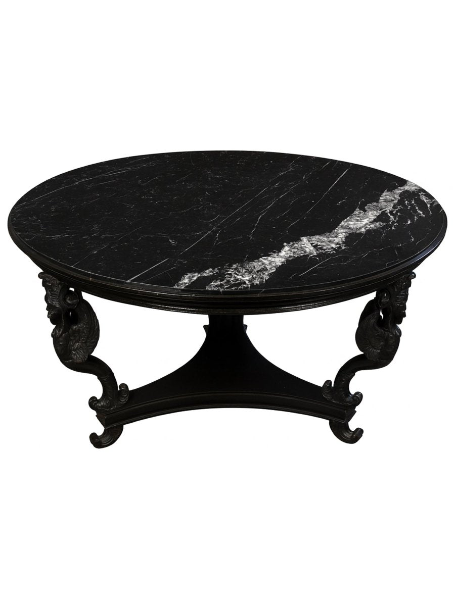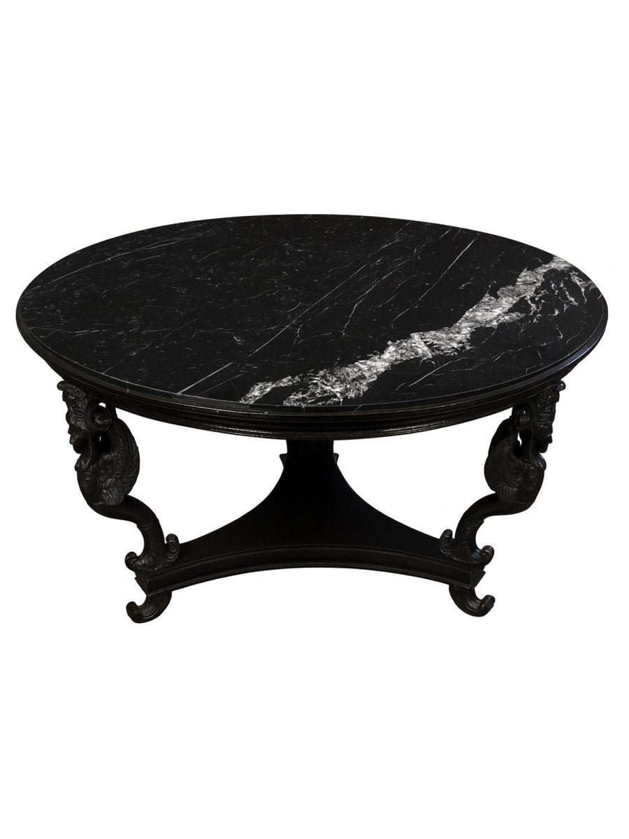 Commanding and architectural, this Empire Style black marble center table reflects the grandeur and symmetry associated with classical design traditions. The substantial round tabletop is crafted from richly veined black marble, its polished surface highlighting striking natural movement and depth. Supporting the top is a sculptural base with elegantly curved legs and finely carved detailing, evoking the formal refinement and decorative strength of the Empire aesthetic. Balanced in proportion and dramatic in presence, this table stands as a distinguished statement piece defined by craftsmanship and material quality.