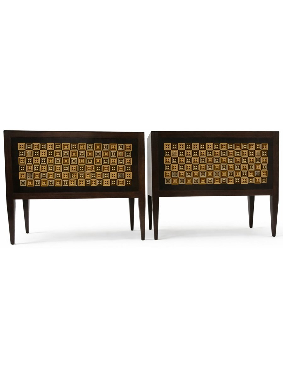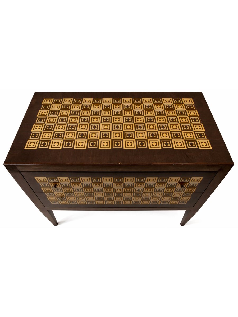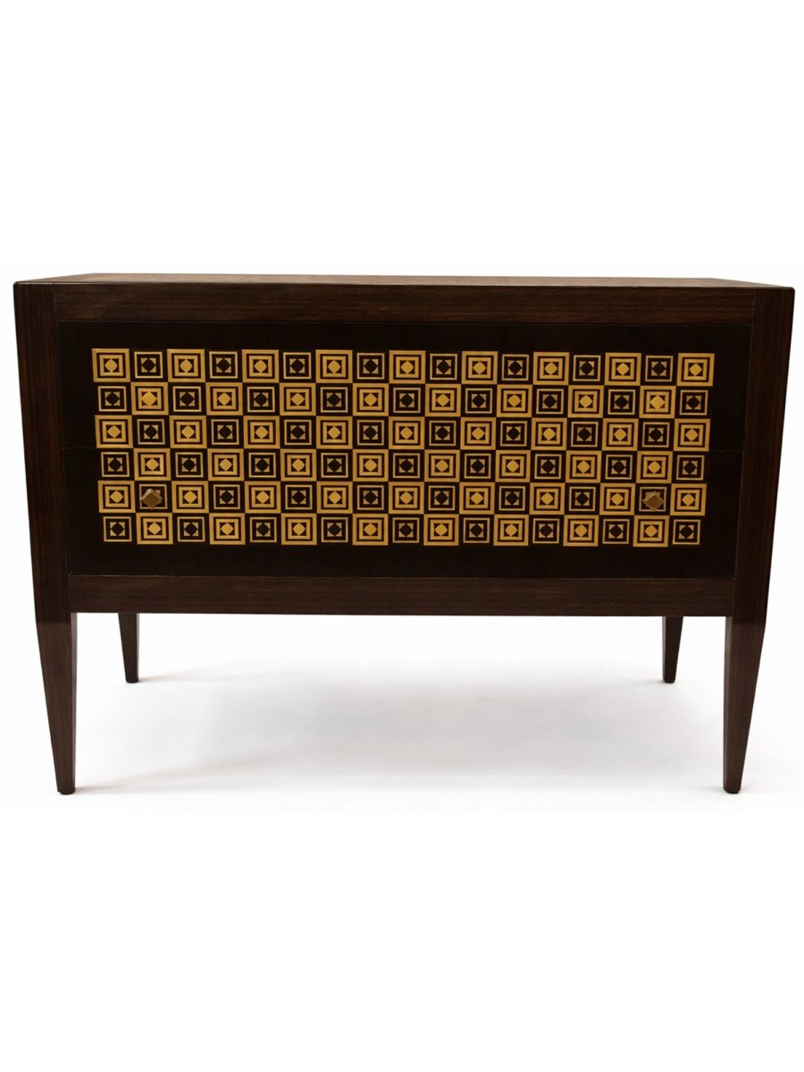This elegant set of two Italian 2-drawer chests combines classic craftsmanship with striking decorative detail. Each chest is handcrafted in Italy from fine wood and features beautifully inlaid diamond patterns in ivory and brown against a primary black finish. The softly contoured fronts and hand-finished surfaces highlight the natural warmth of the wood while providing visual sophistication.