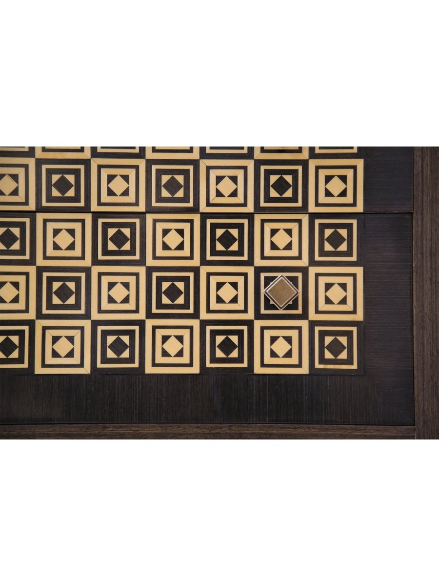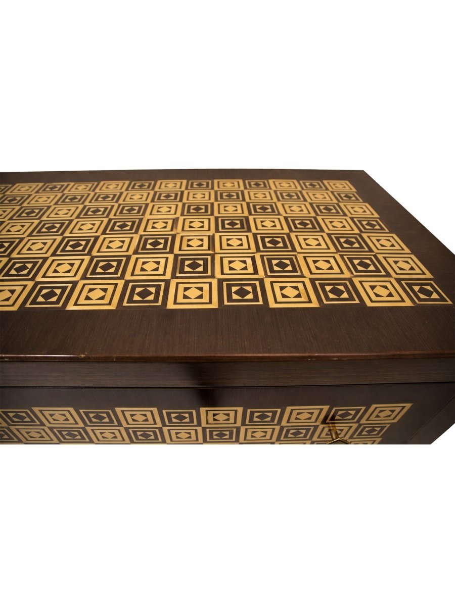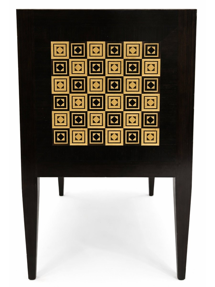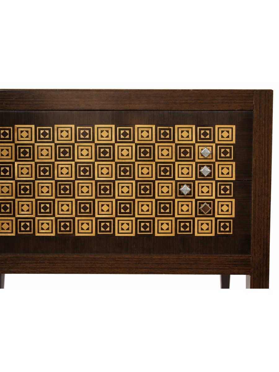 This elegant set of two Italian 2-drawer chests combines classic craftsmanship with striking decorative detail. Each chest is handcrafted in Italy from fine wood and features beautifully inlaid diamond patterns in ivory and brown against a primary black finish. The softly contoured fronts and hand-finished surfaces highlight the natural warmth of the wood while providing visual sophistication.